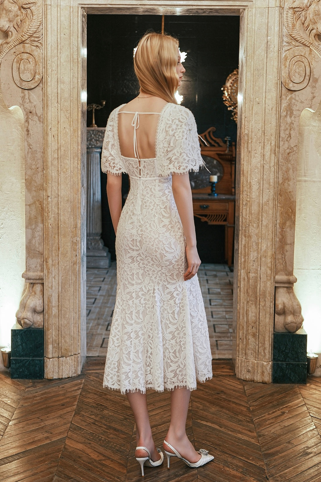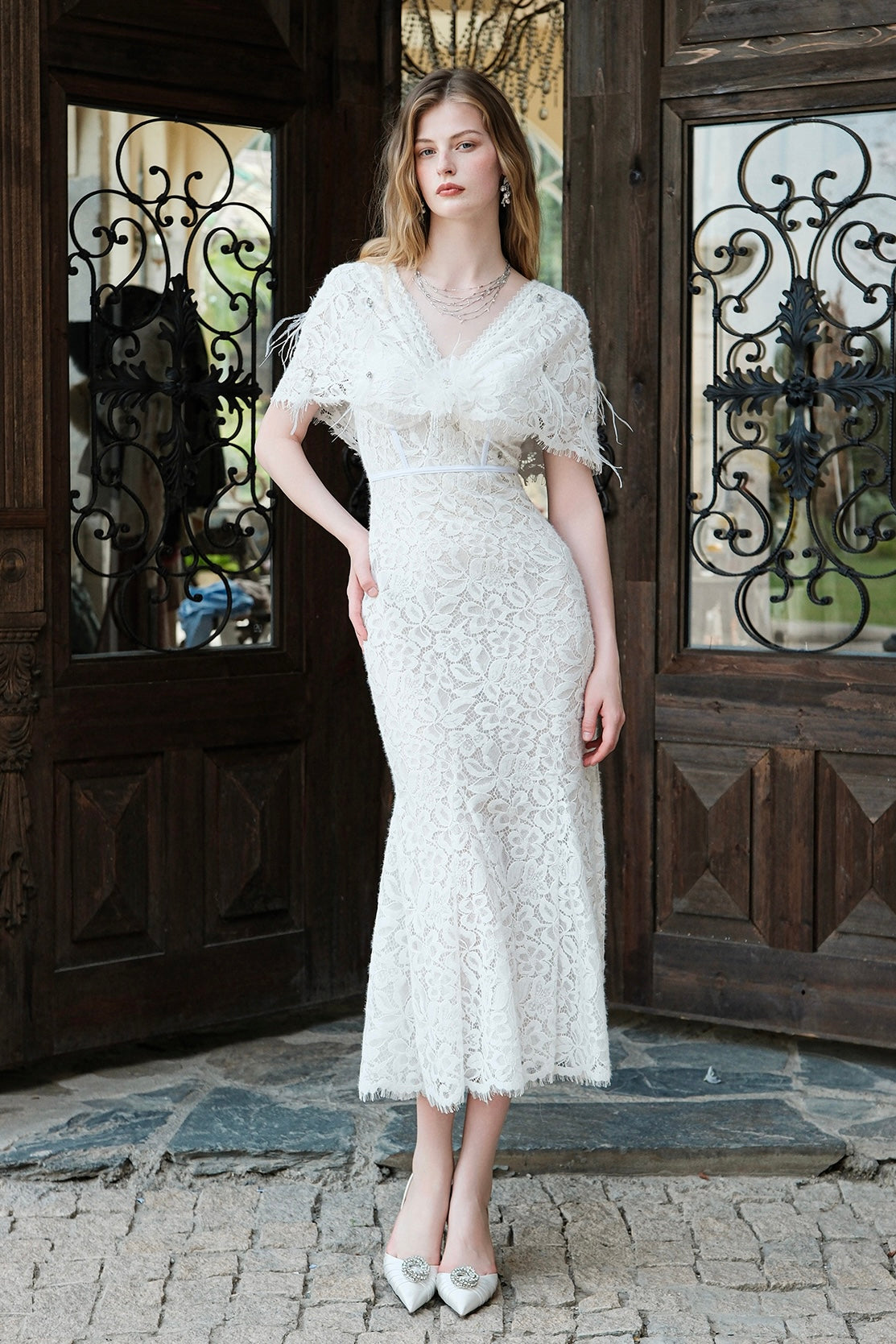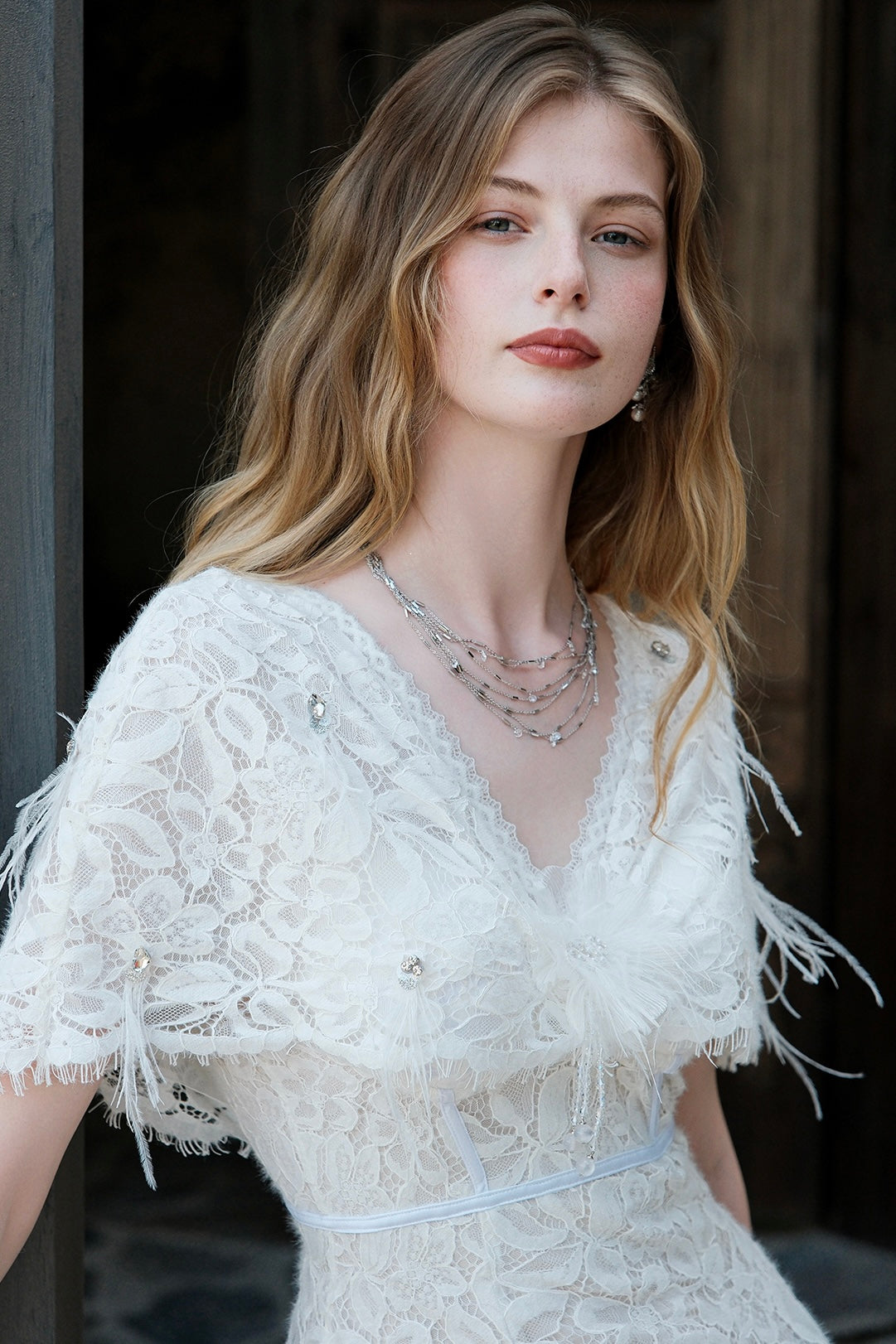 ‘Cynara’ hugs the waist with a slim, curve-skimming cut before unfurling into our signature fishtail hem, and the swish of those godet inserts is pure romance in motion. We trimmed the neckline with a fluttery lace cape – dotted with tiny crystals, wisps of feather fringe, and a 3-D bloom of pearls – so the light catches you from every angle; the cape ties at the back for a dainty finish and can be adjusted just the way you like it.