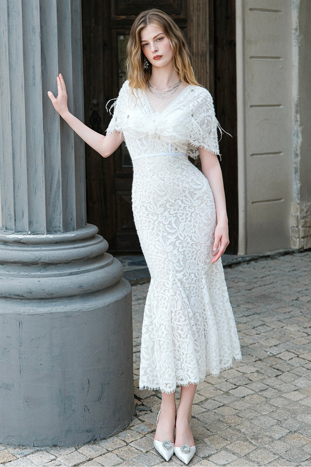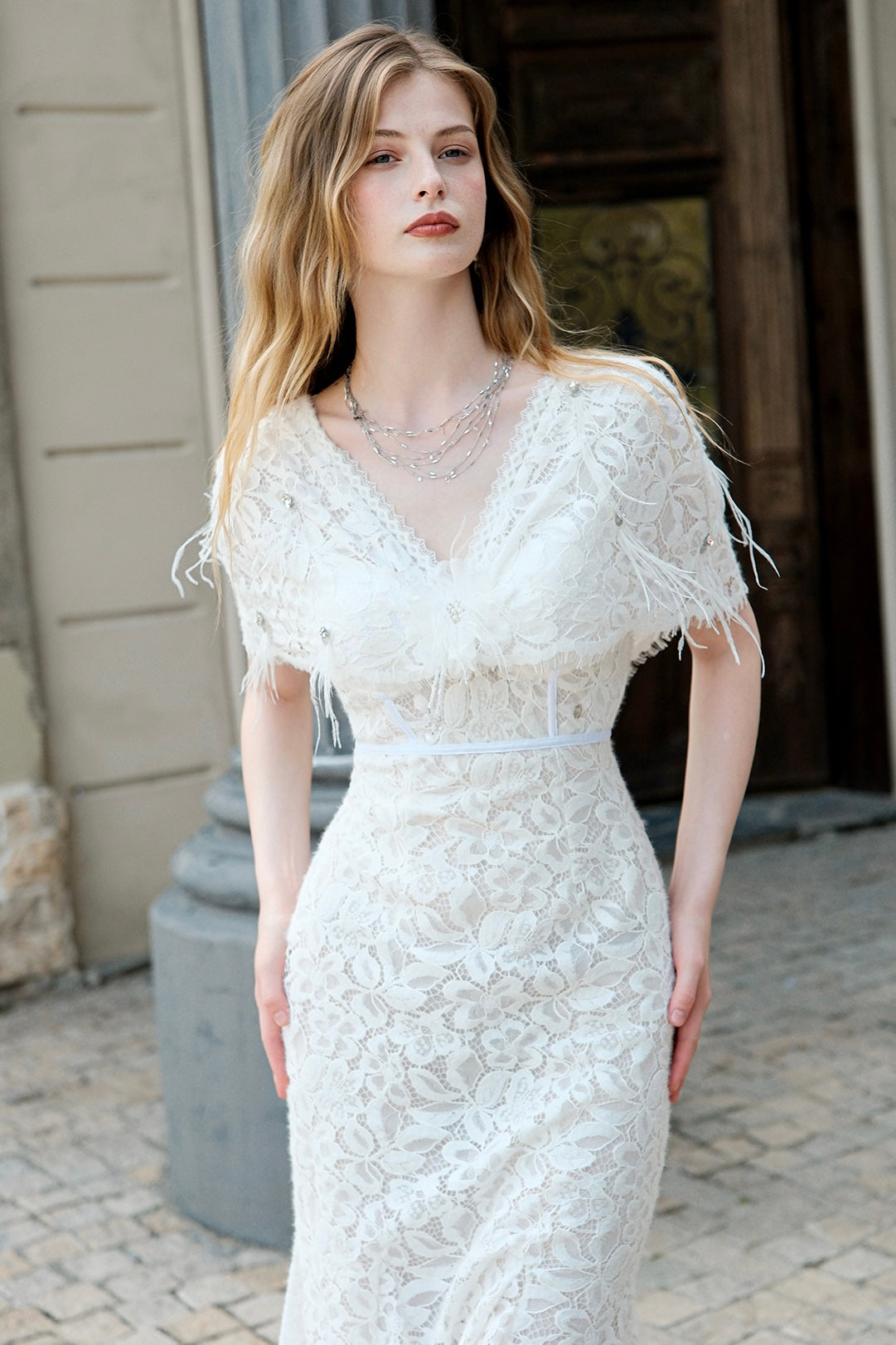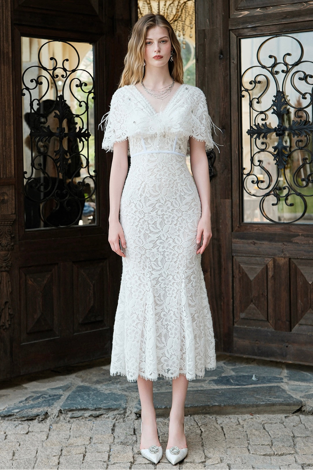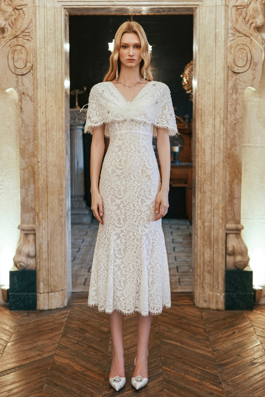 ‘Cynara’ hugs the waist with a slim, curve-skimming cut before unfurling into our signature fishtail hem, and the swish of those godet inserts is pure romance in motion. We trimmed the neckline with a fluttery lace cape – dotted with tiny crystals, wisps of feather fringe, and a 3-D bloom of pearls – so the light catches you from every angle; the cape ties at the back for a dainty finish and can be adjusted just the way you like it.