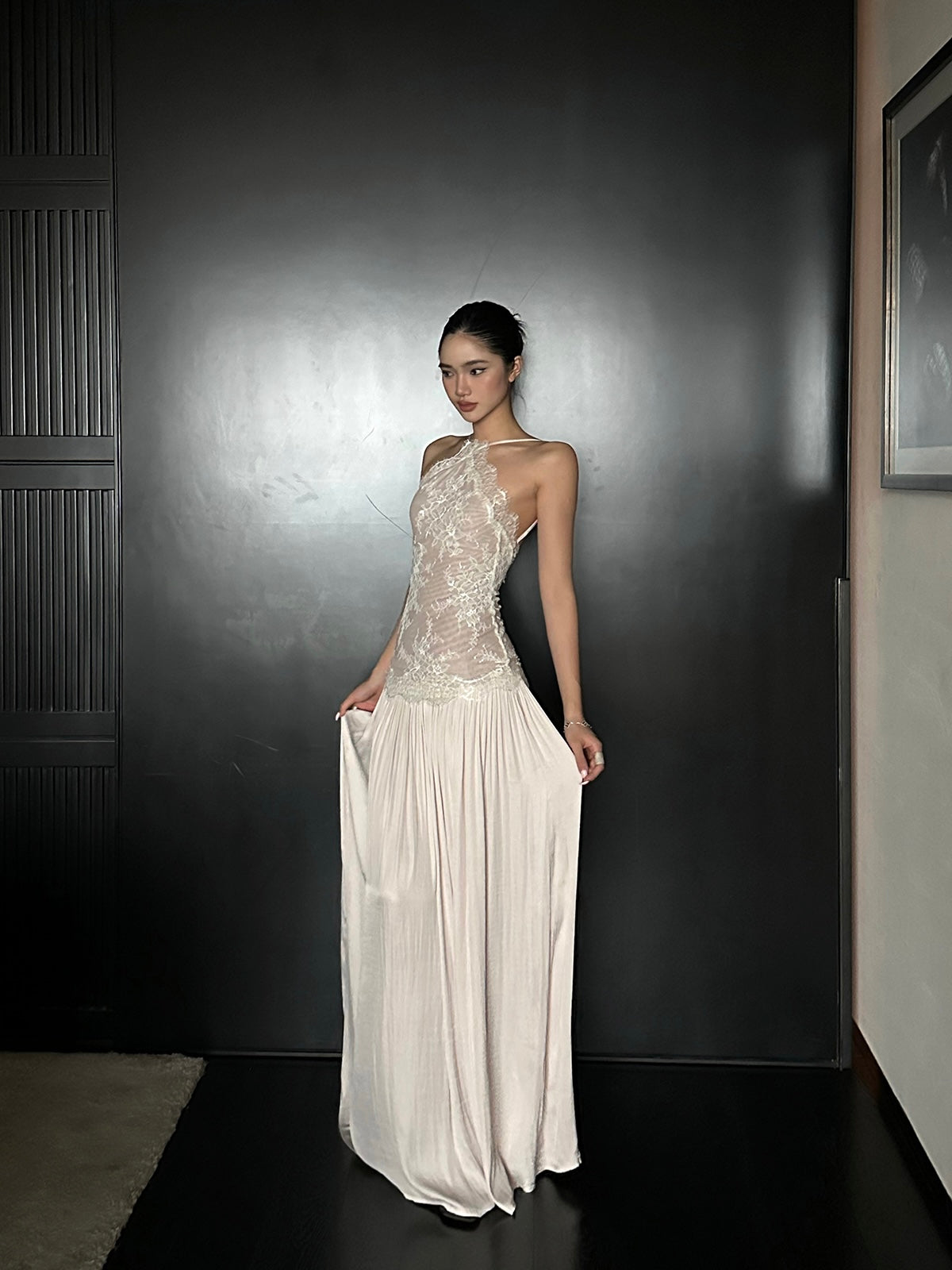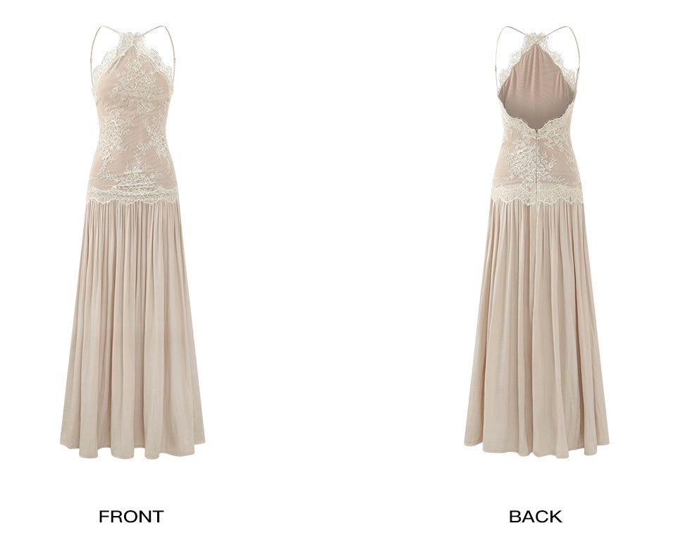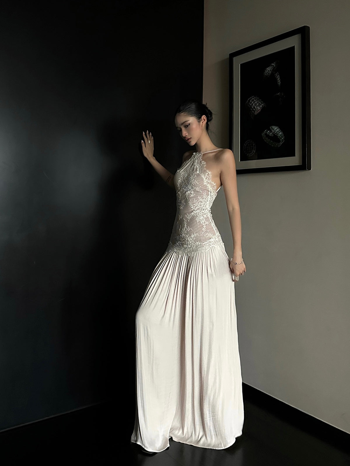 Our delicately sheer halter bodice is traced with couture-style lace appliqué that skims the collarbones, nips the waist, and melts into feather-light pleats for that liquid-silk sway you’ll feel with every step. An internal lining keeps the lace modest yet luminous, while the barely-there straps frame your shoulders with just-enough allure and sweep into a low, sculpted back that shows off elegant butterfly-bone contours.
