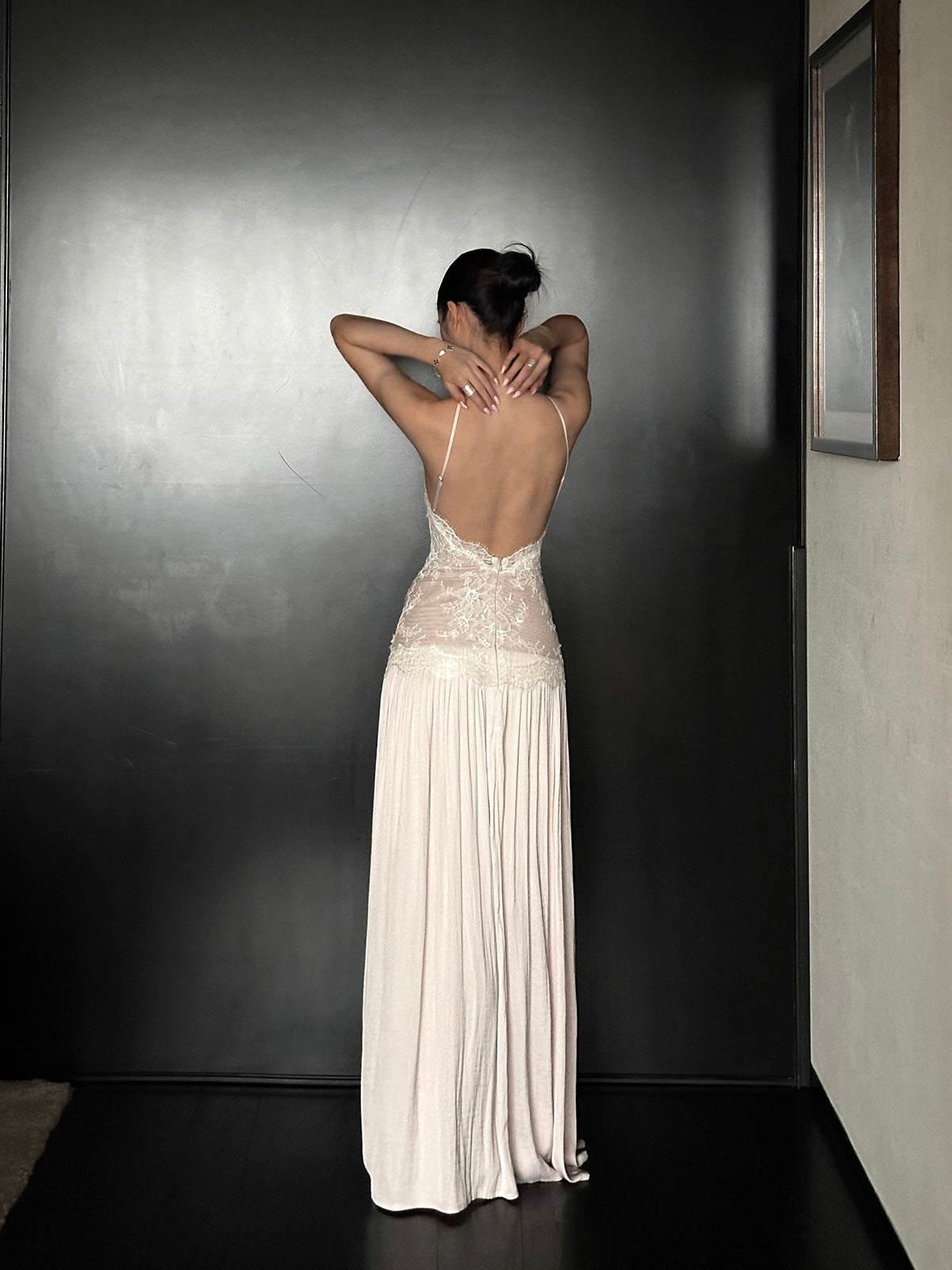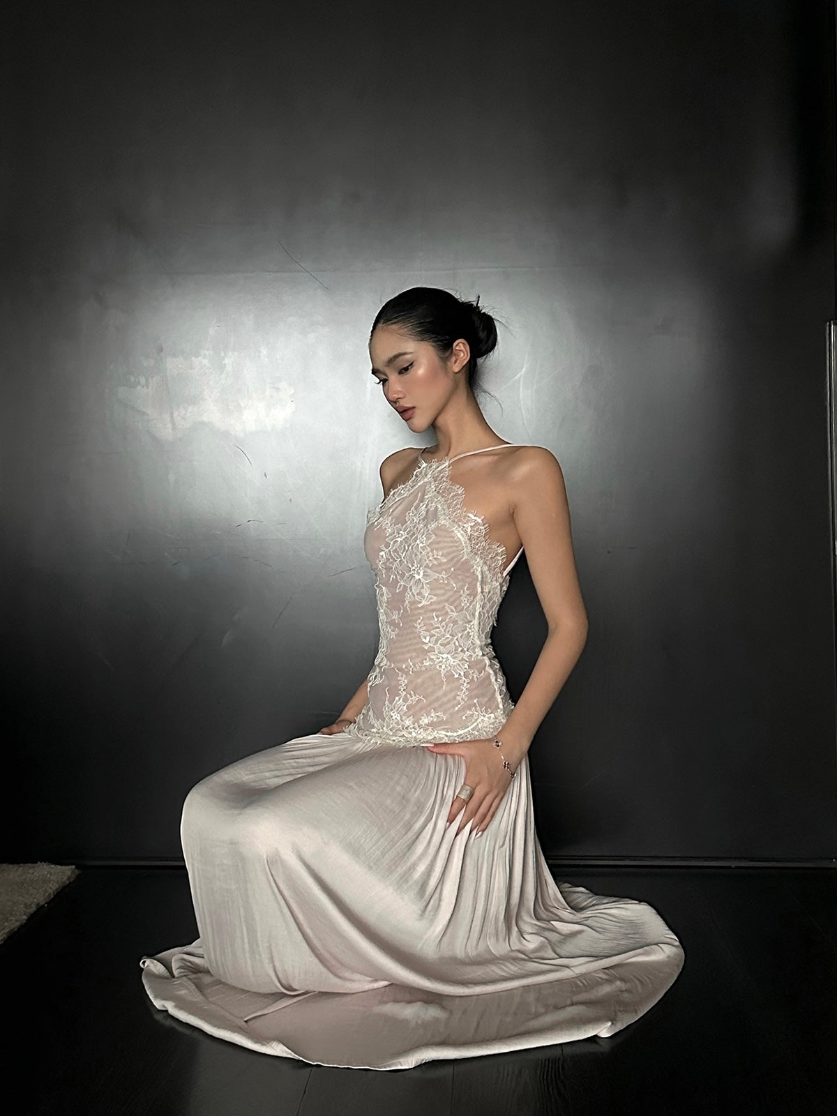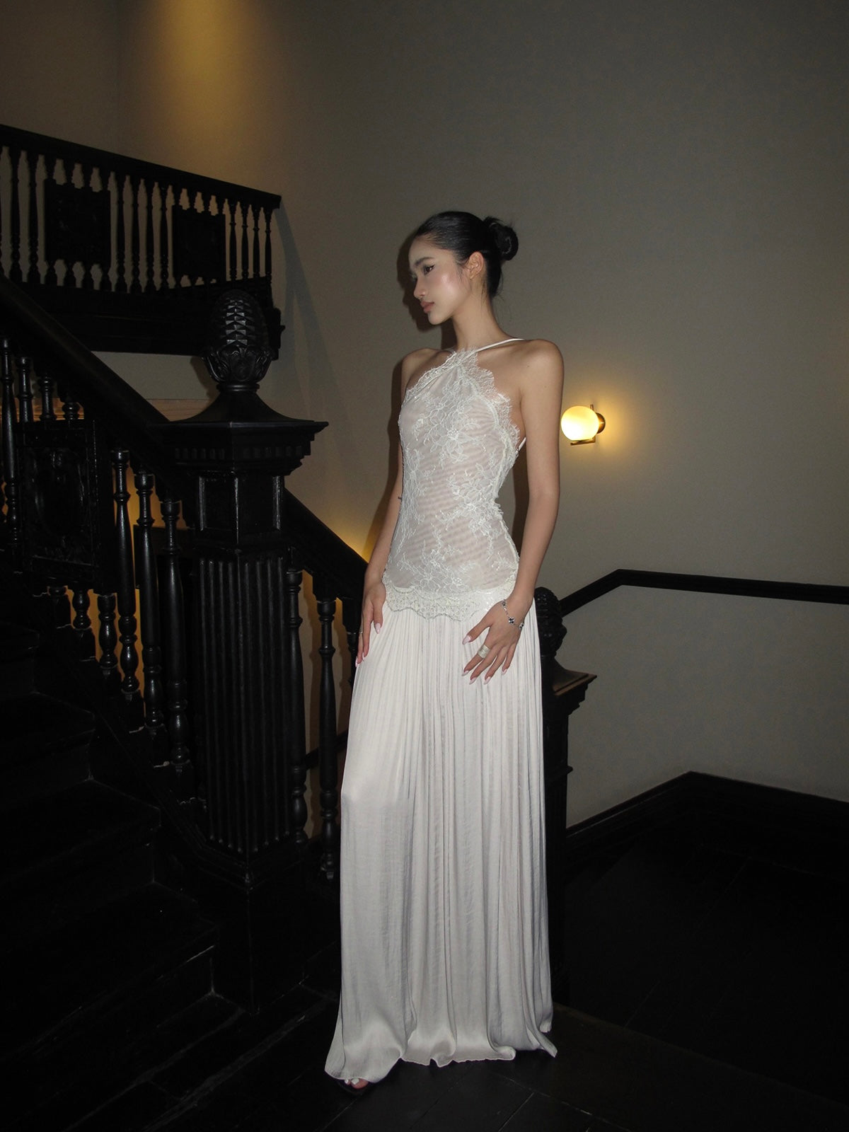 Our delicately sheer halter bodice is traced with couture-style lace appliqué that skims the collarbones, nips the waist, and melts into feather-light pleats for that liquid-silk sway you’ll feel with every step. An internal lining keeps the lace modest yet luminous, while the barely-there straps frame your shoulders with just-enough allure and sweep into a low, sculpted back that shows off elegant butterfly-bone contours.