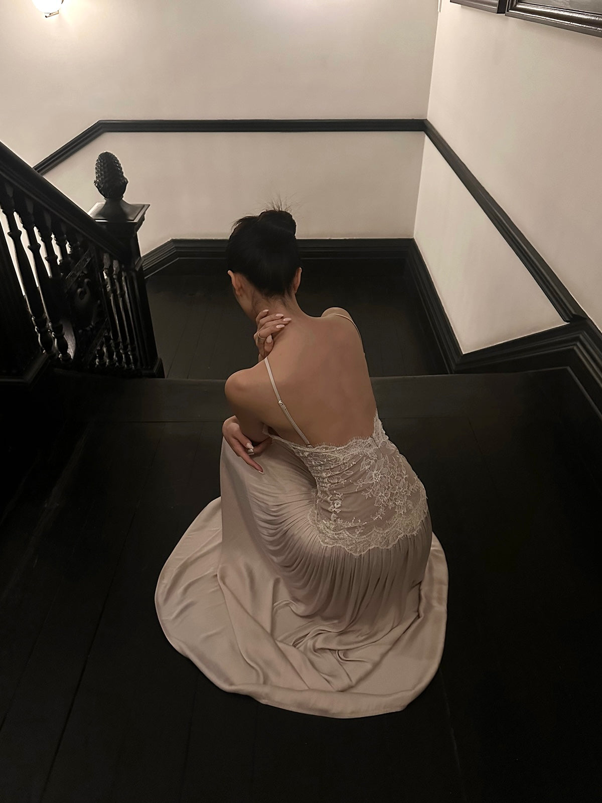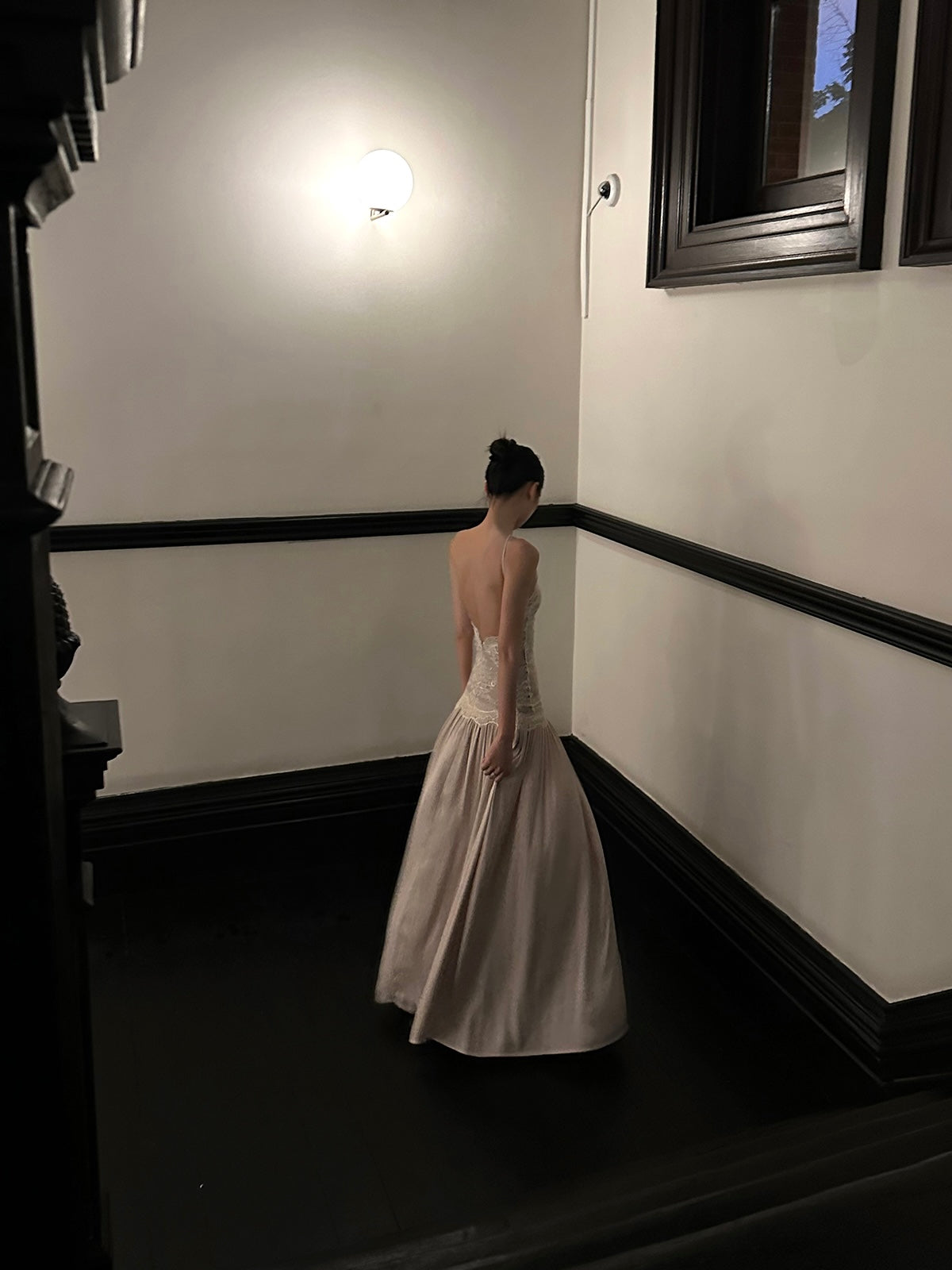 We’ve finished ‘Elysian Pearl-Kiss’ with a hidden centre-back zip for the smoothest slip-on fit, soft draping that elongates the legs, and a silhouette that glides rather than clings – because effortless drama is our favourite kind. Candle-lit gala, rooftop soirée, or that once-in-a-lifetime photo op? You already know the answer.
