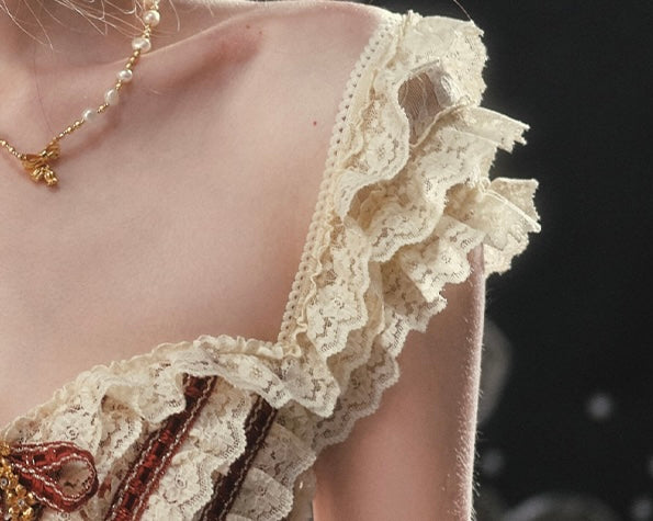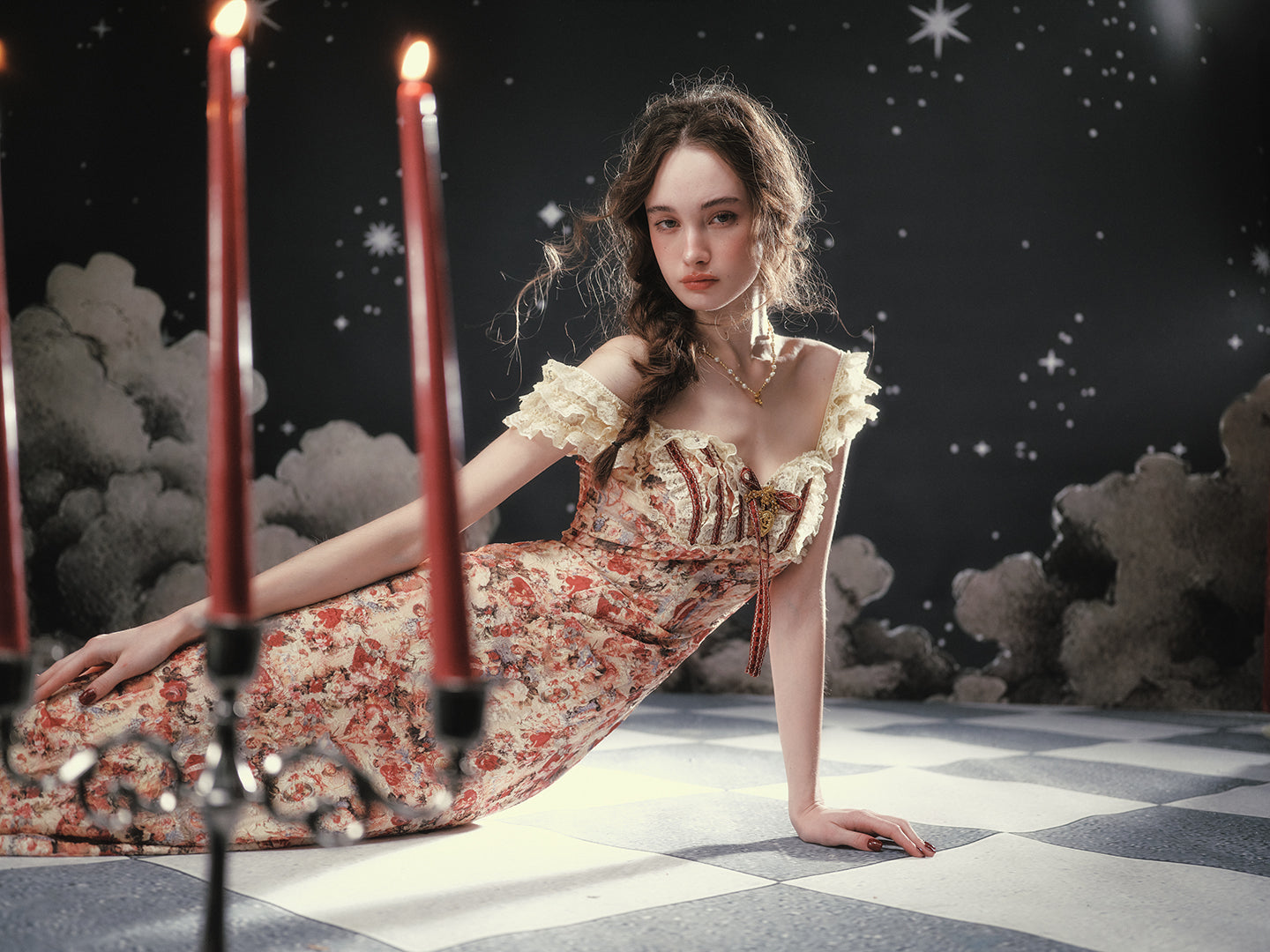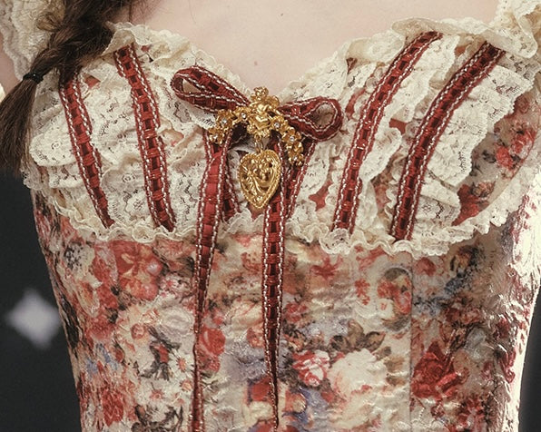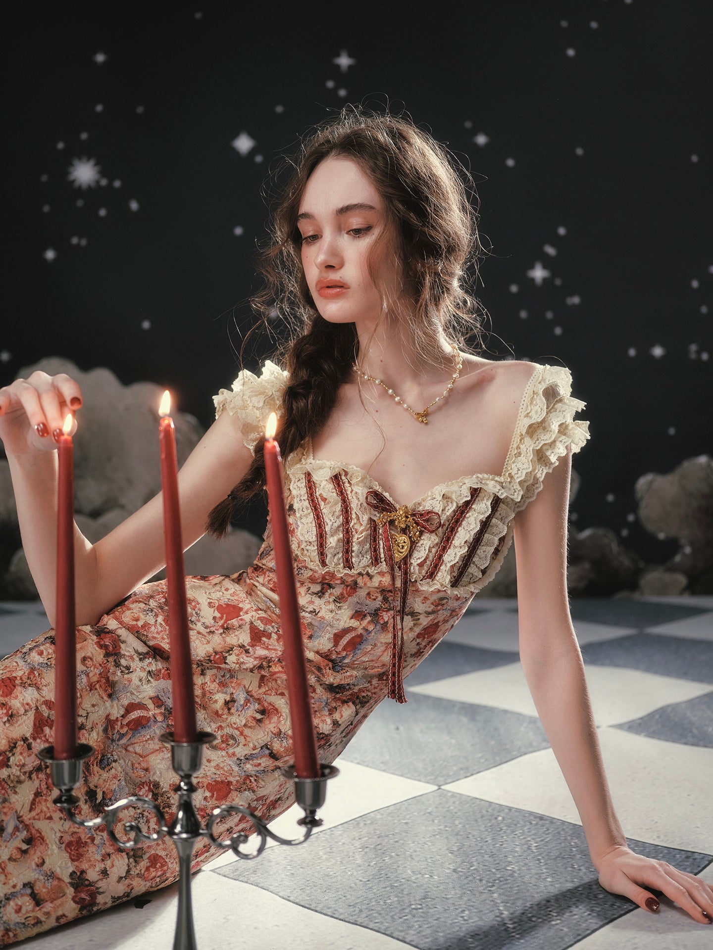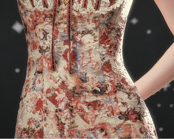 Romantic trouble never looked so sweet, ‘Fallen Cupid’ slips on like a vintage postcard, all faded florals, corseted curves, and a swish of fishtail flair. We printed painterly cherubs and roses onto pearl-sheen brocade, then trimmed the sweetheart bodice with tiers of creamy lace and slim wine-red ribbons for that spoiled-heiress touch. Hidden boning sculpts a waspish waist, while a neat front zip keeps things easy; the back flows smoothly to a gentle mermaid hem that skims rather than clings, letting you stride (or sashay) with complete confidence.