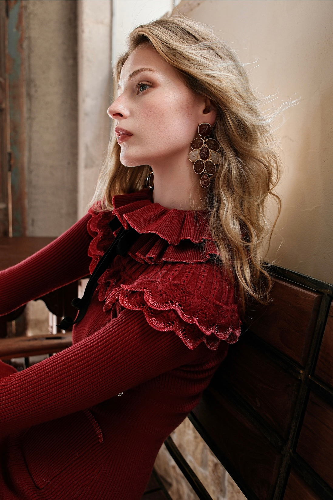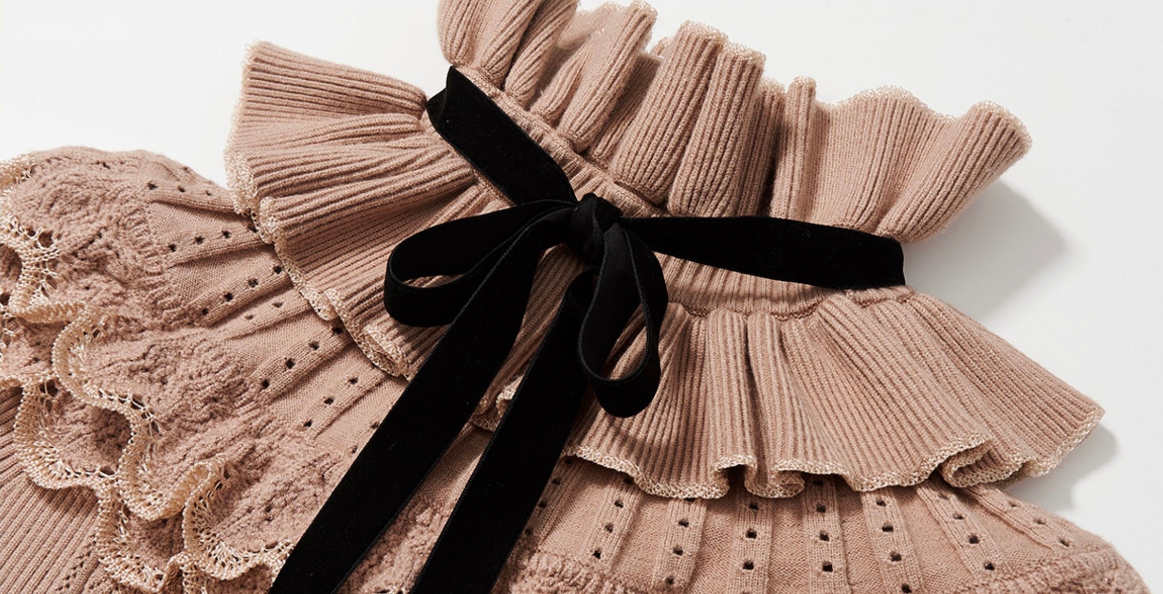 The neckline steals the spotlight first: a high, lettuce-edged collar framed by two tiers of scallop-cut lace and finished with a velvet bow you can tie just so. Think Victorian poetry, but make it modern.