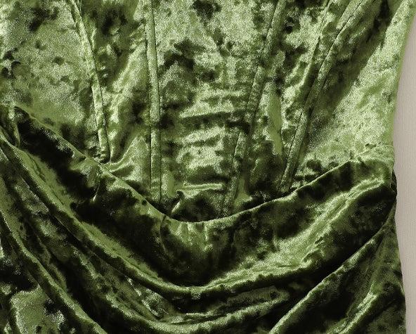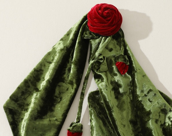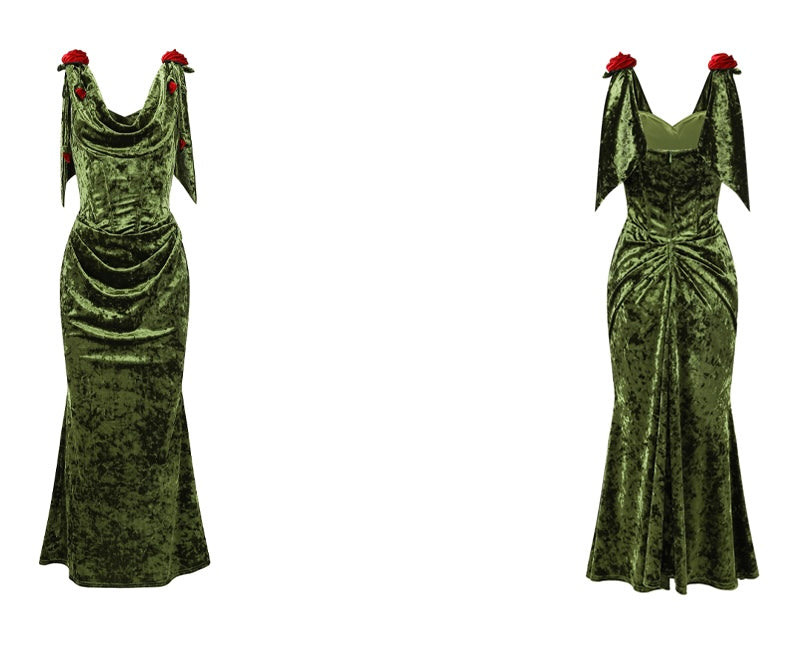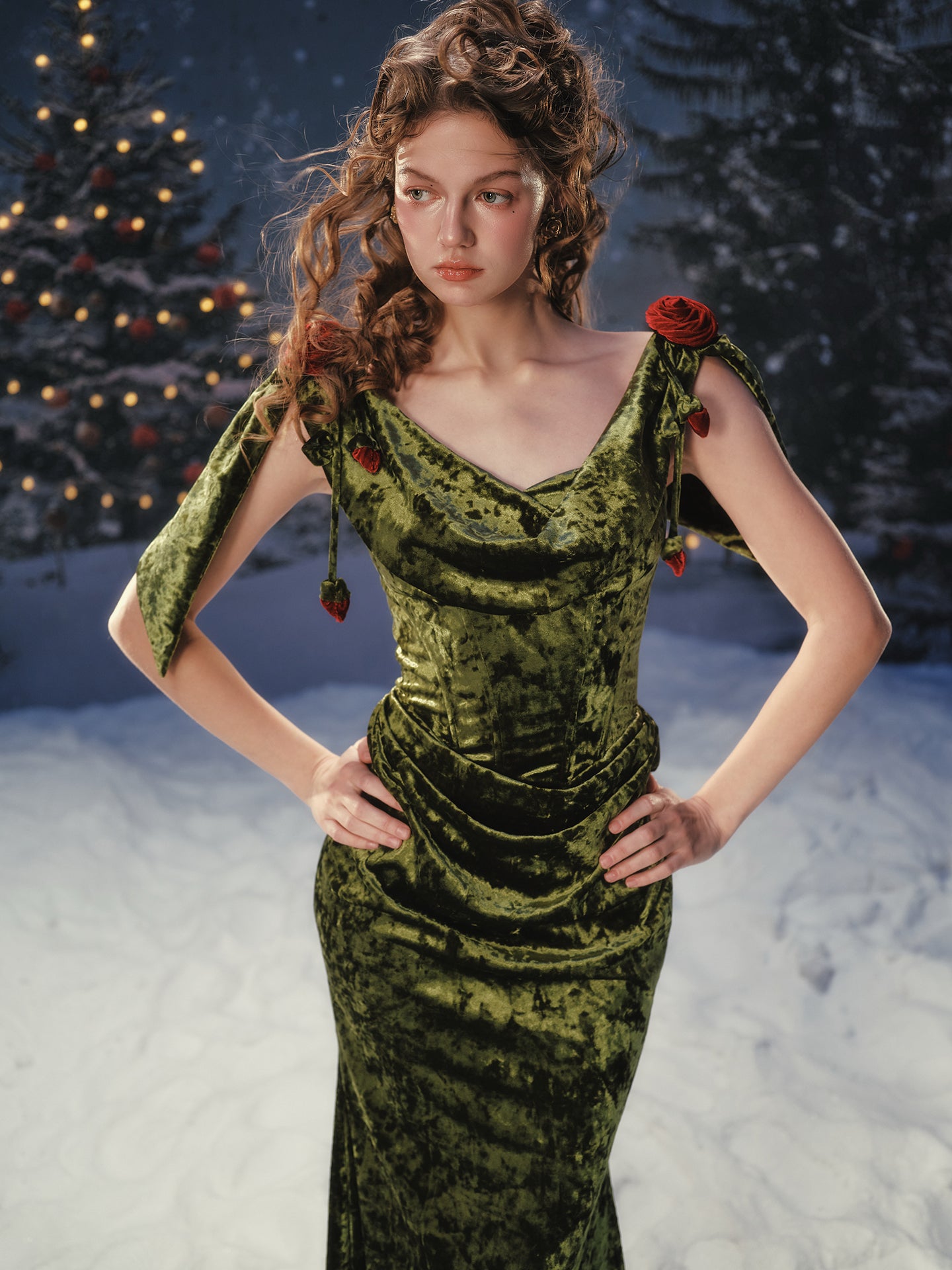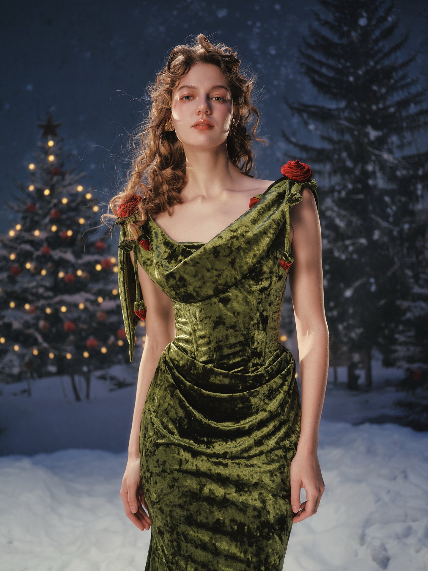 Our lush forest-green velvet drapes into a soft cowl neckline, then trails into shoulder ties topped with sculpted rose appliqués – sweet little blooms that flirt with every turn. We stitched our signature fishbone boning through the waist, so the bodice feels gently sculpted while you stay comfortable enough for an extra slice of yule-log (go on, you deserve it).