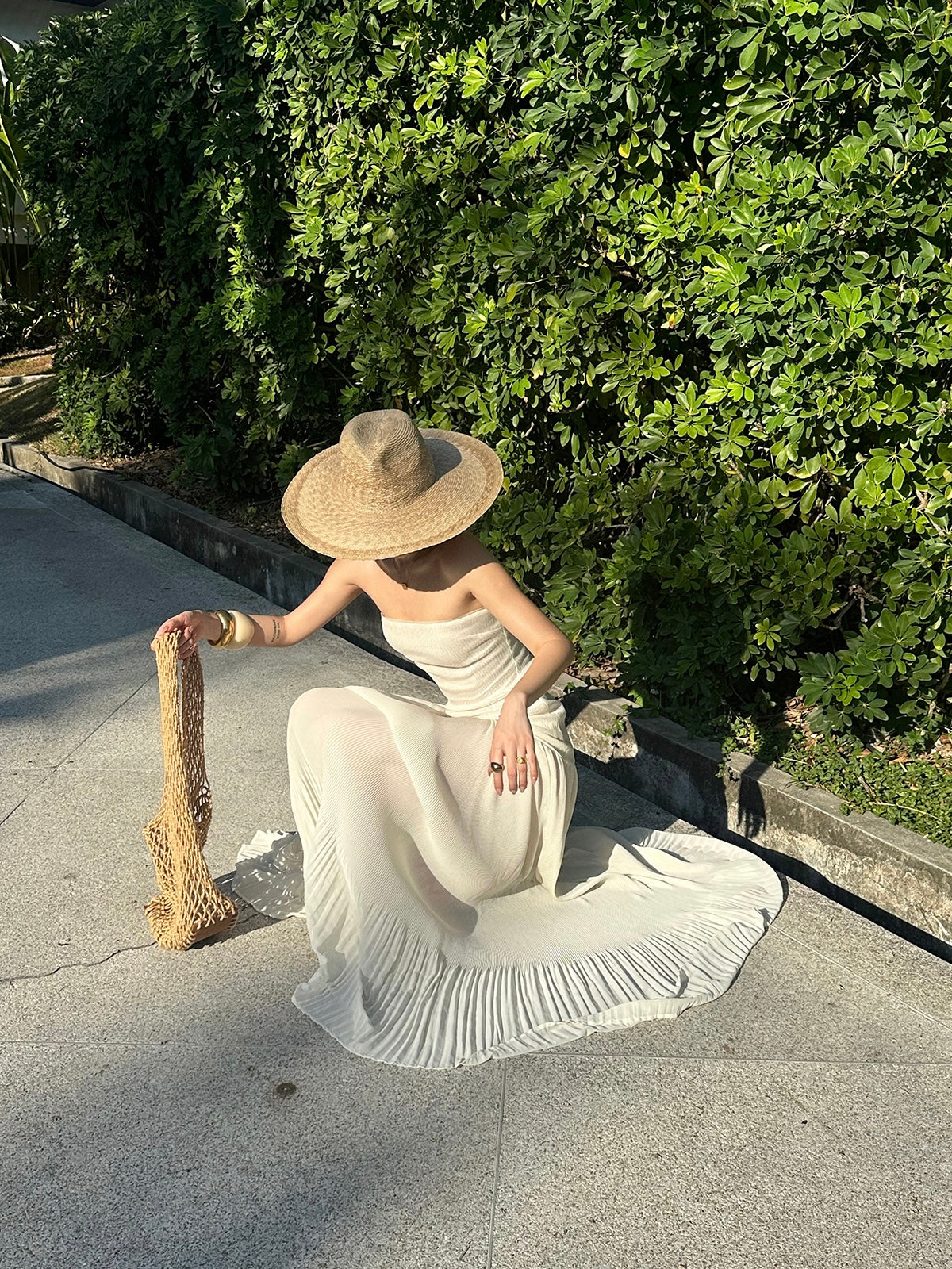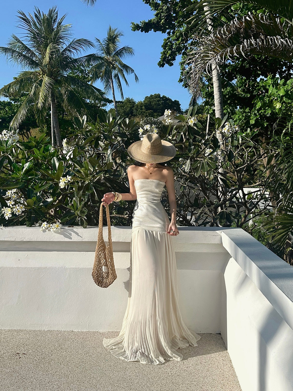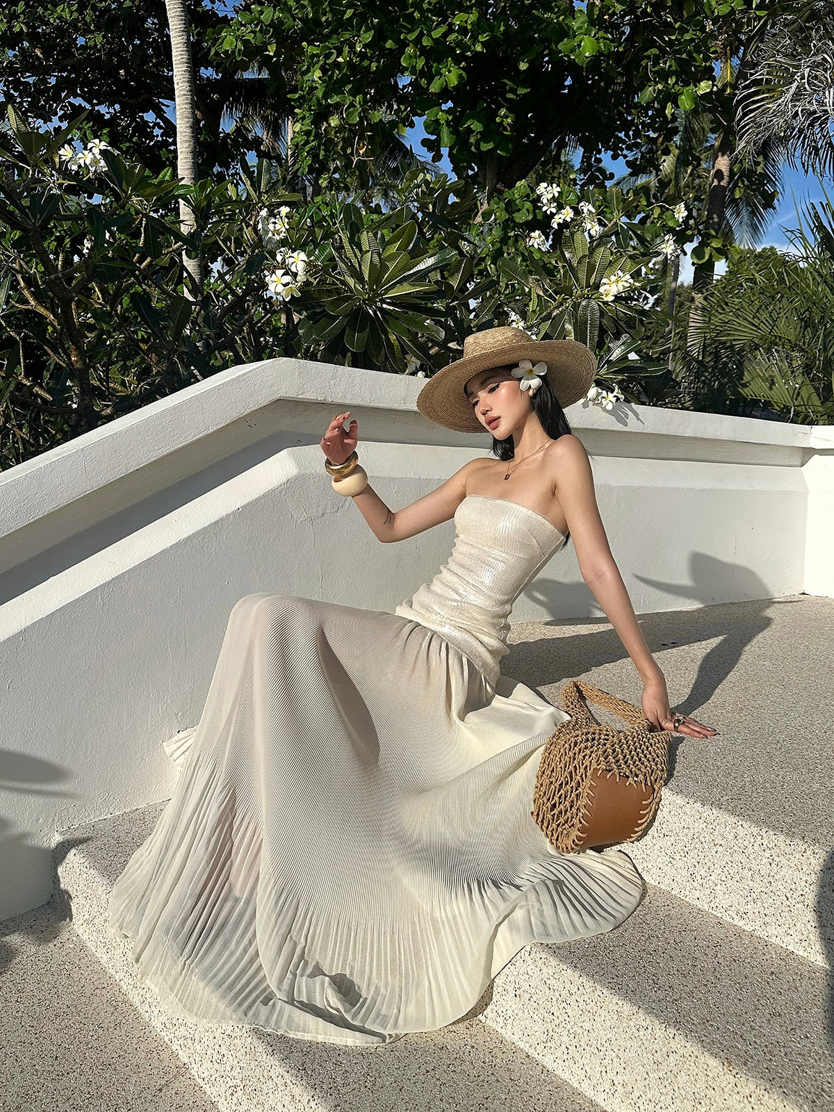 The straight-across, strapless neckline shows off shoulders and collarbones, while a lightly nipped waist follows your curves without feeling tight. We framed the skirt with generous swathes of pleated tulle that drift and ripple as you walk, adding airy movement that feels almost like a sea breeze.