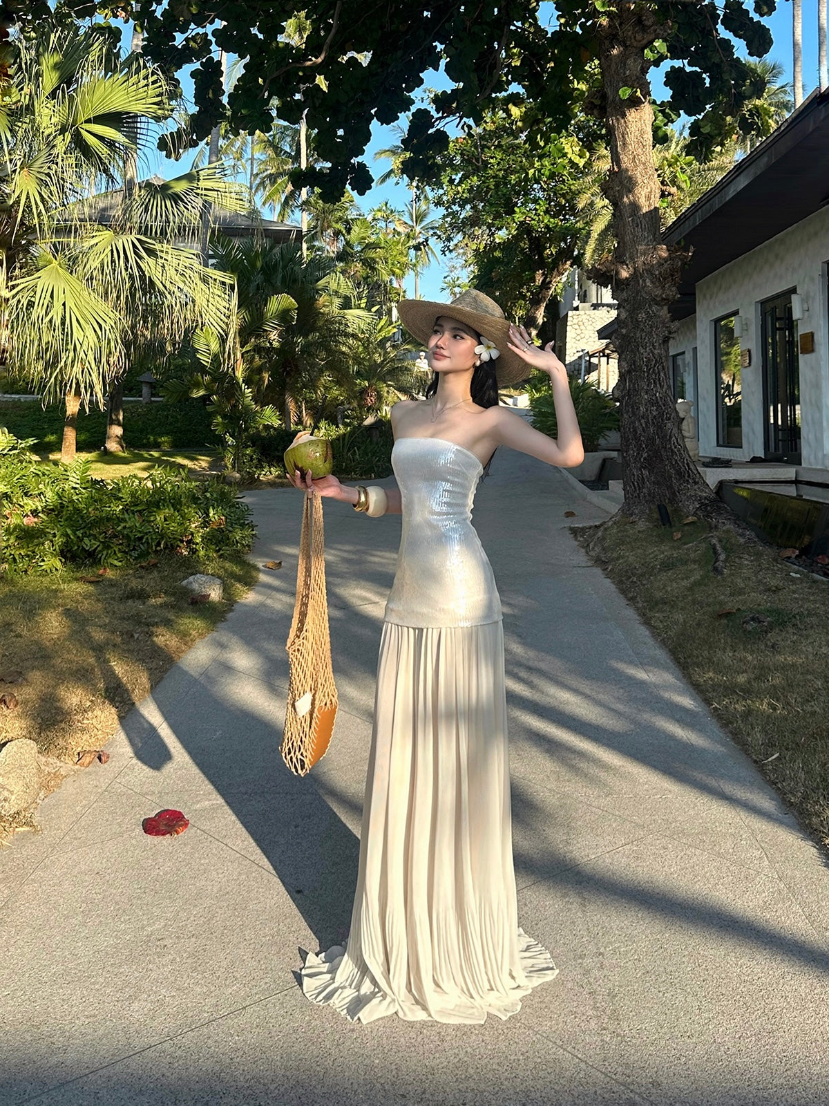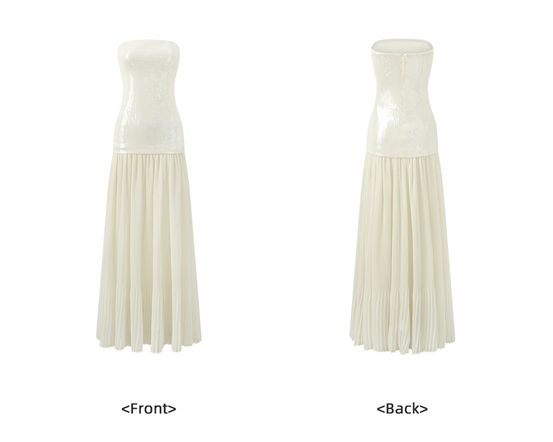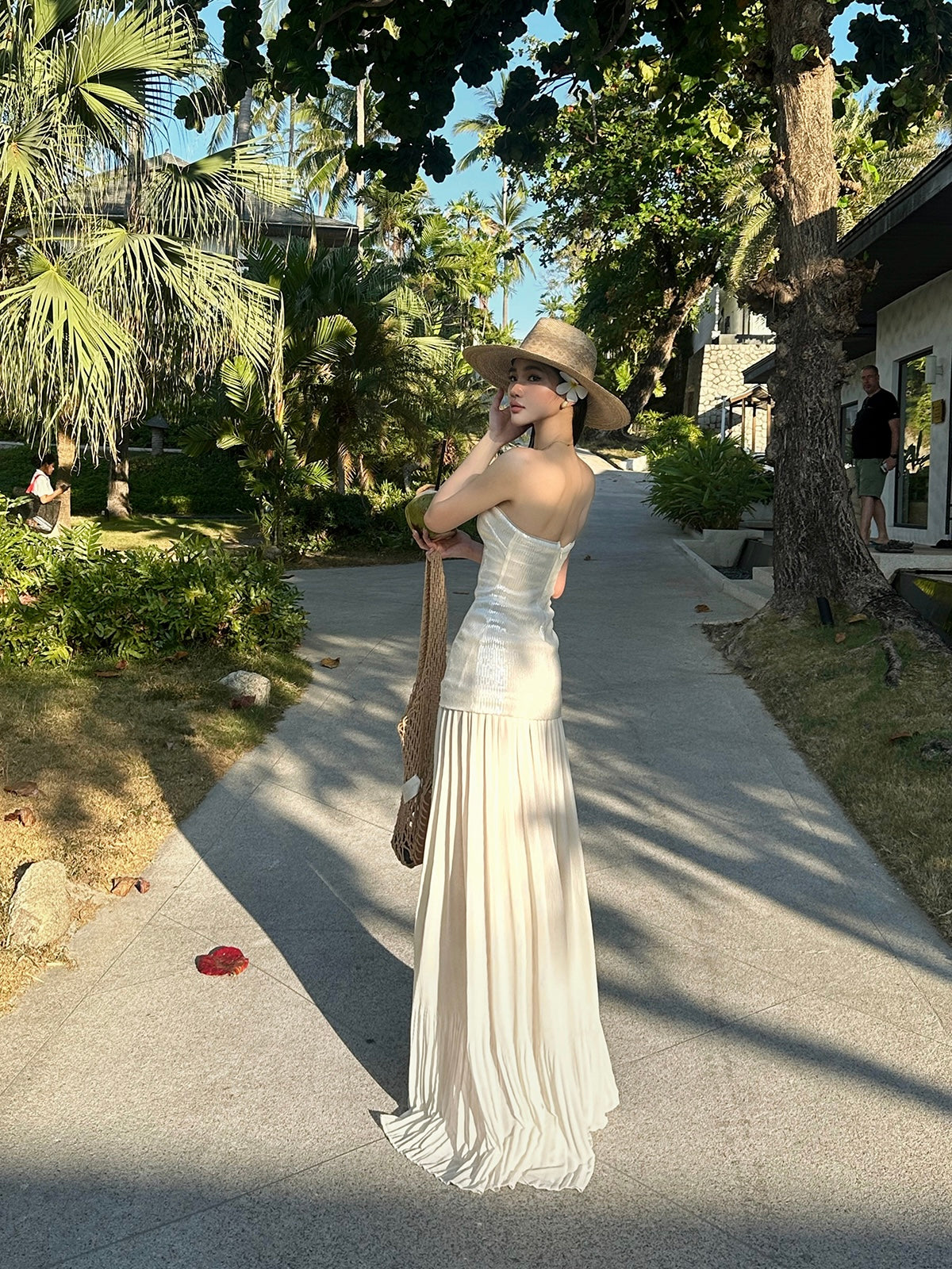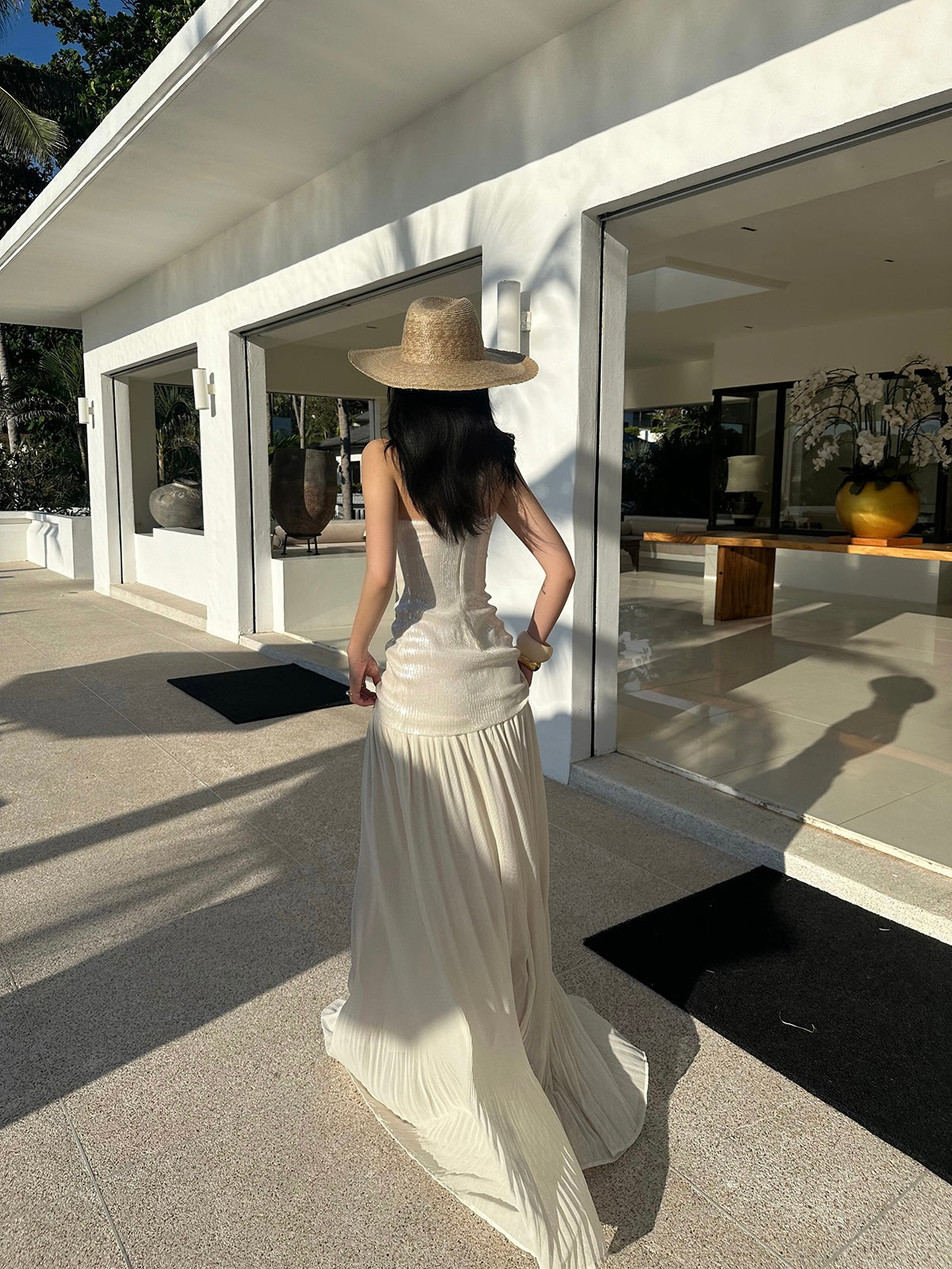 The straight-across, strapless neckline shows off shoulders and collarbones, while a lightly nipped waist follows your curves without feeling tight. We framed the skirt with generous swathes of pleated tulle that drift and ripple as you walk, adding airy movement that feels almost like a sea breeze.