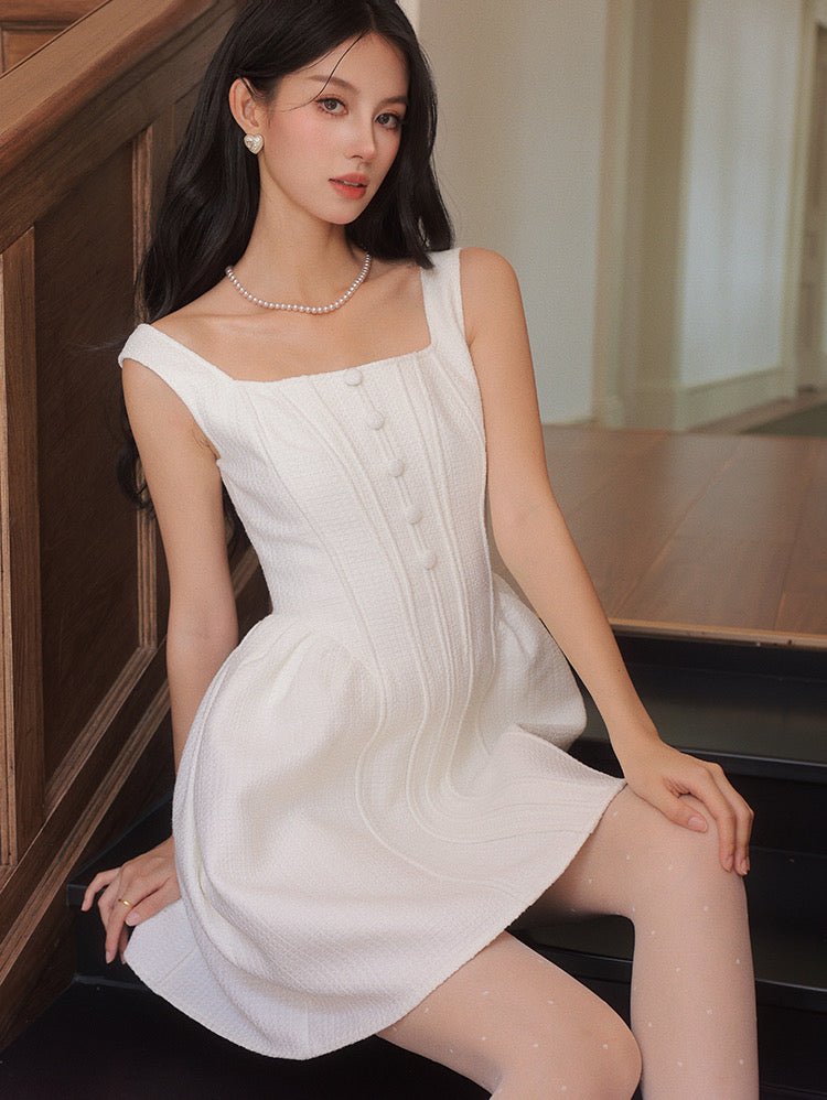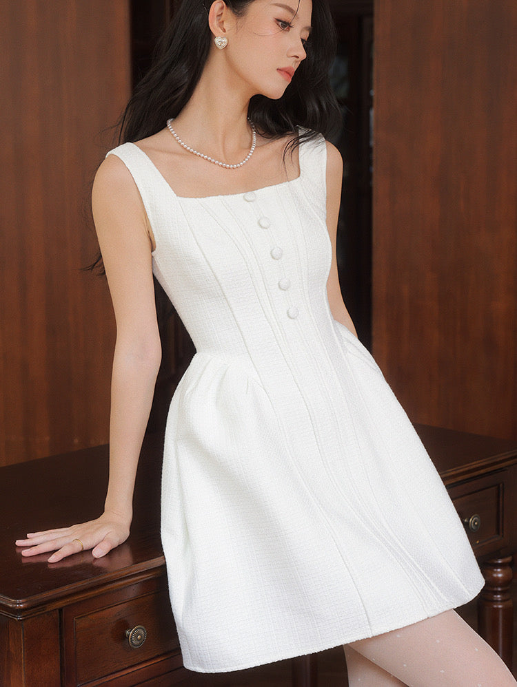 The Vinia dress blends classic charm with a fresh, modern twist. Its elegant square neckline pairs perfectly with delicate fabric-covered buttons for a refined, feminine touch. We’ve added fine cotton padding at key seams to shape and hold structure—yes, the silhouette stays sharp without feeling stiff.