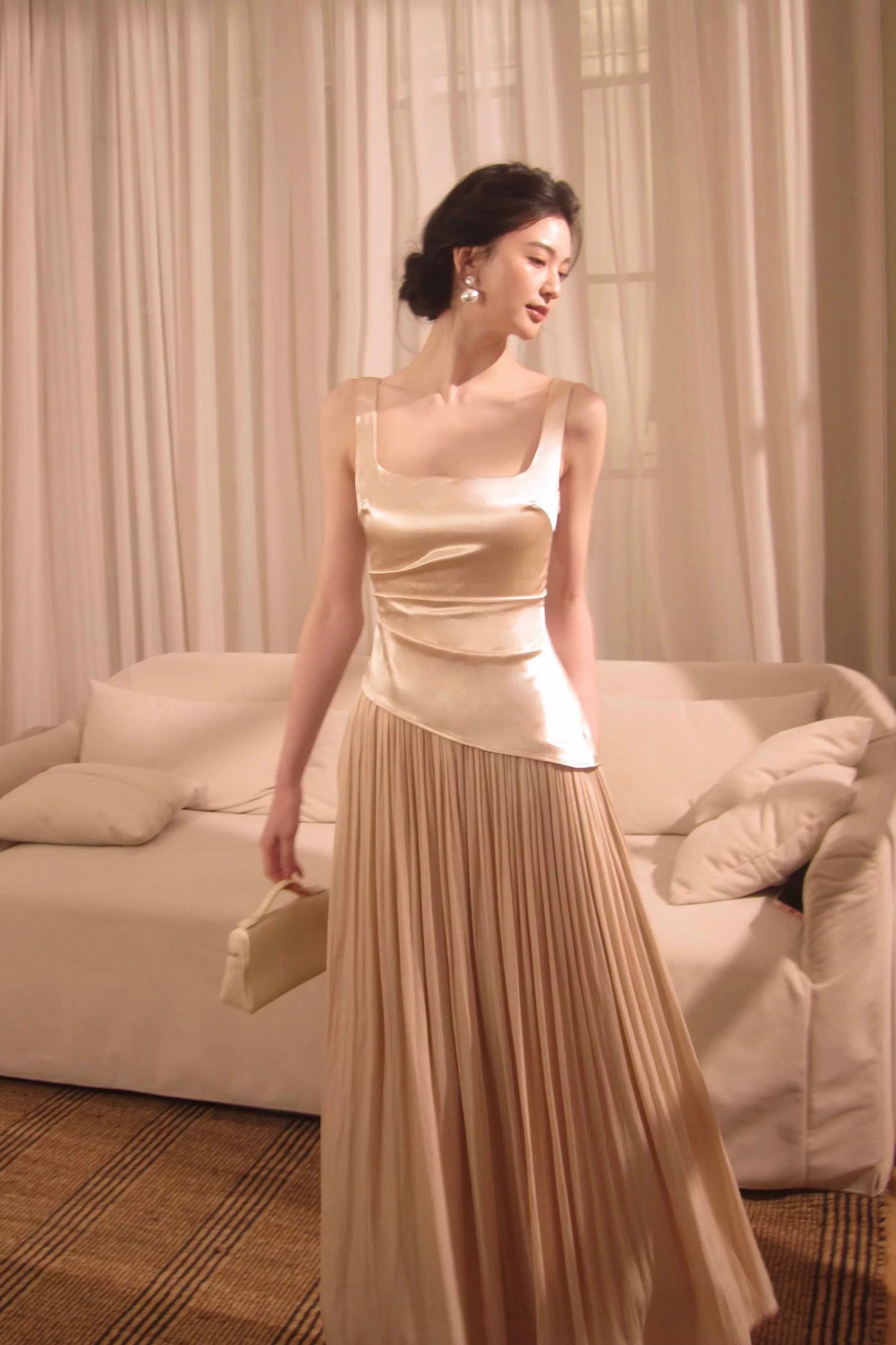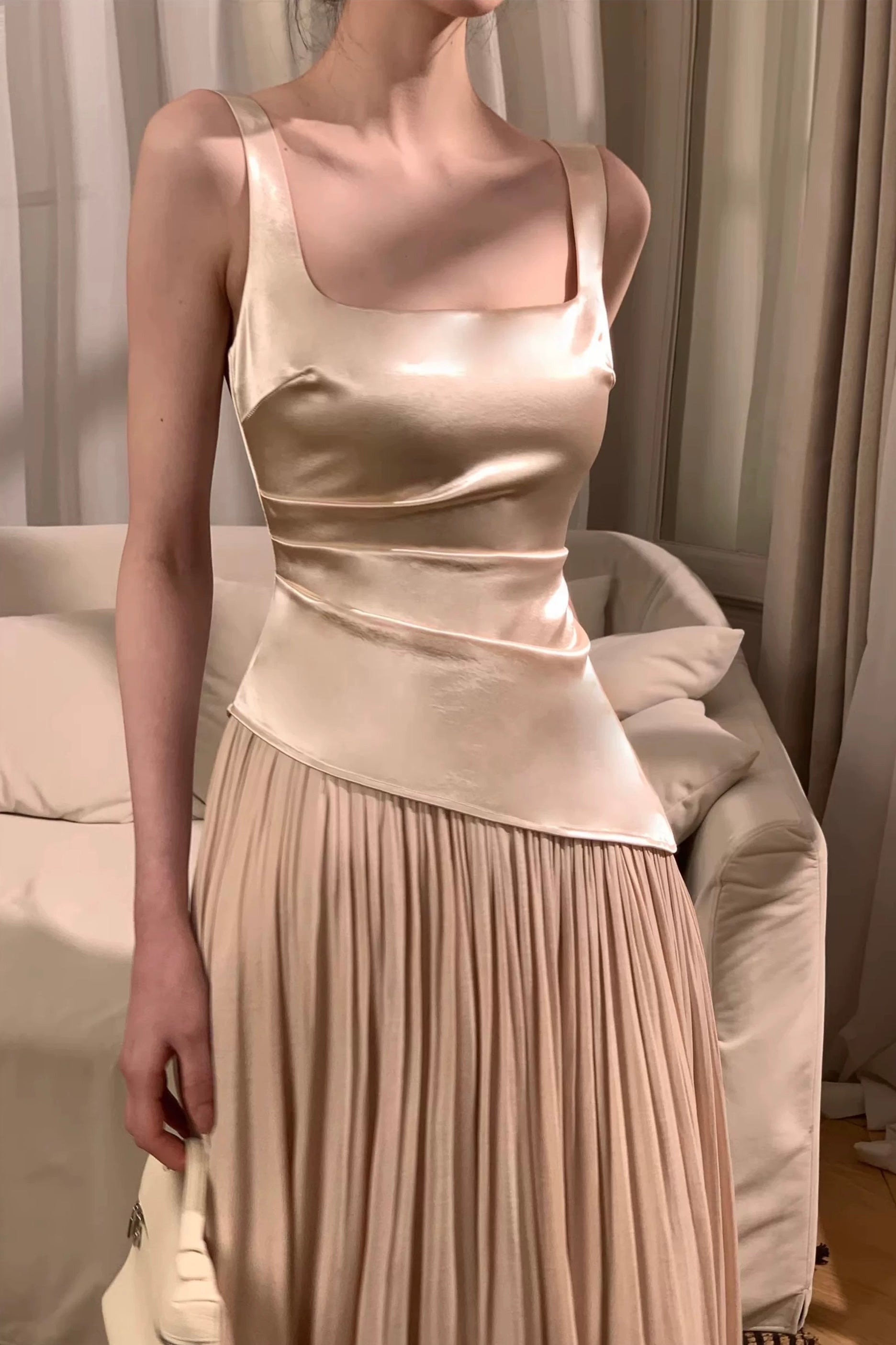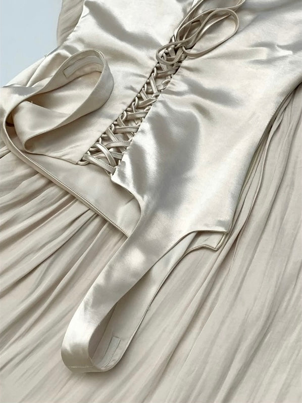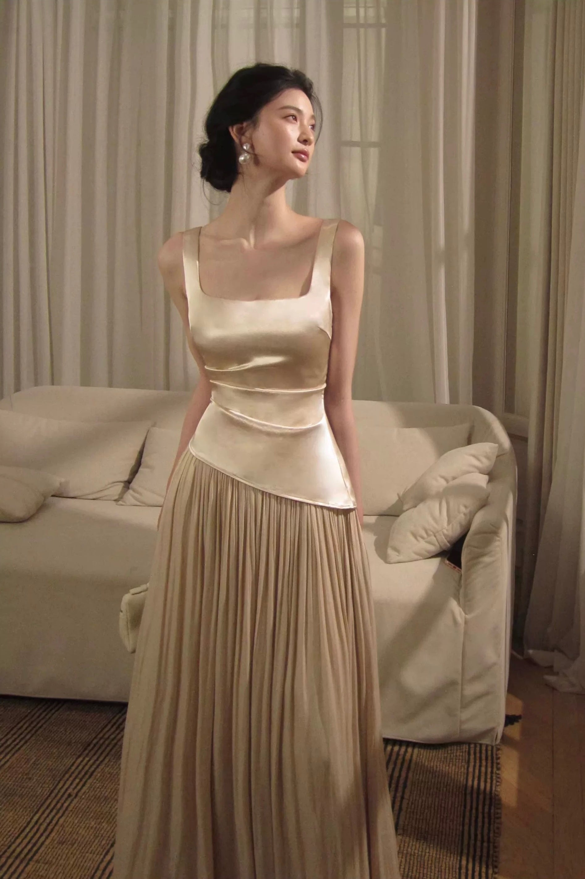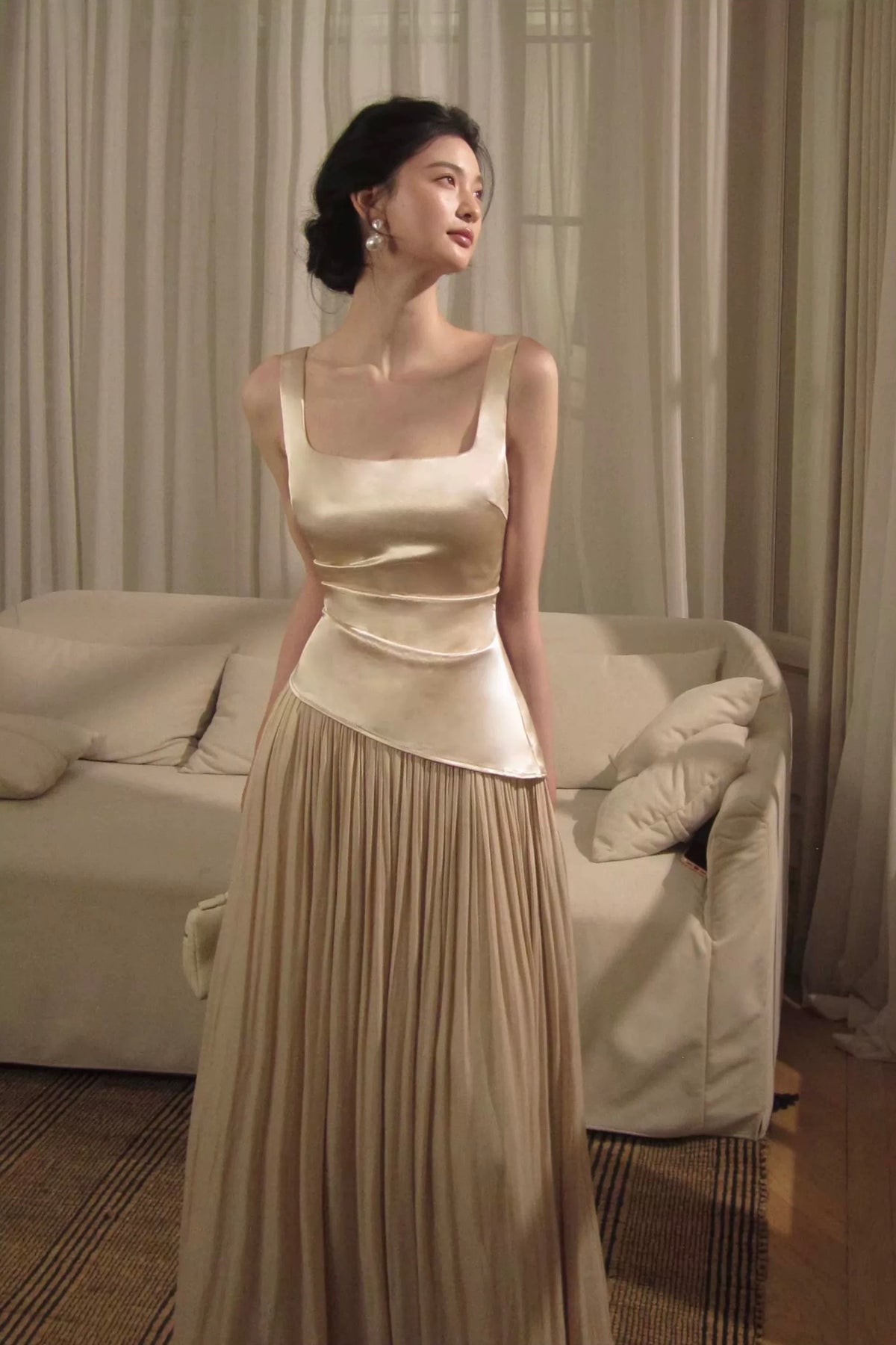 We love the wide straps and square neckline for how they frame the collarbone and slim the shoulder line, while the one-sided ruching from underbust to waist shapes you in without feeling tight. You can adjust the lace-up back to fit just right, with a hint of vintage allure. The satin bodice meets the skirt in a subtle diagonal seam, then falls into an easy A-line that skims to the ankle and sways as you walk.