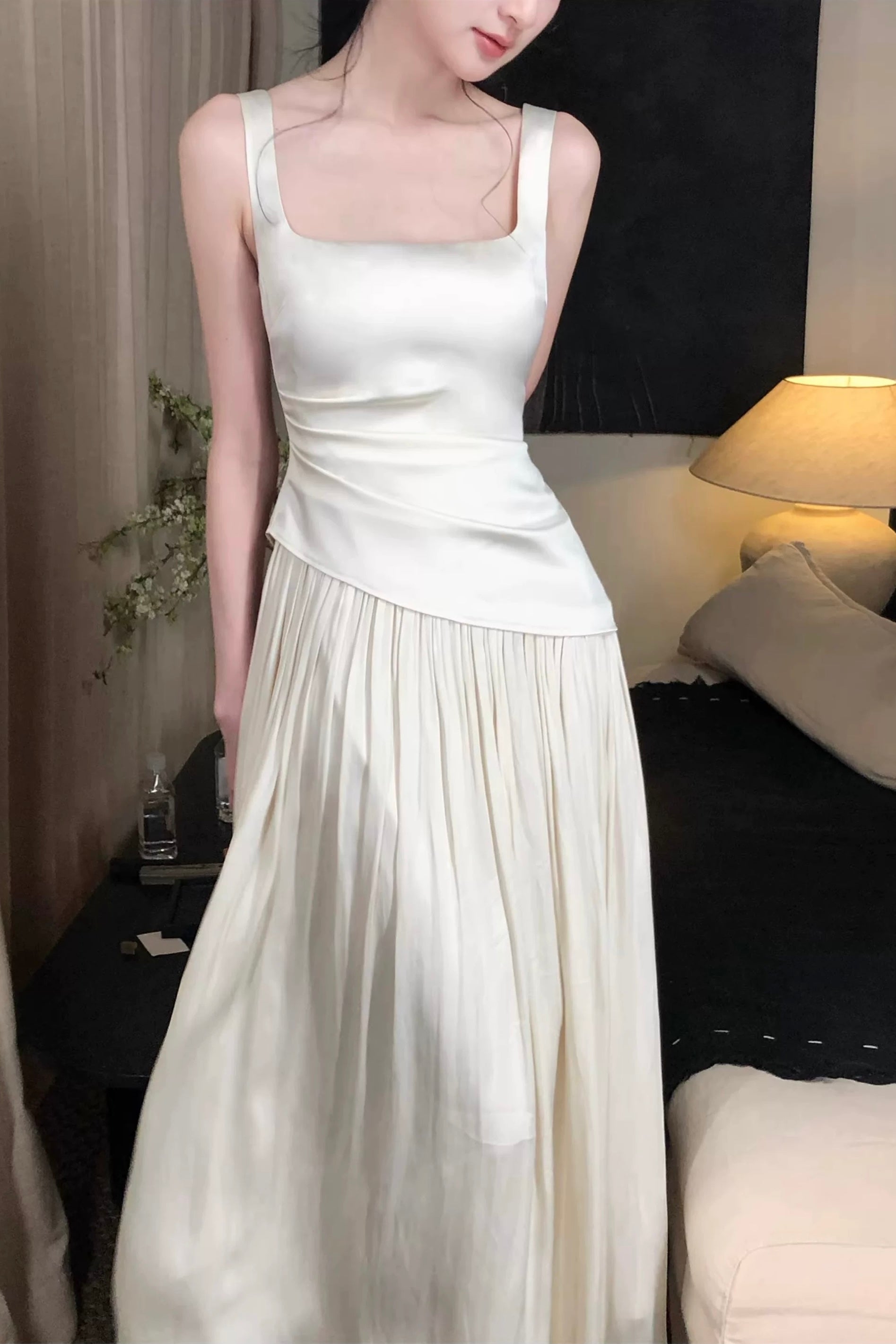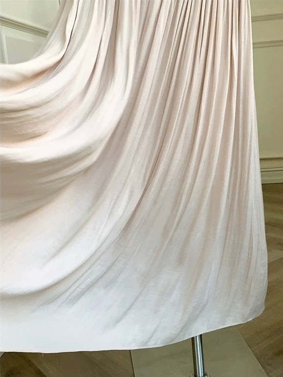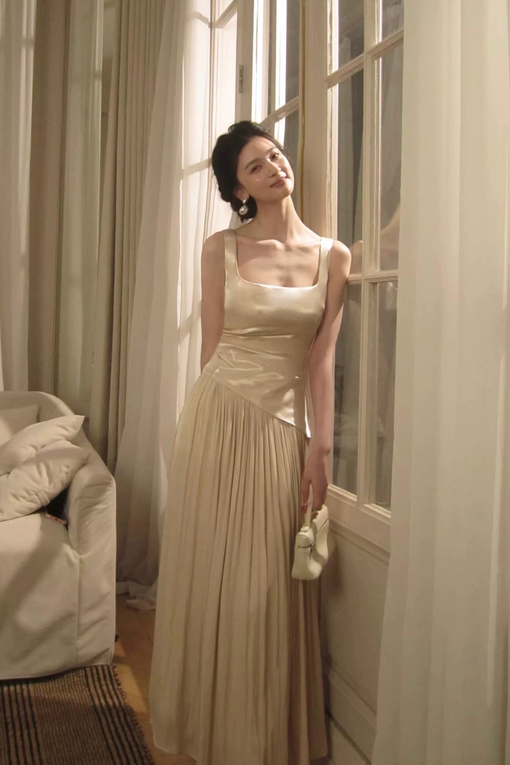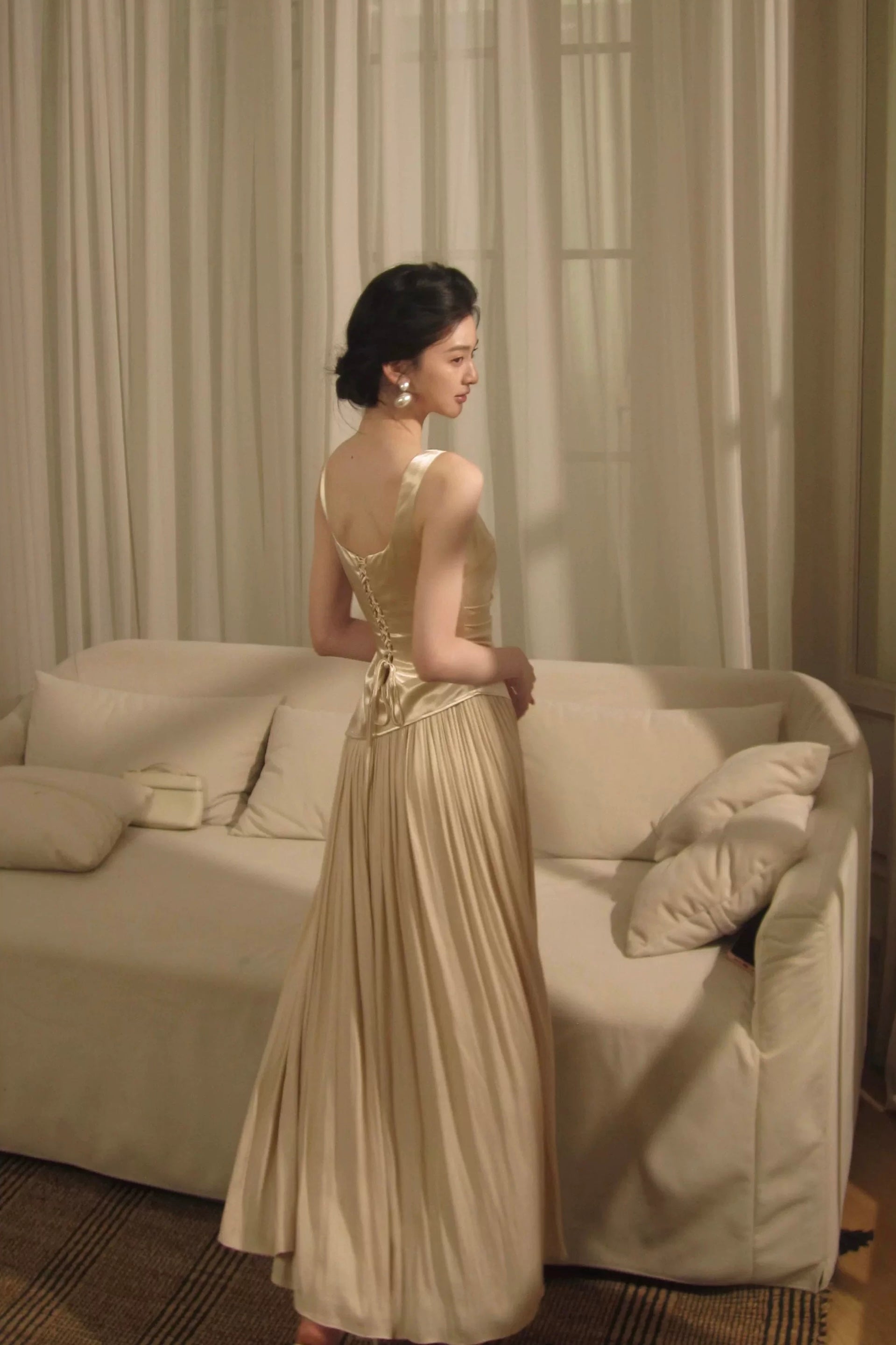 We love the wide straps and square neckline for how they frame the collarbone and slim the shoulder line, while the one-sided ruching from underbust to waist shapes you in without feeling tight. You can adjust the lace-up back to fit just right, with a hint of vintage allure. The satin bodice meets the skirt in a subtle diagonal seam, then falls into an easy A-line that skims to the ankle and sways as you walk.