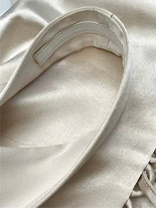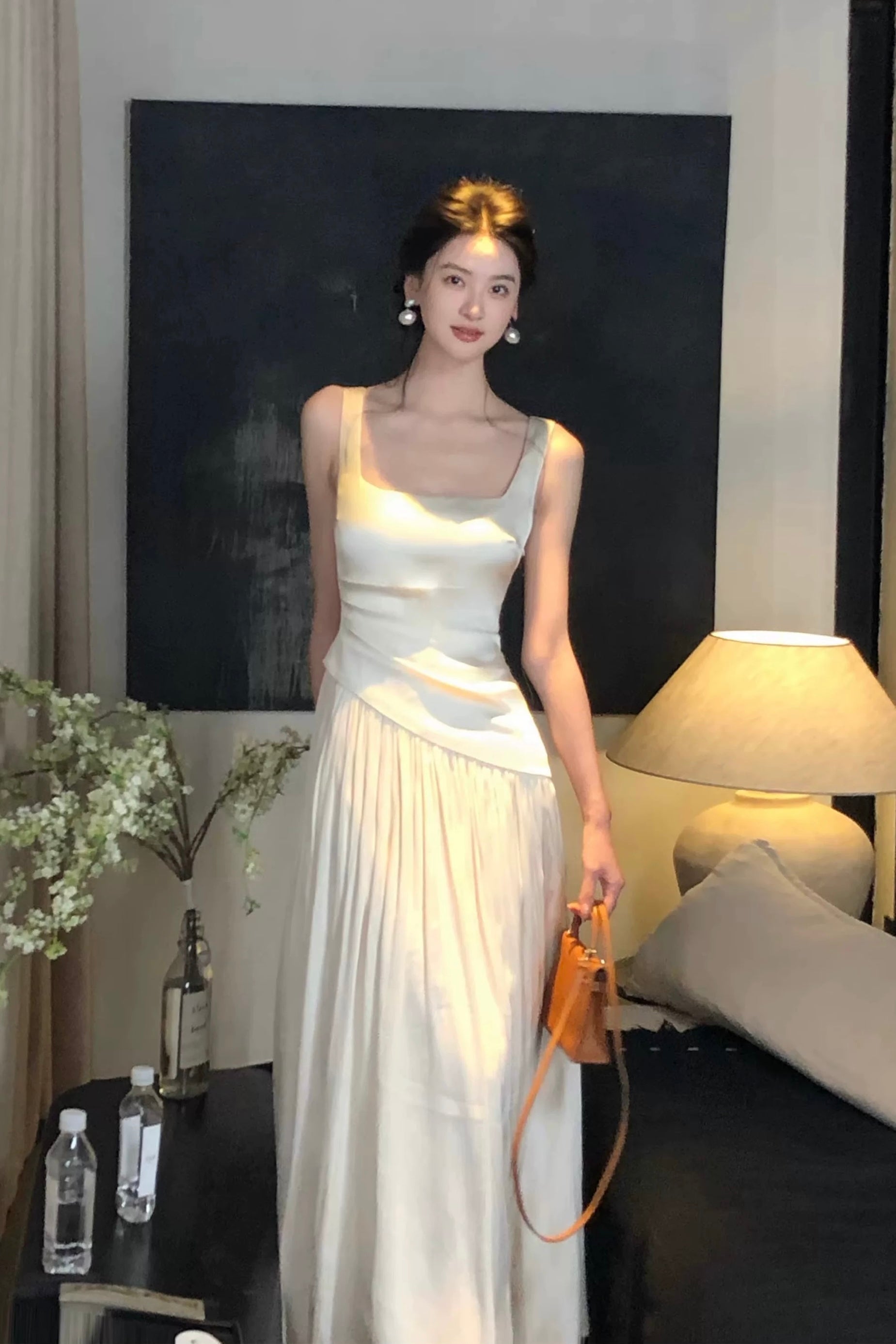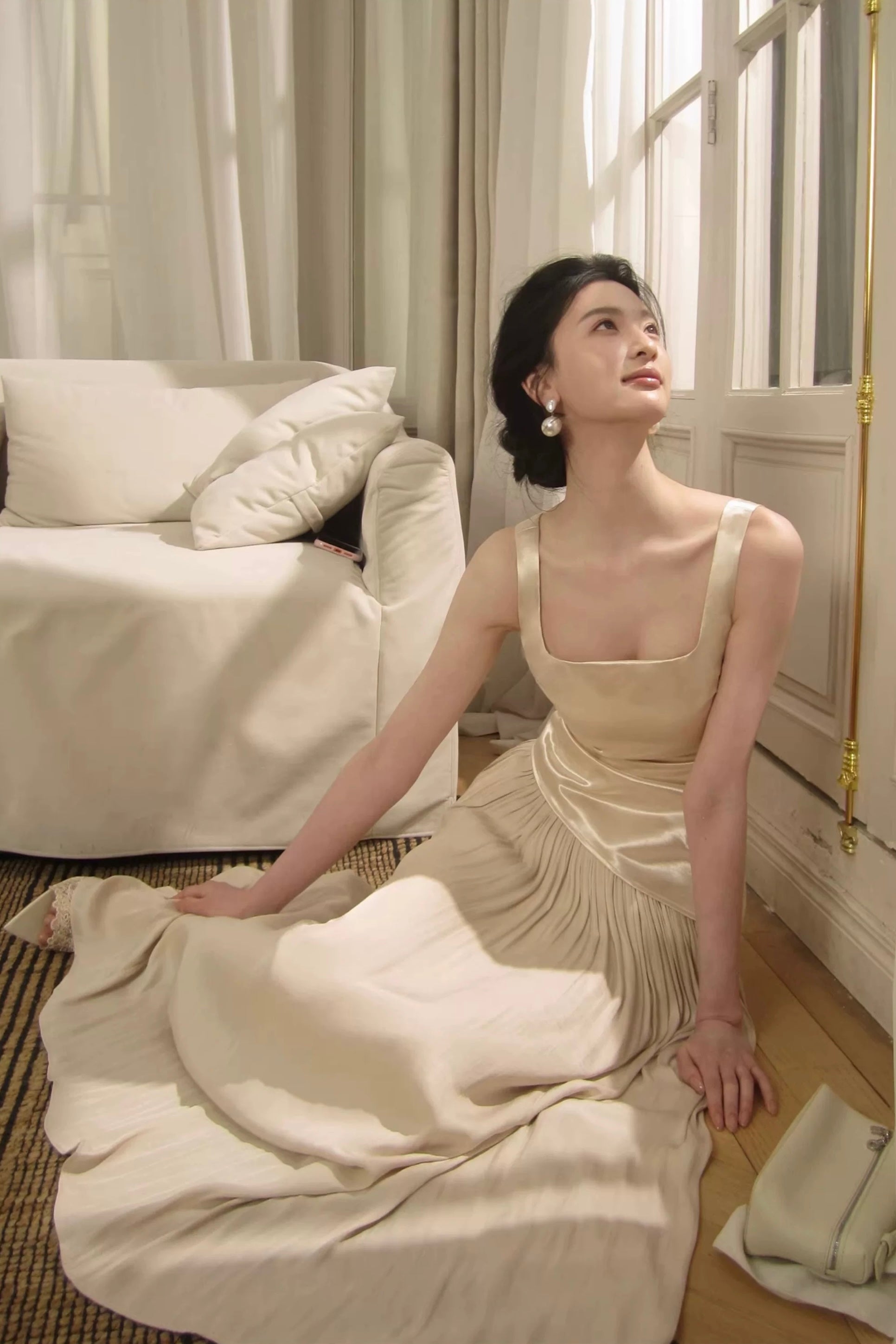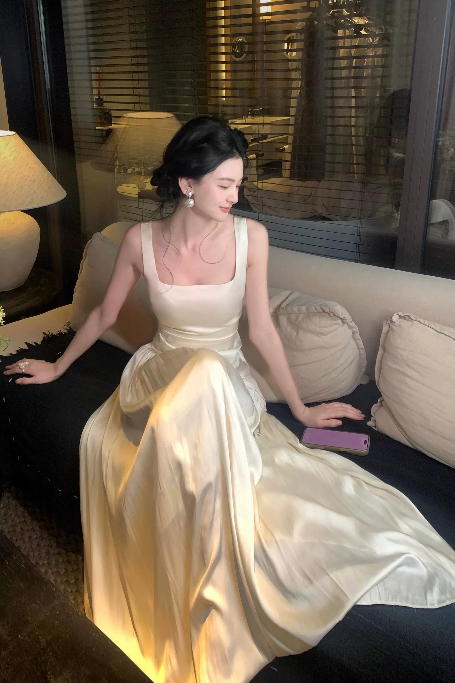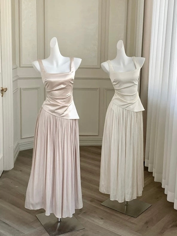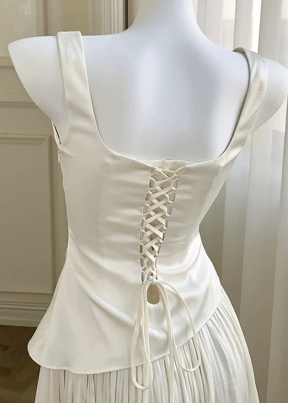 We love the wide straps and square neckline for how they frame the collarbone and slim the shoulder line, while the one-sided ruching from underbust to waist shapes you in without feeling tight. You can adjust the lace-up back to fit just right, with a hint of vintage allure. The satin bodice meets the skirt in a subtle diagonal seam, then falls into an easy A-line that skims to the ankle and sways as you walk.