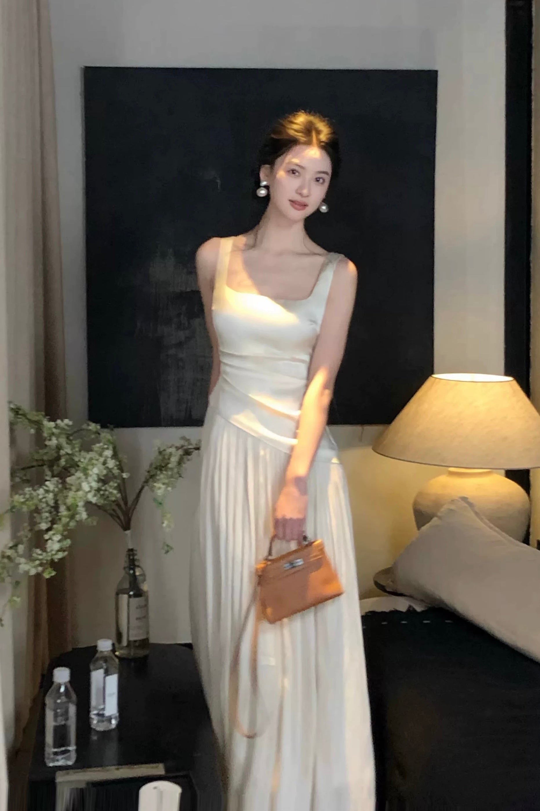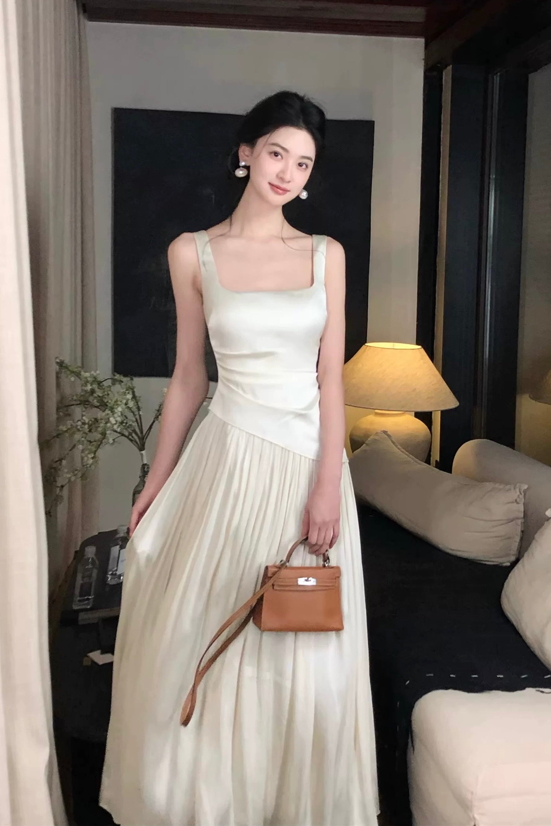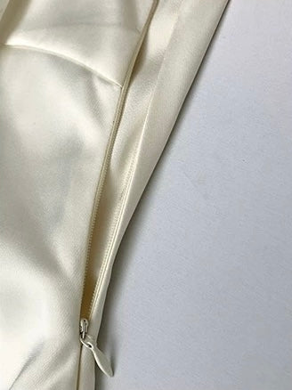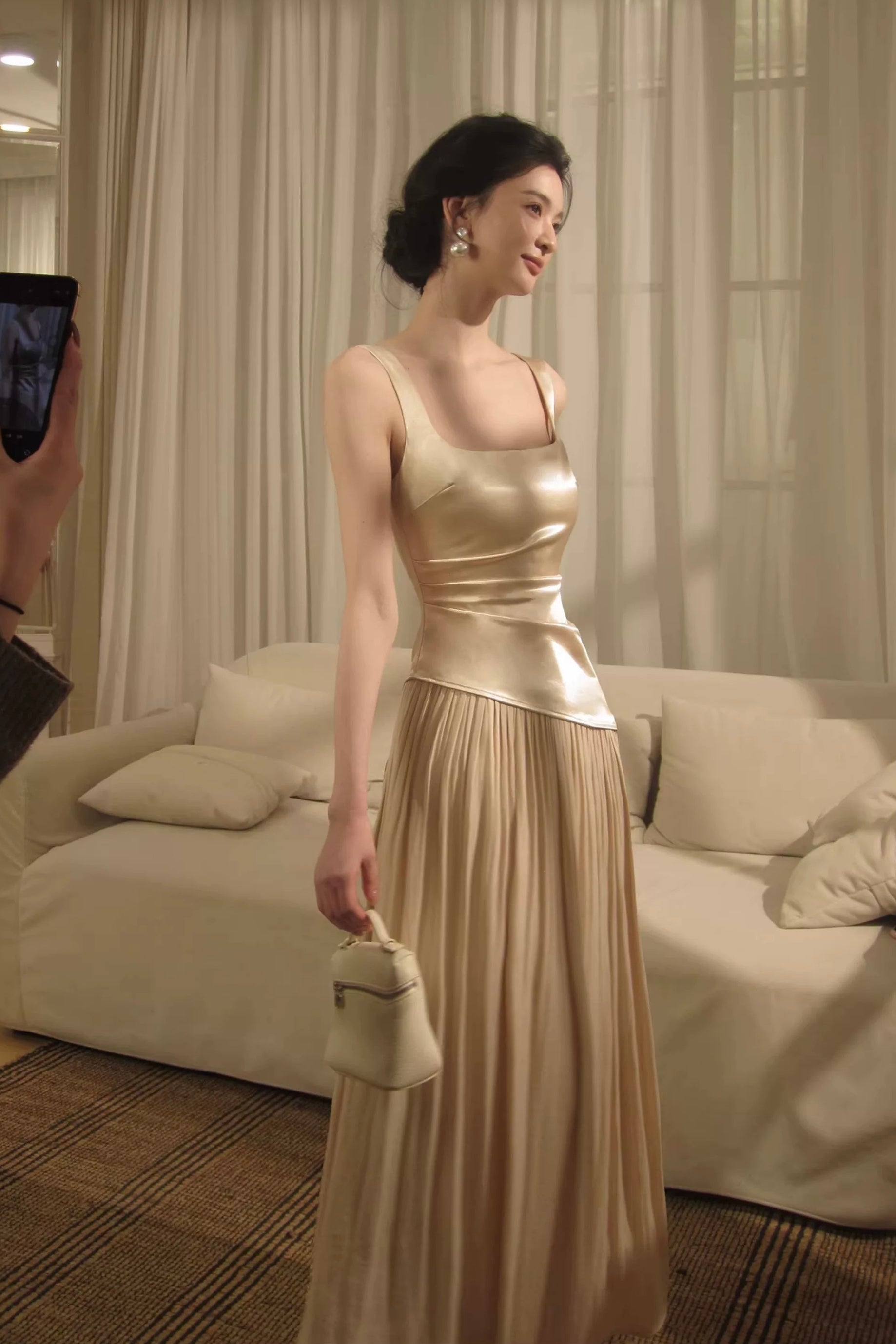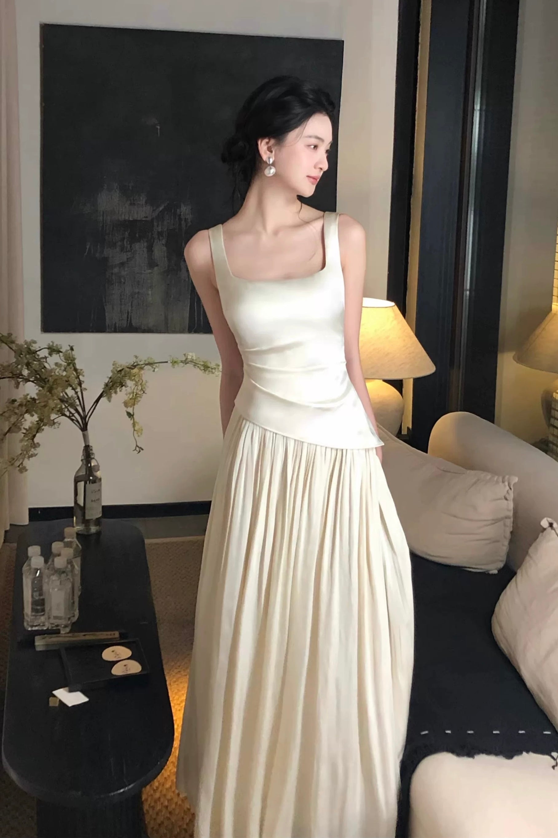 We love the wide straps and square neckline for how they frame the collarbone and slim the shoulder line, while the one-sided ruching from underbust to waist shapes you in without feeling tight. You can adjust the lace-up back to fit just right, with a hint of vintage allure. The satin bodice meets the skirt in a subtle diagonal seam, then falls into an easy A-line that skims to the ankle and sways as you walk.
