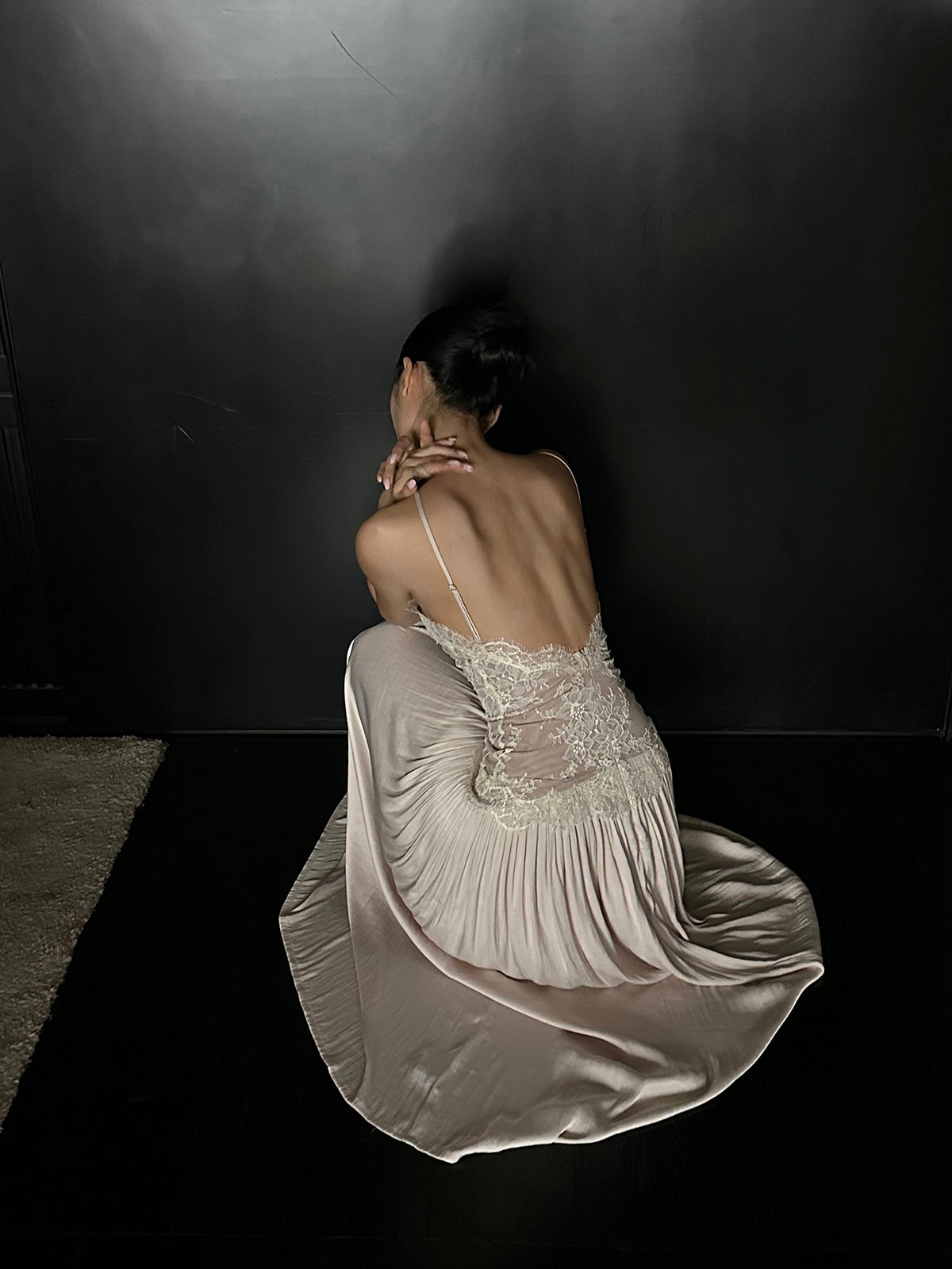 We’ve finished ‘Elysian Pearl-Kiss’ with a hidden centre-back zip for the smoothest slip-on fit, soft draping that elongates the legs, and a silhouette that glides rather than clings – because effortless drama is our favourite kind. Candle-lit gala, rooftop soirée, or that once-in-a-lifetime photo op? You already know the answer.