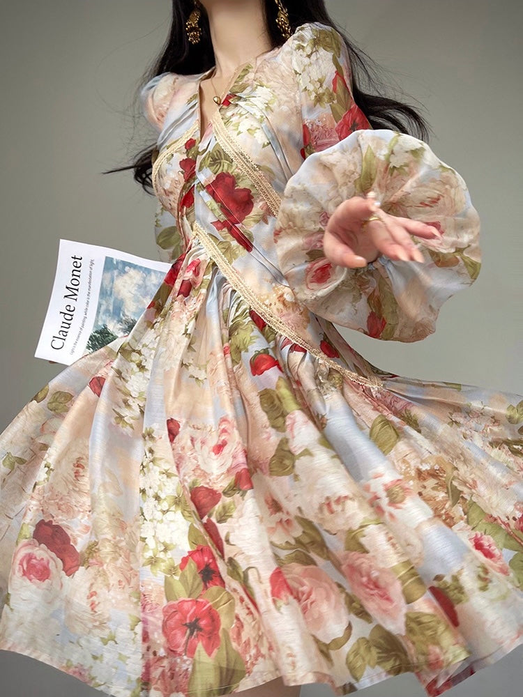 The Estée dress embodies French romance with its vibrant floral design and charming details. The lush Floyd rose pattern combines cool blue-green and bright red for a striking yet elegant look. Made from soft, translucent imitation Tencel fabric, it beautifully complements the floral print, while spliced beige apricot cotton lace adds a refined touch.