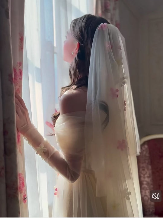 Made from fine, skin-soft mesh tulle, ‘Floréale’ feels light, airy and beautifully romantic. The bodice is lined for a close and comfortable fit, while the soft lower skirt adds graceful movement and lovely dimension. We added 8 fishbone supports through the bodice for sculpting structure and reliable support, balanced by off-shoulder sheer tulle sleeves that softly flatter the arms.