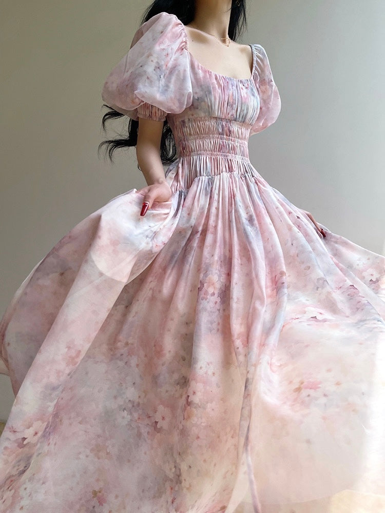 Embrace a whimsical adventure with the Journey dress, where soft floral hues and delicate fragrances dance through summer. Dreamy pink and purple watercolor prints invite you to bask in seasonal comfort, crafted from luxurious matte faux silk with an airy 5-meter hemline that flows beautifully, striking the perfect balance between structure and softness.
