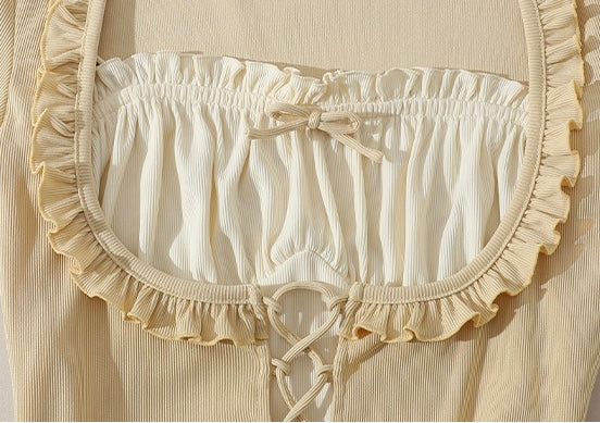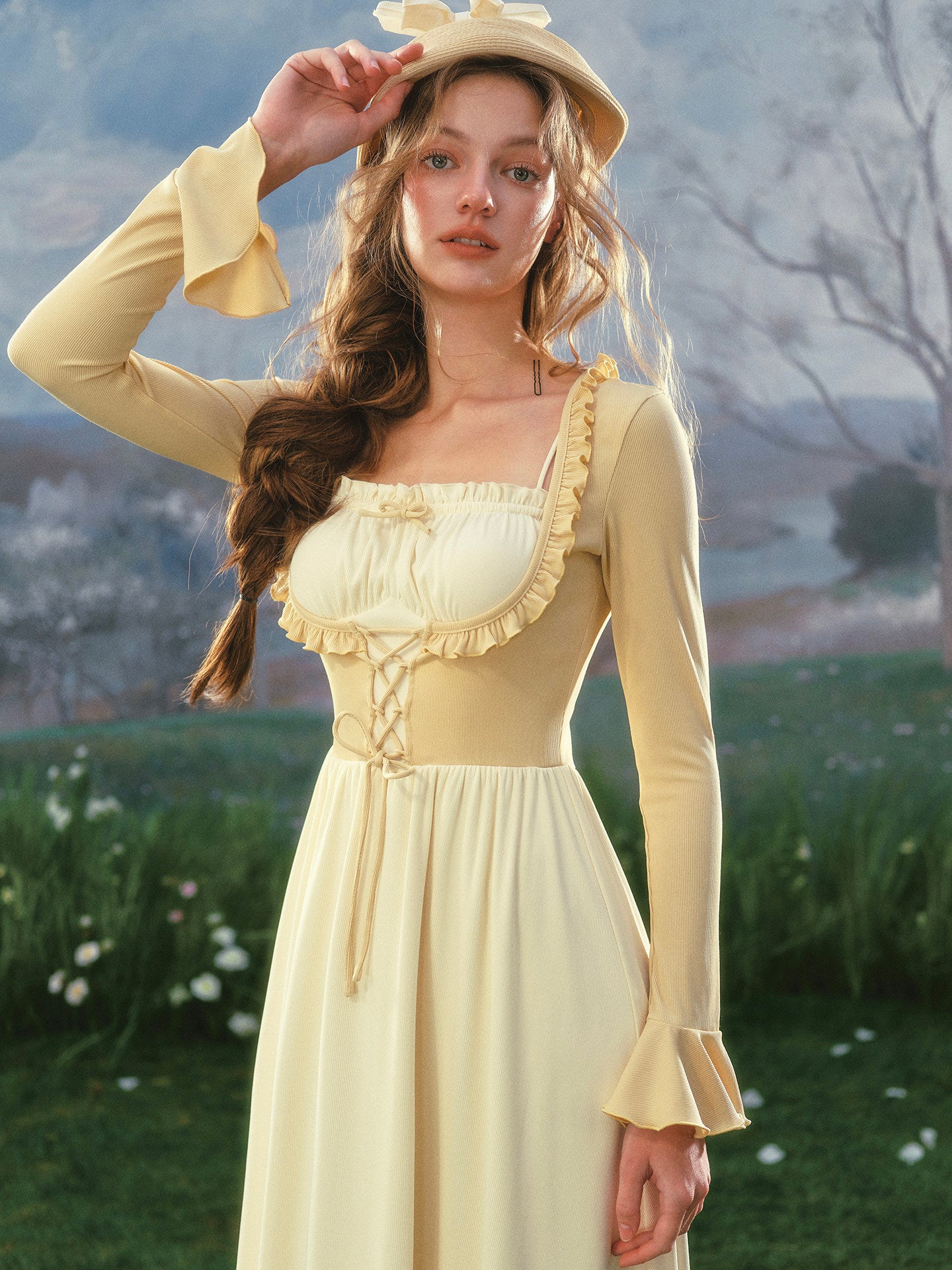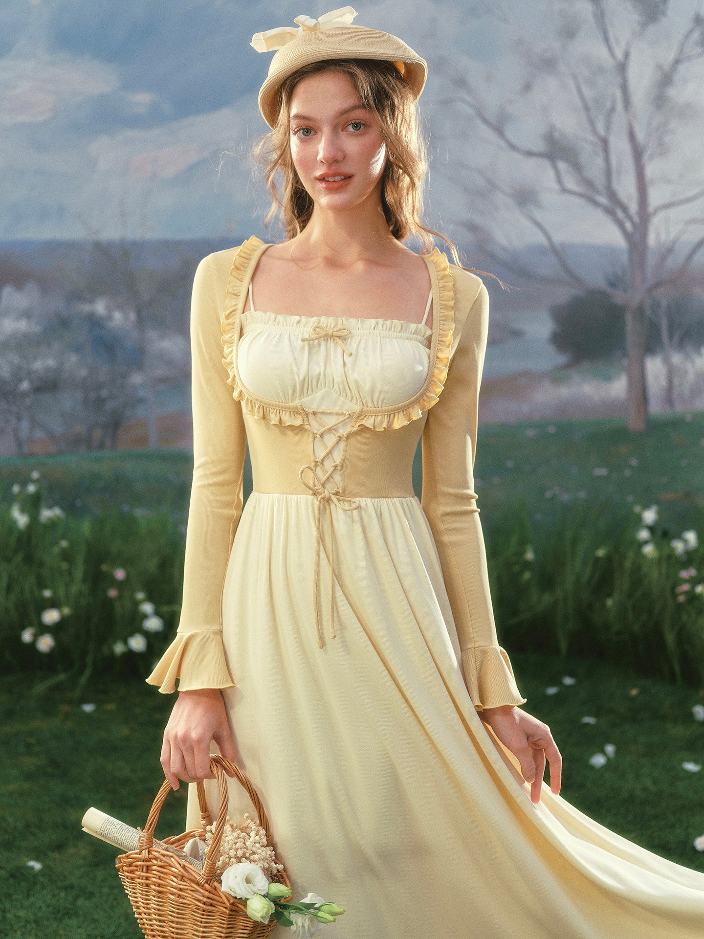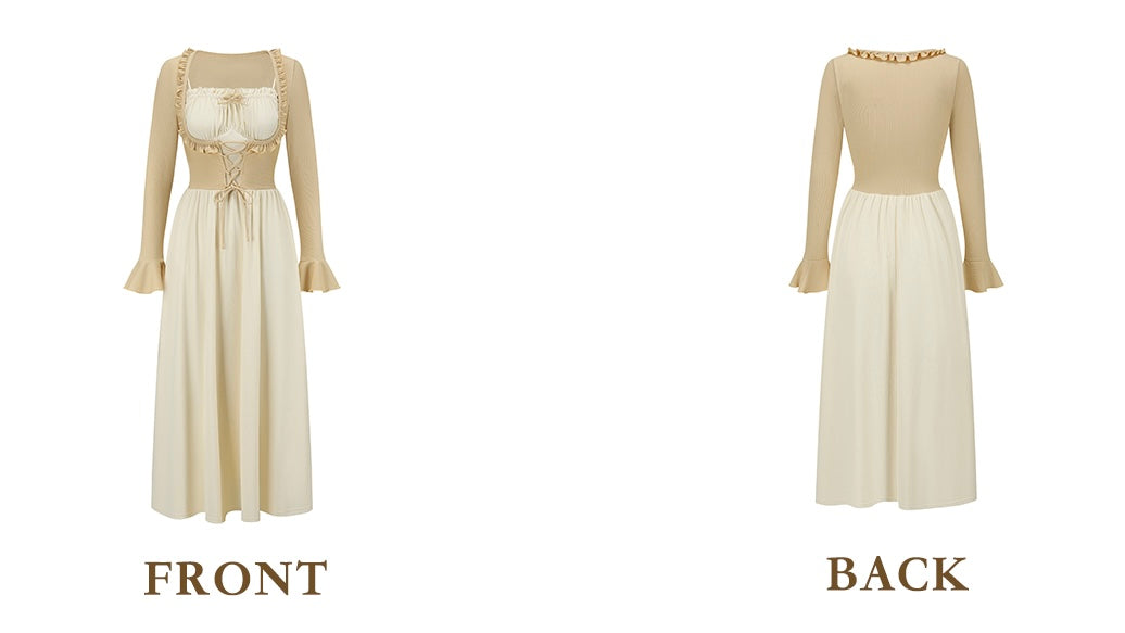 We’ve brought the art of layering to life with a sweet mock two-piece design: the upper bodice mimics a corset layered over a blouse, complete with gathered bust detail, frilled trim, and our signature lace-up front. The fit is snug through the waist then flows into a swishy A-line skirt that’s perfect for twirls in the meadow or lazy garden strolls.