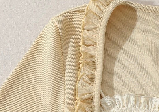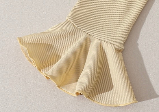 Our soft ribbed knit hugs the arms with just the right amount of stretch, and the bell-shaped cuffs? So feminine, so flattering. And the best part? No layering required – it’s all built in, so you can throw it on and go.