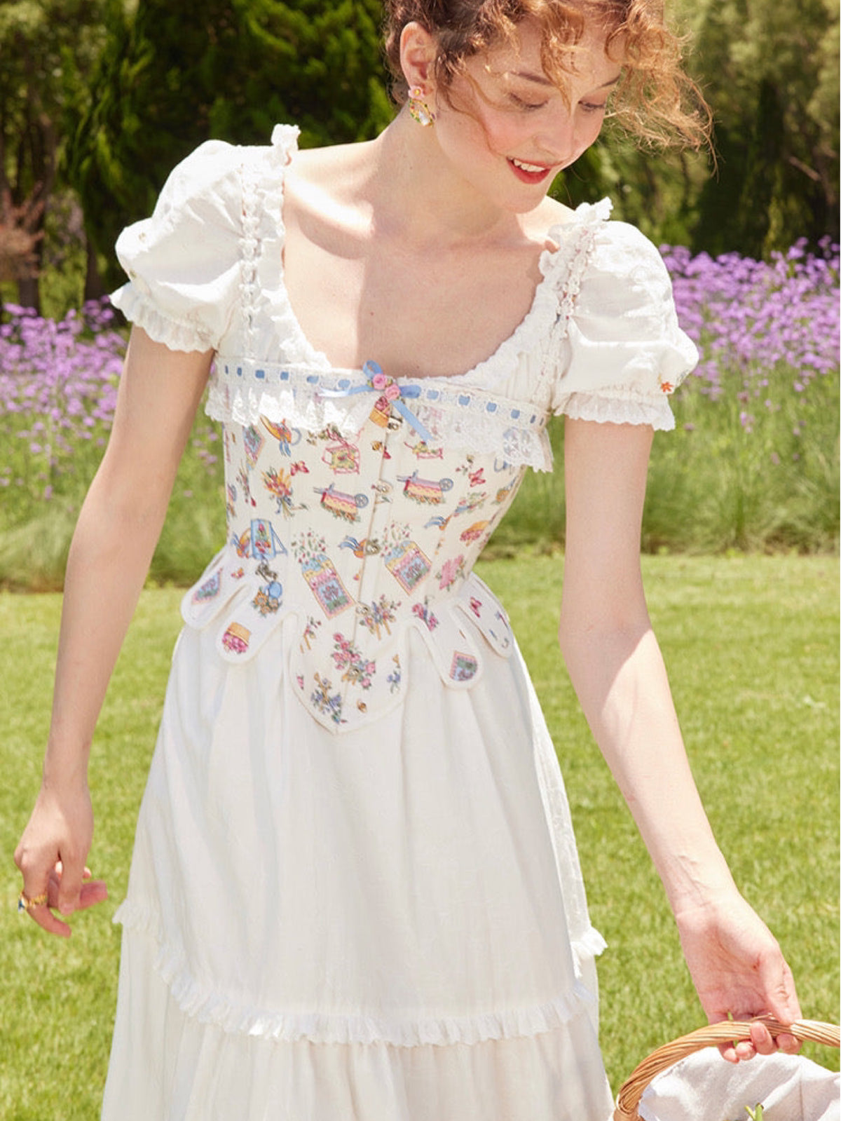 Cut from 100% cotton poplin and printed with whimsical garden motifs (think butterflies, straw hats, flower baskets, even tiny shears). It’s fresh, playful, and oh-so-summery. The shape is inspired by 18th-century corsetry with a petal hemline, a structured boned bodice supported by 12 fishbones, and our signature lace-up back that sculpts your waist just right.