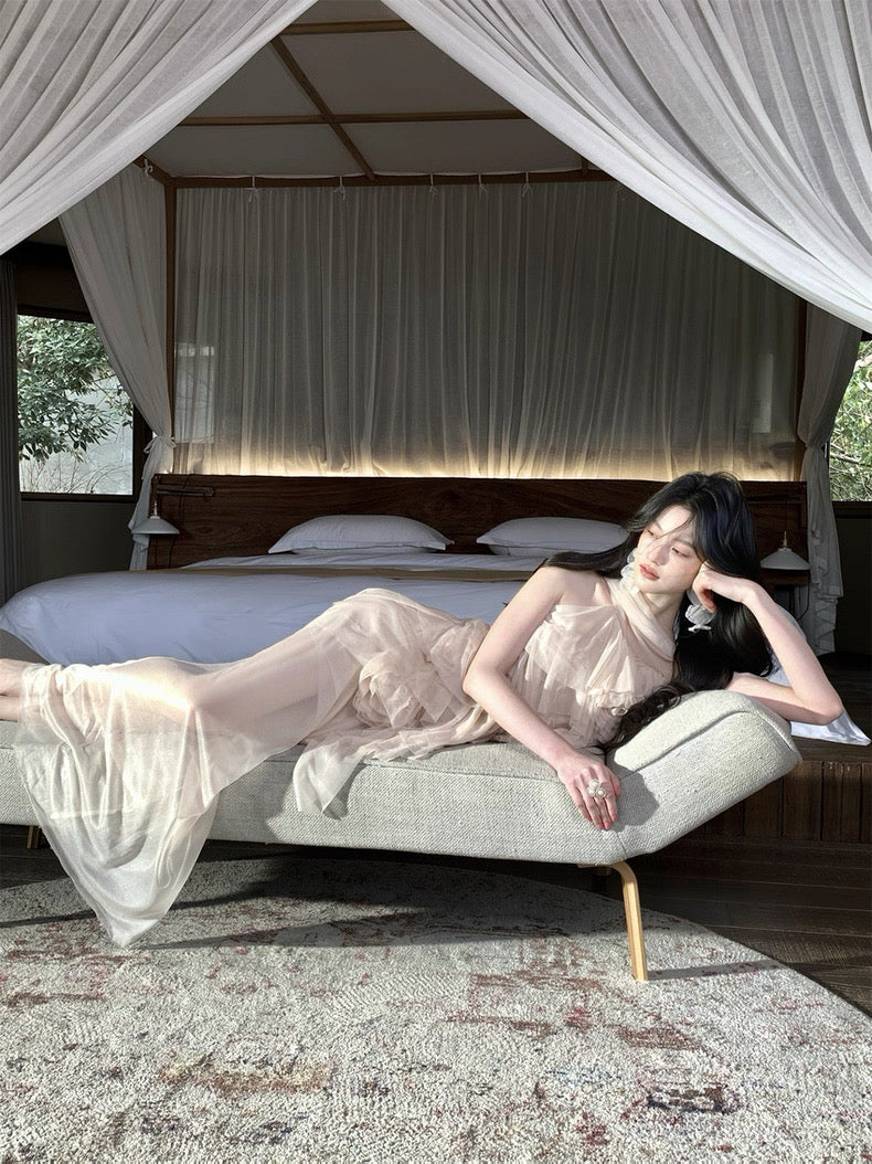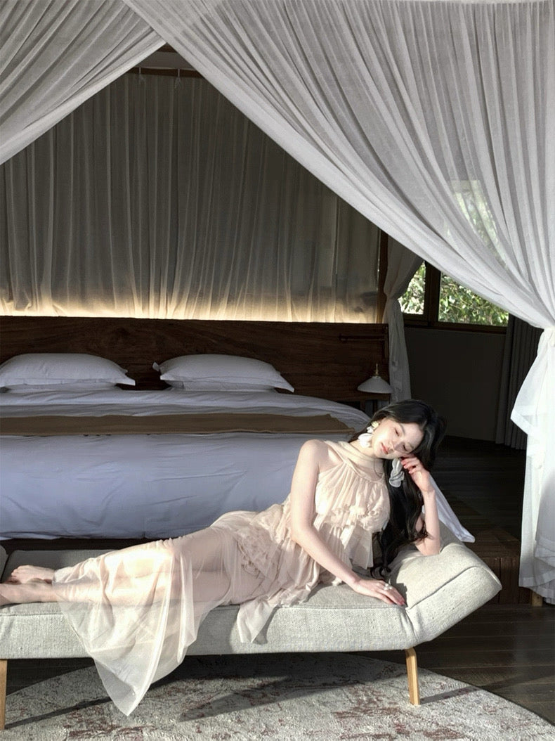 Soft “sweet apricot” pink looks almost misty under sunshine, and the feather light chiffon feels cool, breathable, and never clings. Every bloom is stitched in place to stay charming wear after wear, because we never skip the little things that make you smile.