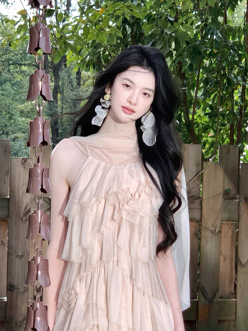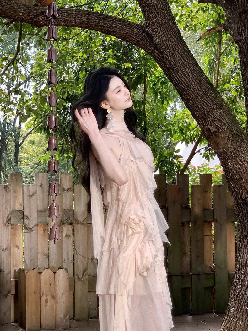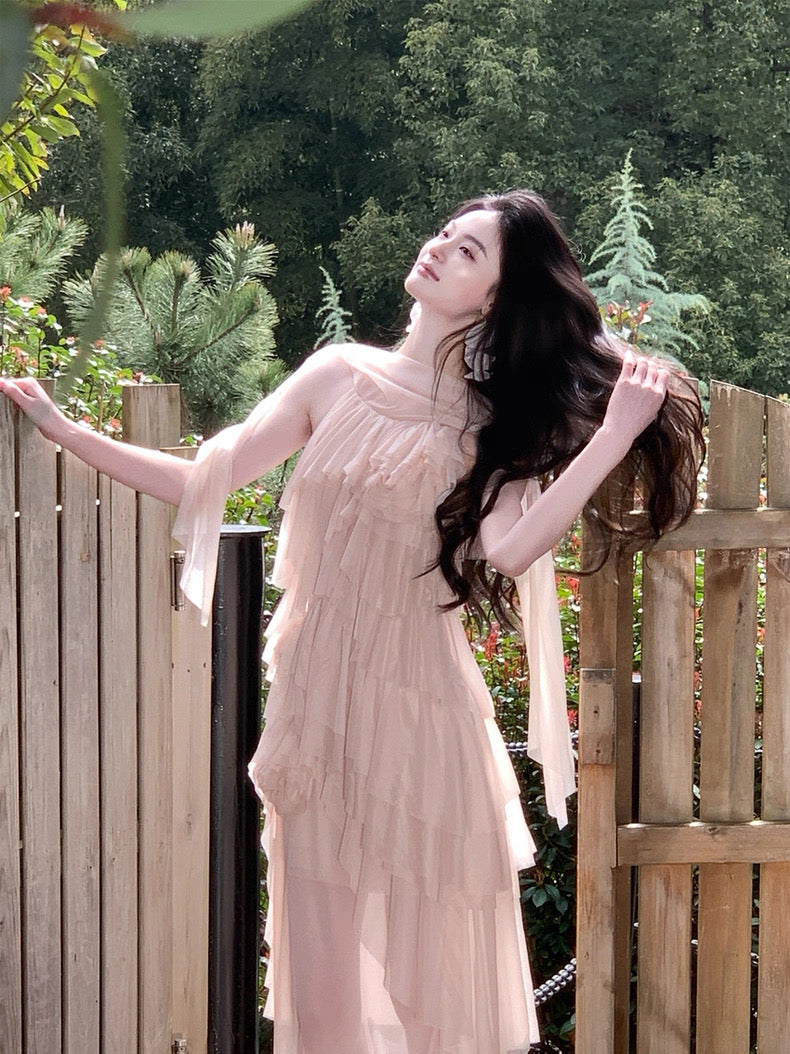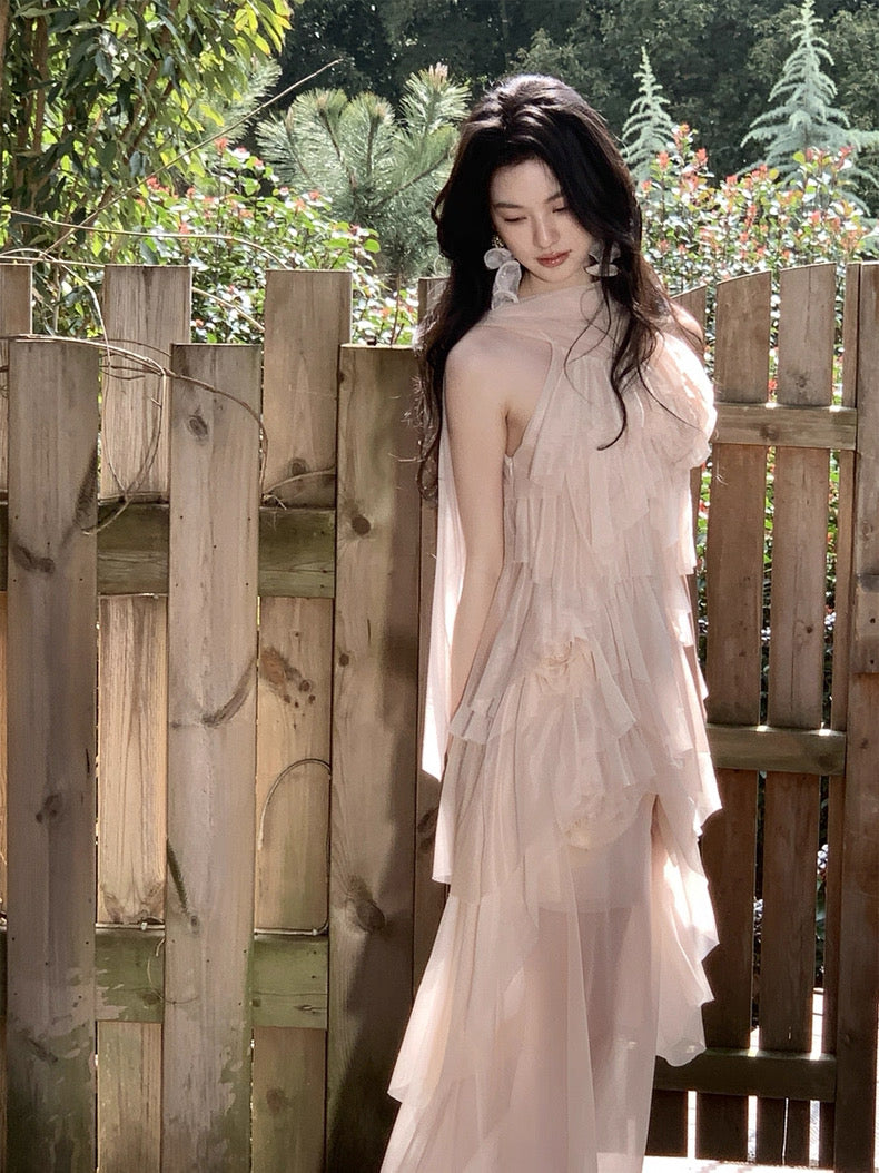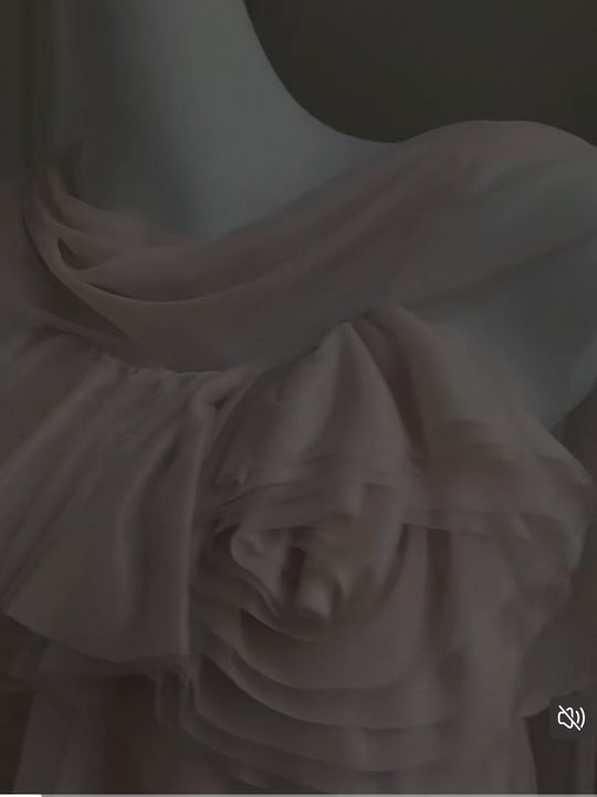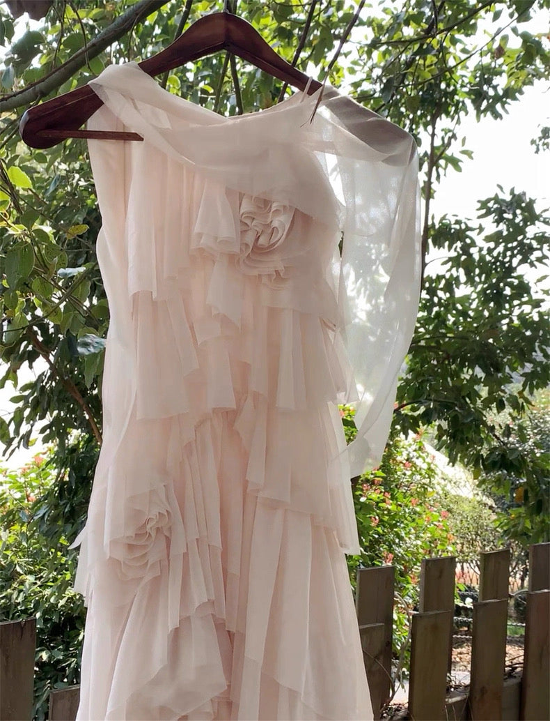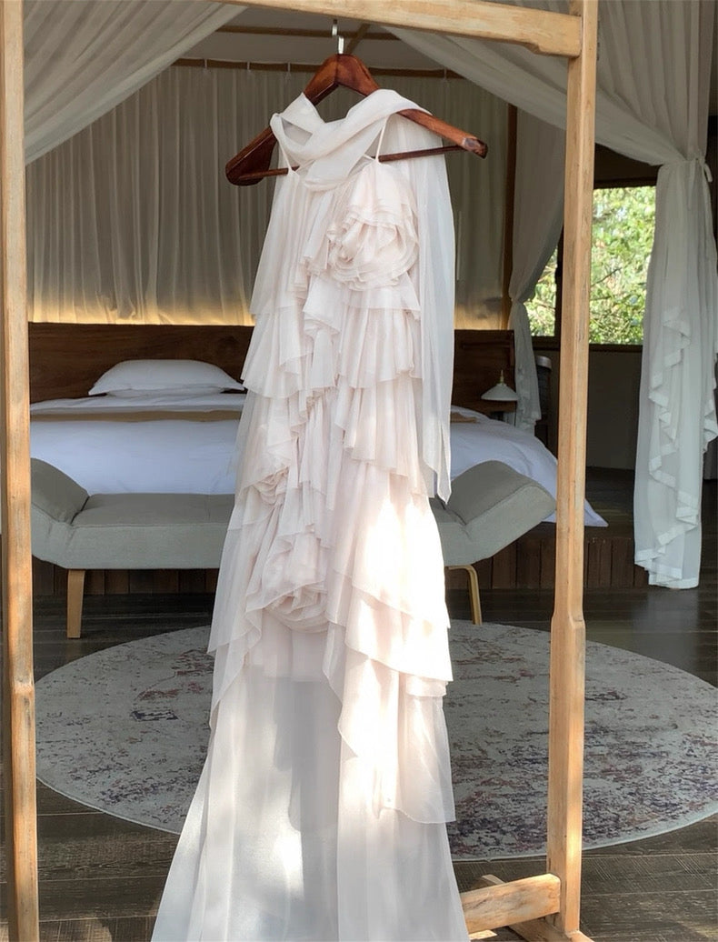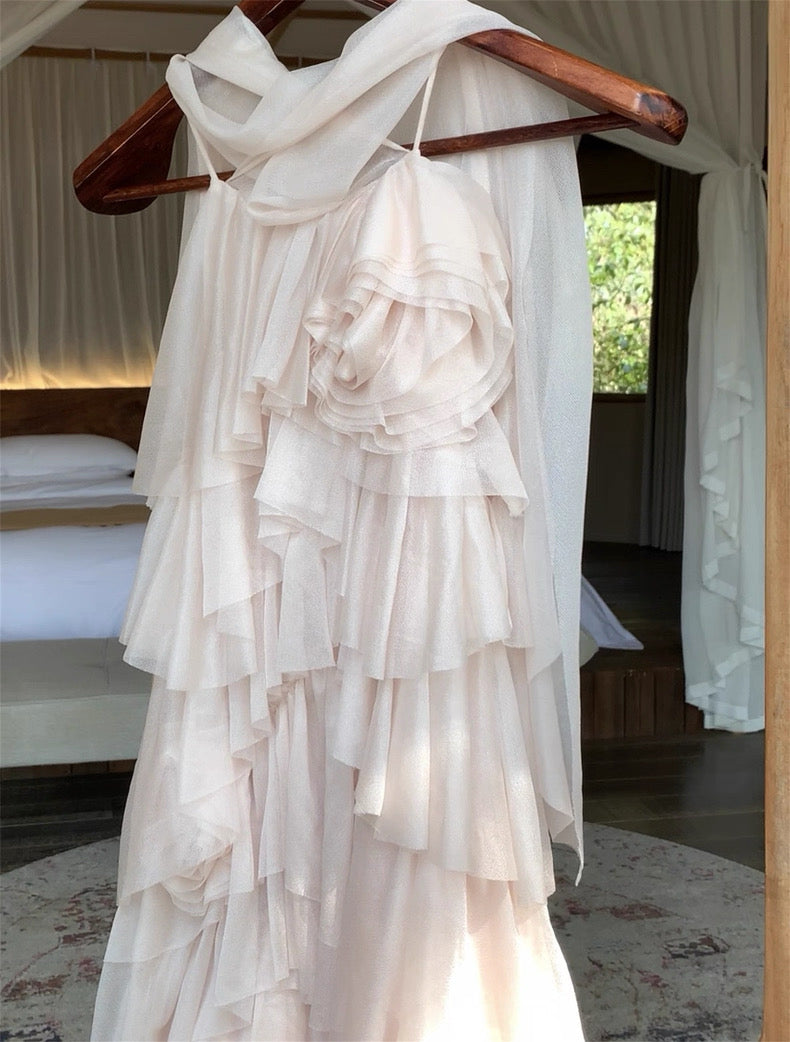 Turn around and you’ll find the trailing back ties, cinch them into a bow or let them drape loose, then watch the crystal kissed clasp catch the light for a subtle touch of sparkle. From the waist, our signature tiered “cake” skirt unfurls in airy chiffon, each layer lightly rolled at the edge so it sways like petals in a breeze.