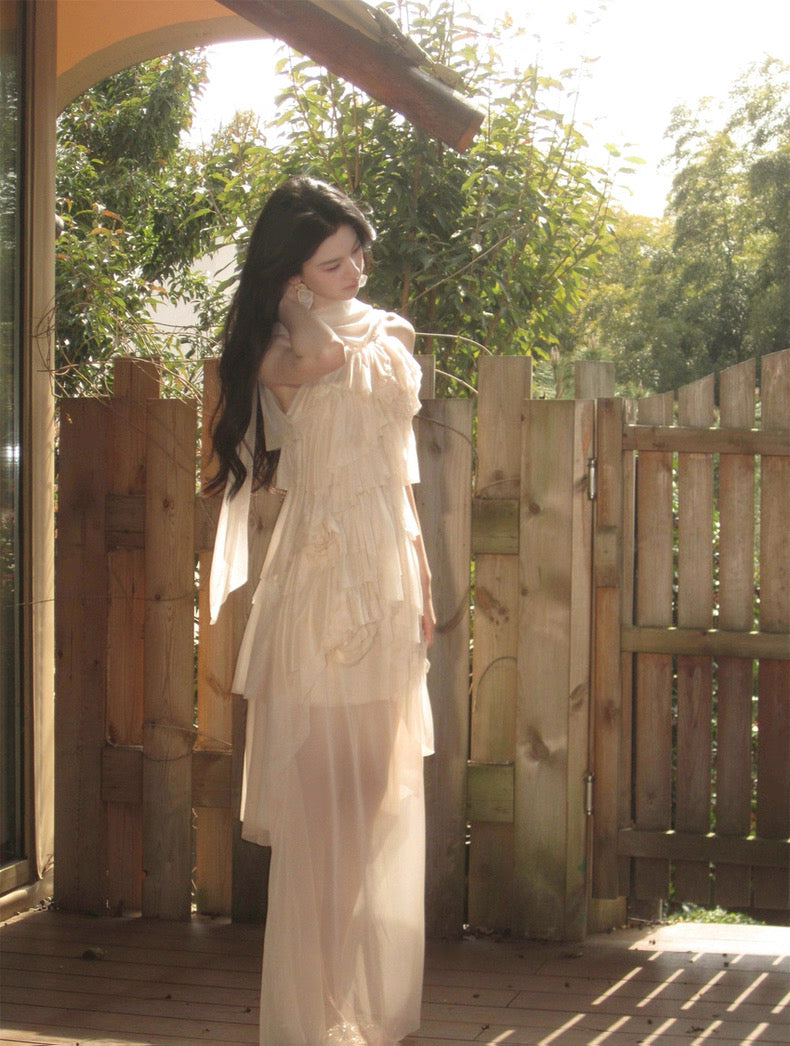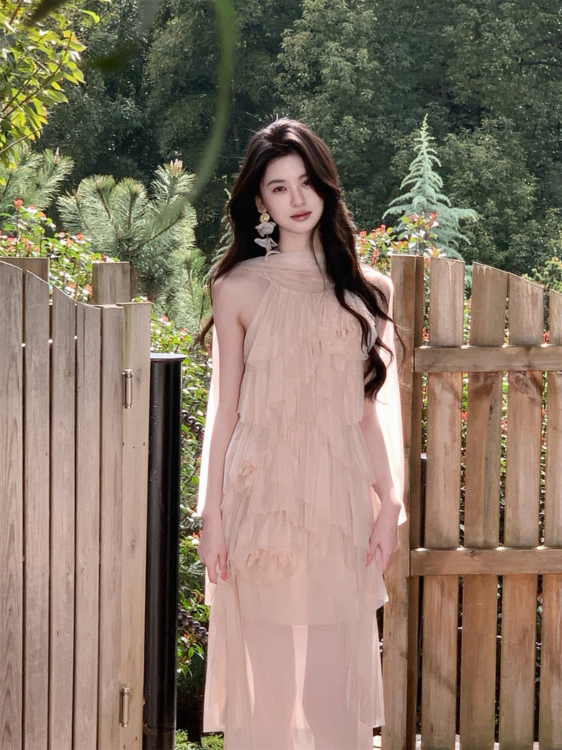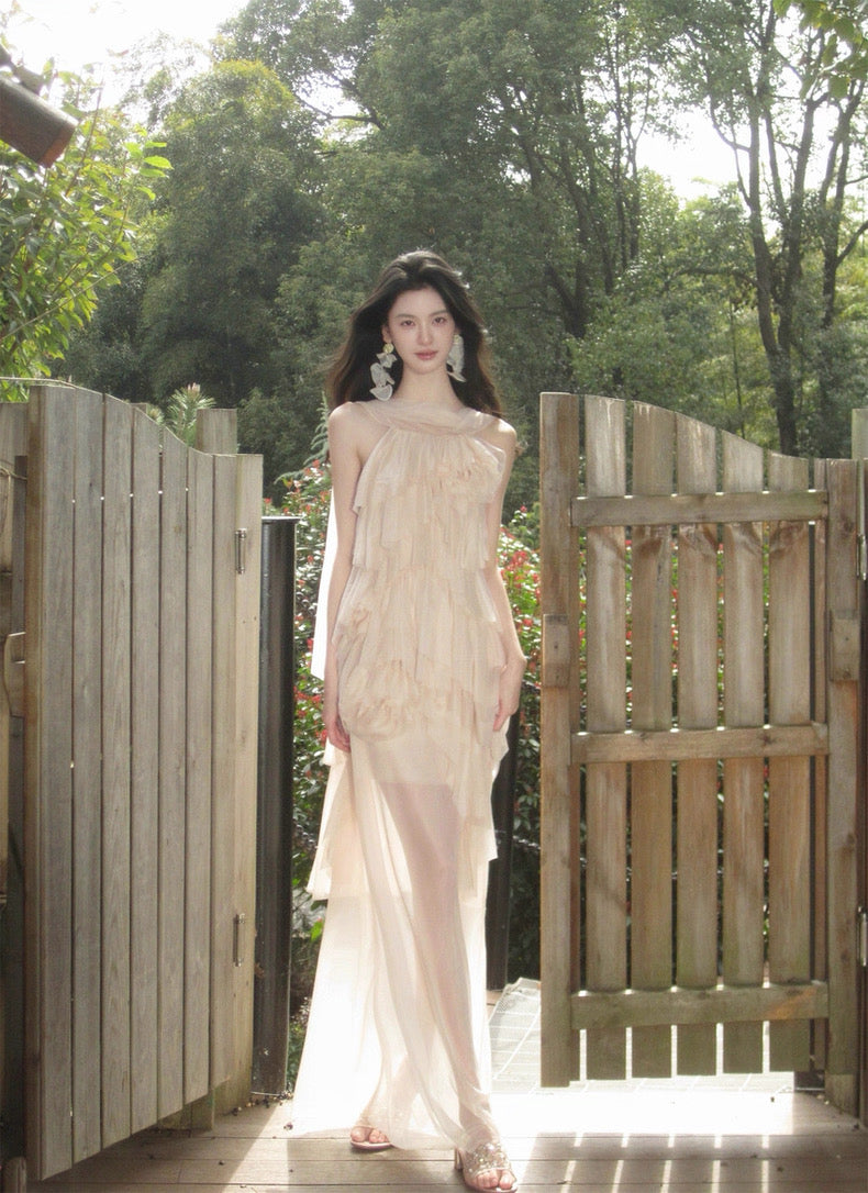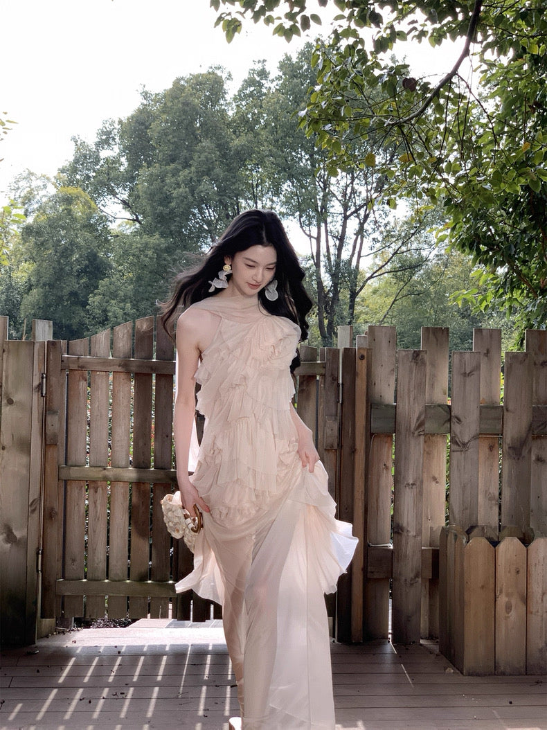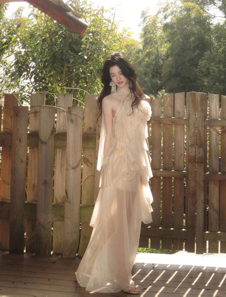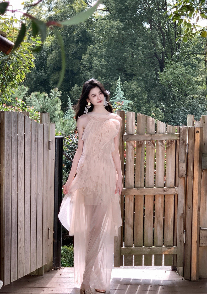 Turn around and you’ll find the trailing back ties, cinch them into a bow or let them drape loose, then watch the crystal kissed clasp catch the light for a subtle touch of sparkle. From the waist, our signature tiered “cake” skirt unfurls in airy chiffon, each layer lightly rolled at the edge so it sways like petals in a breeze.