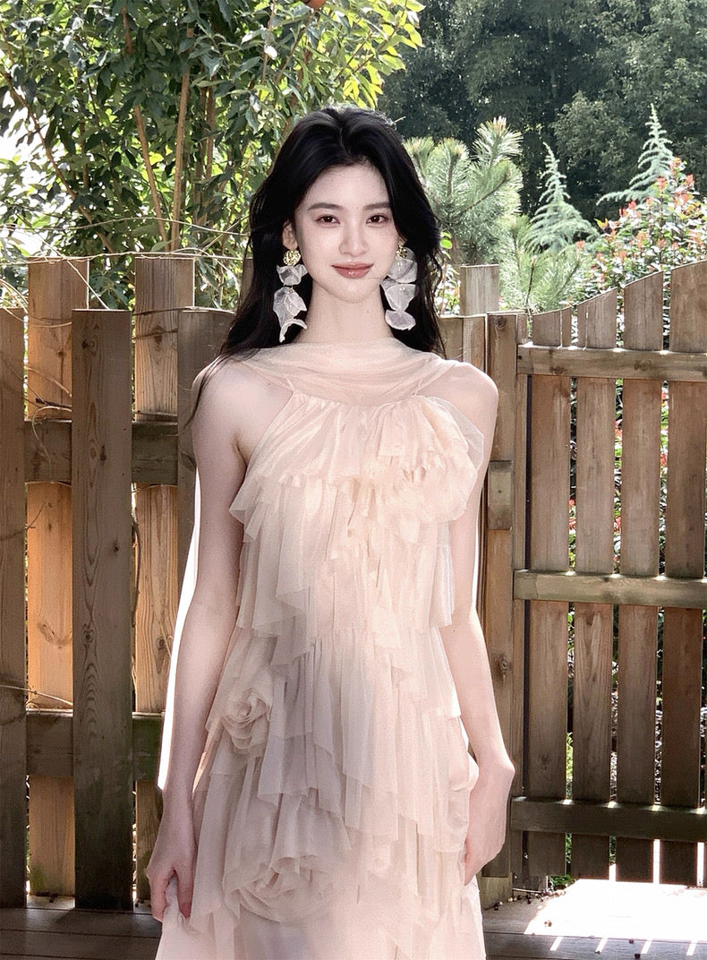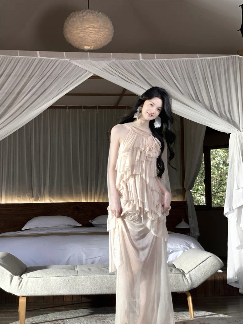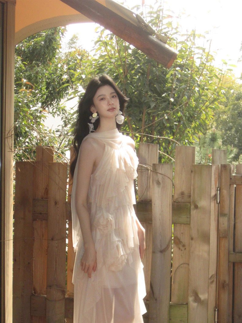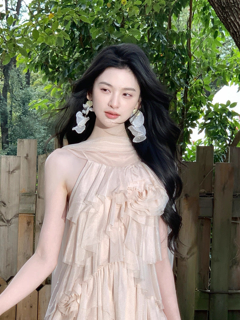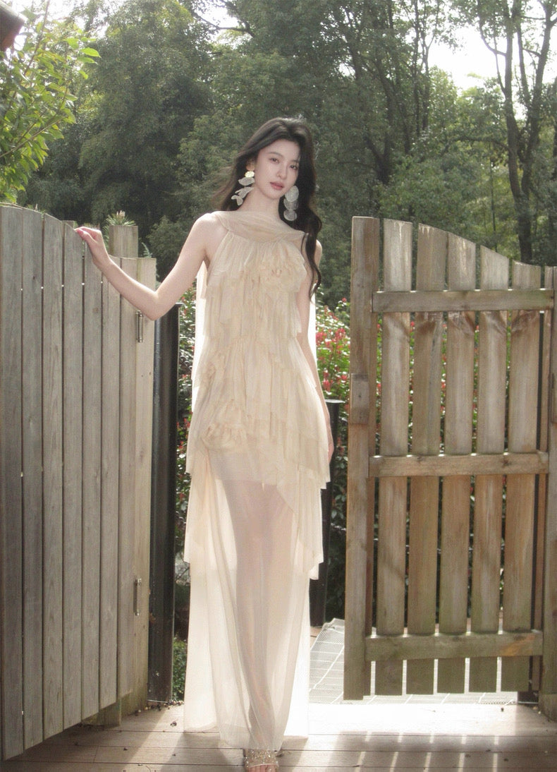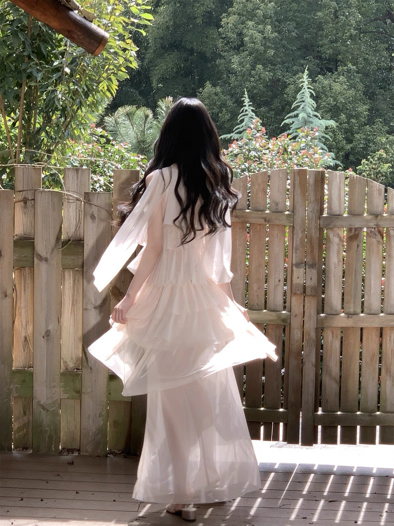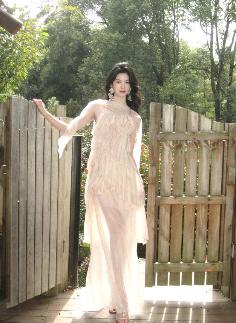 Turn around and you’ll find the trailing back ties, cinch them into a bow or let them drape loose, then watch the crystal kissed clasp catch the light for a subtle touch of sparkle. From the waist, our signature tiered “cake” skirt unfurls in airy chiffon, each layer lightly rolled at the edge so it sways like petals in a breeze.