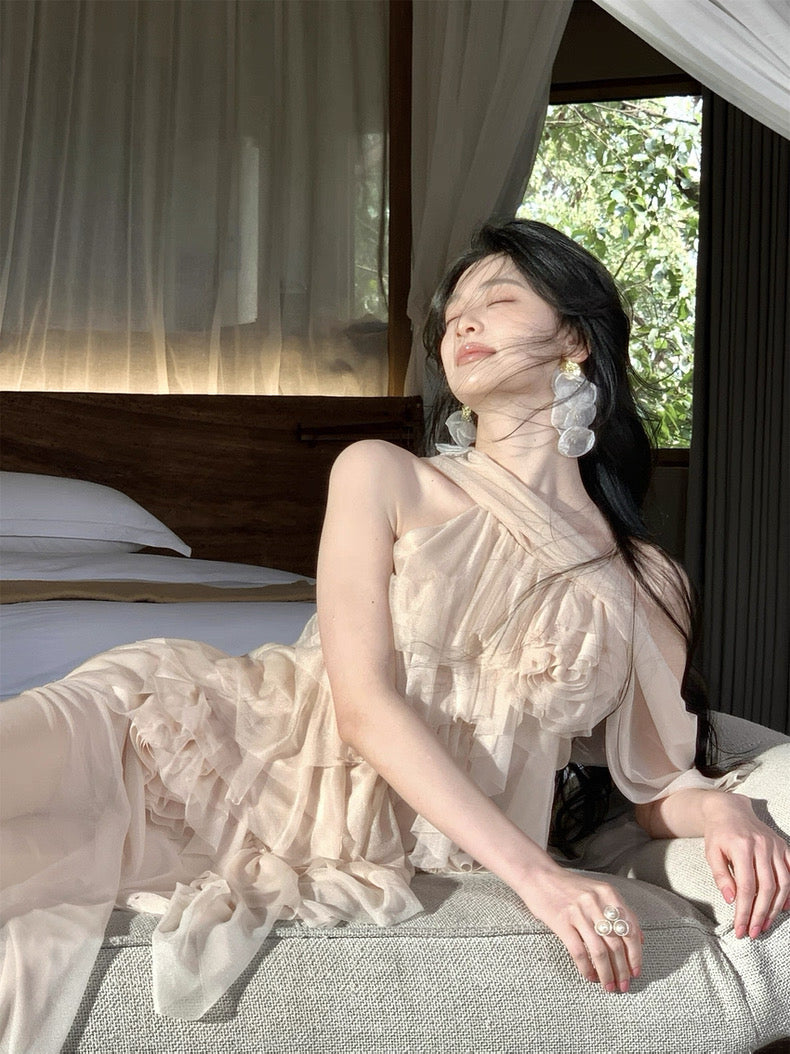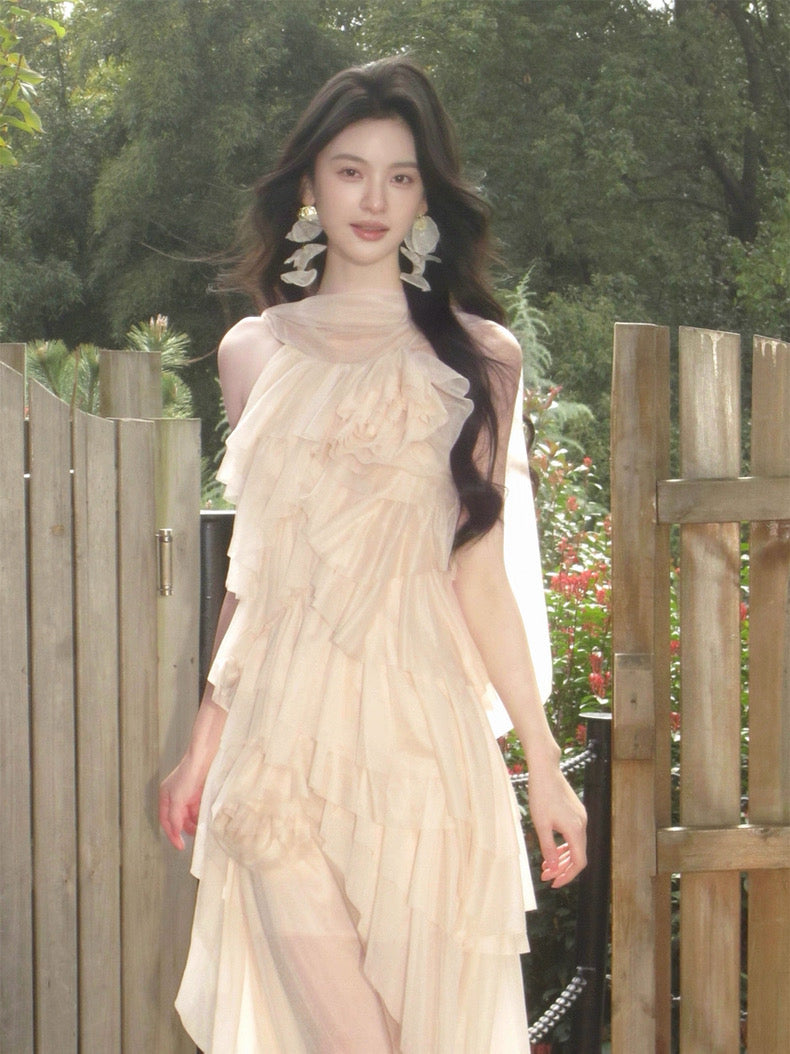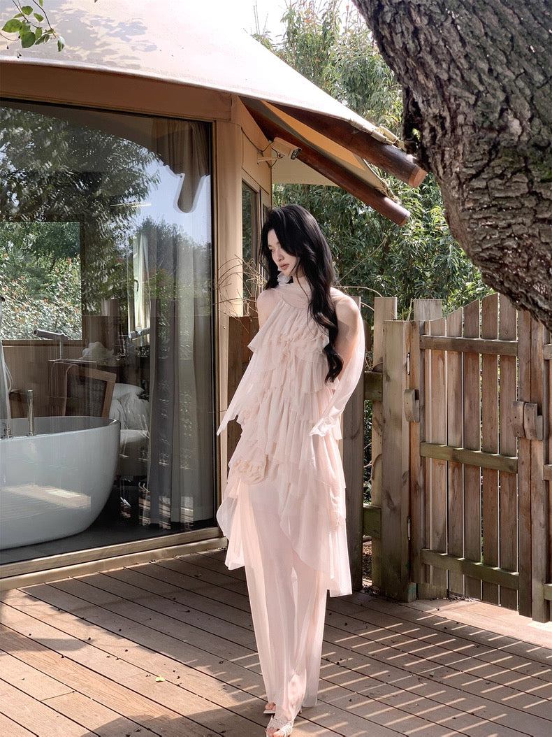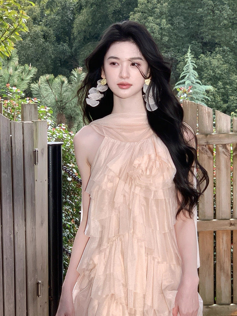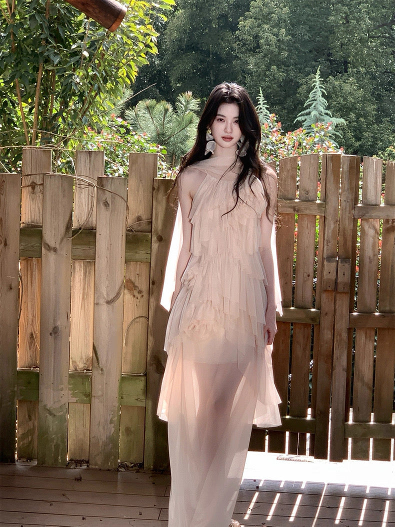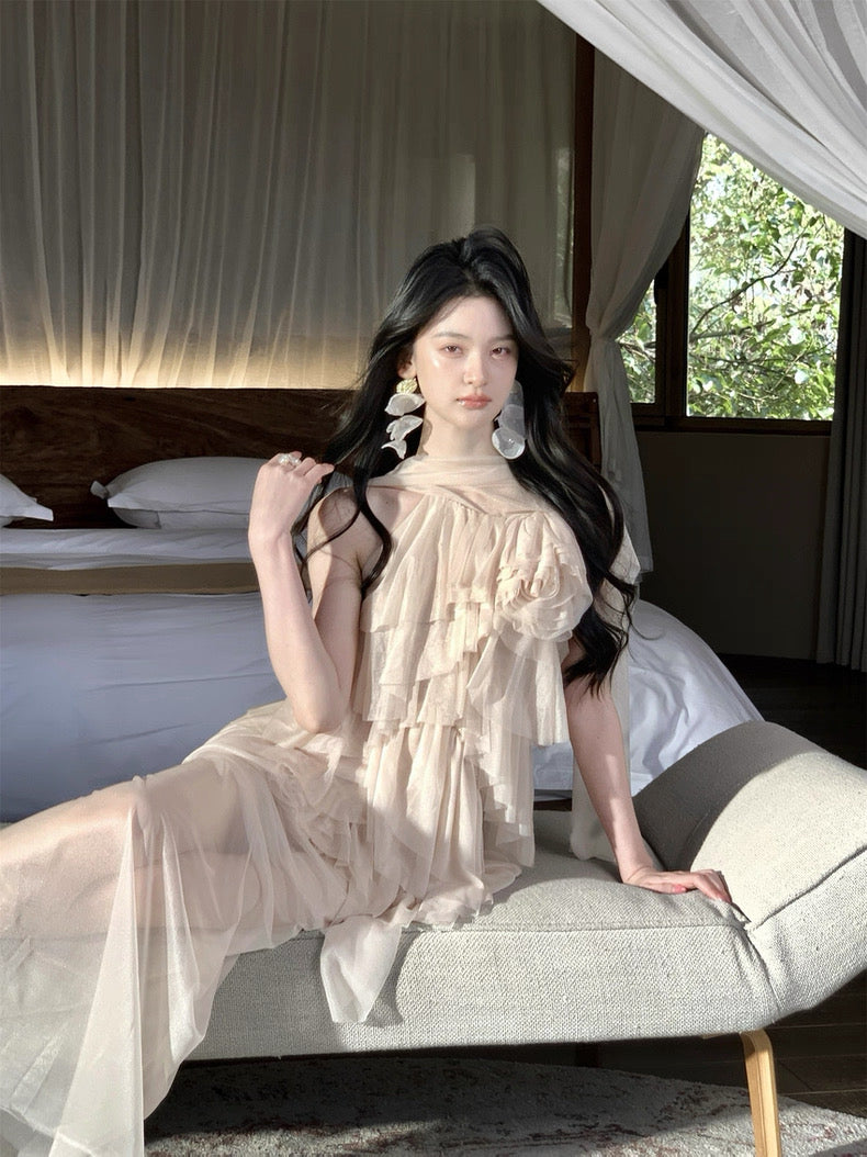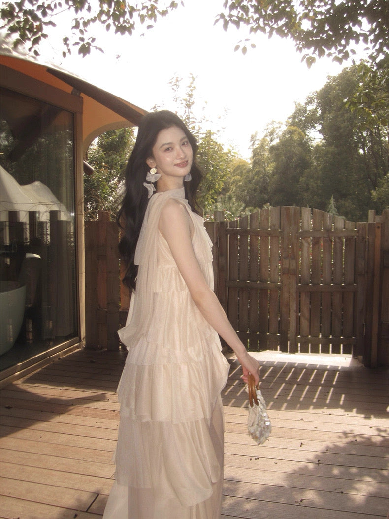 Turn around and you’ll find the trailing back ties, cinch them into a bow or let them drape loose, then watch the crystal kissed clasp catch the light for a subtle touch of sparkle. From the waist, our signature tiered “cake” skirt unfurls in airy chiffon, each layer lightly rolled at the edge so it sways like petals in a breeze.
