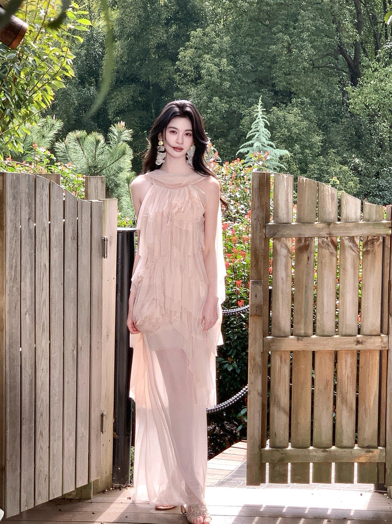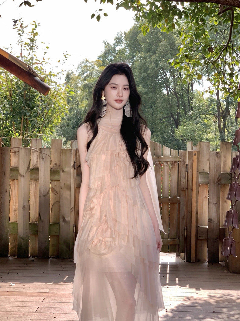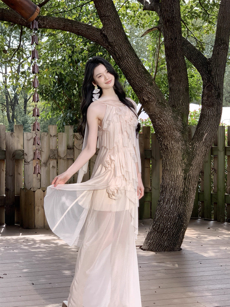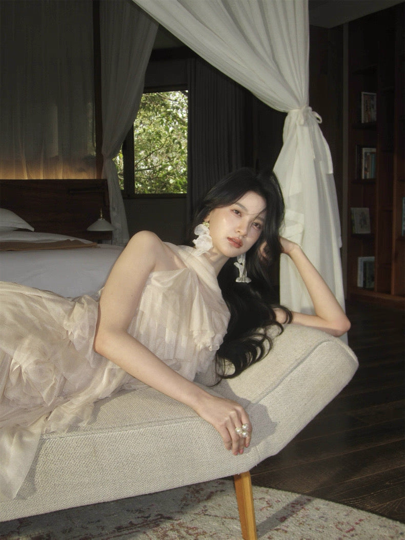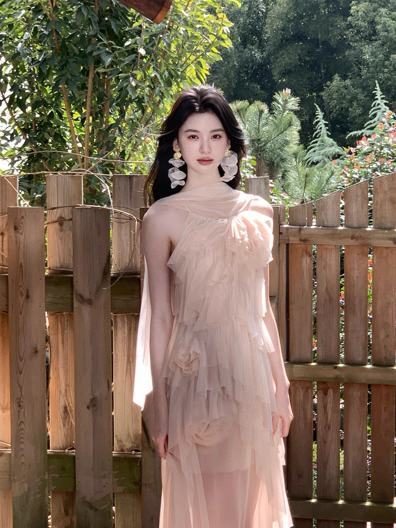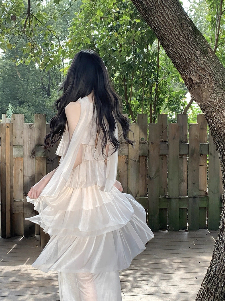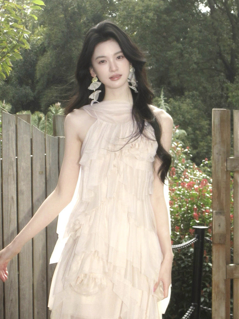 Turn around and you’ll find the trailing back ties, cinch them into a bow or let them drape loose, then watch the crystal kissed clasp catch the light for a subtle touch of sparkle. From the waist, our signature tiered “cake” skirt unfurls in airy chiffon, each layer lightly rolled at the edge so it sways like petals in a breeze.