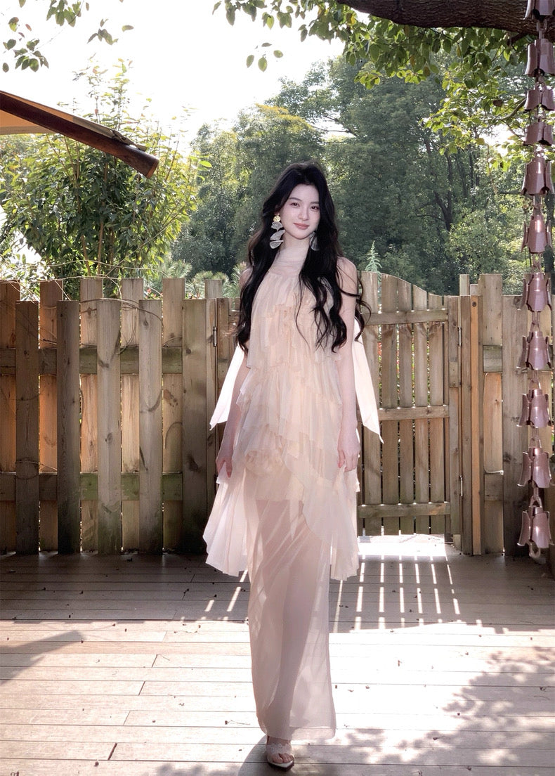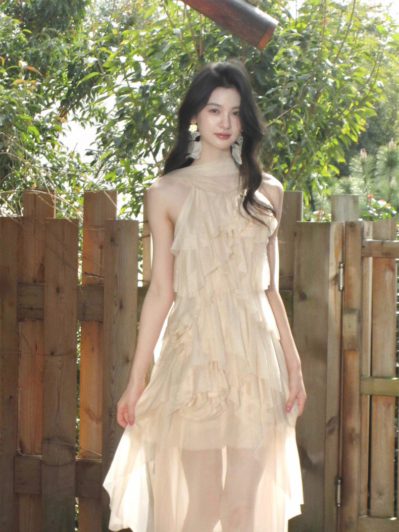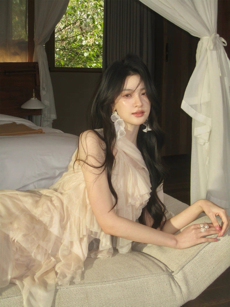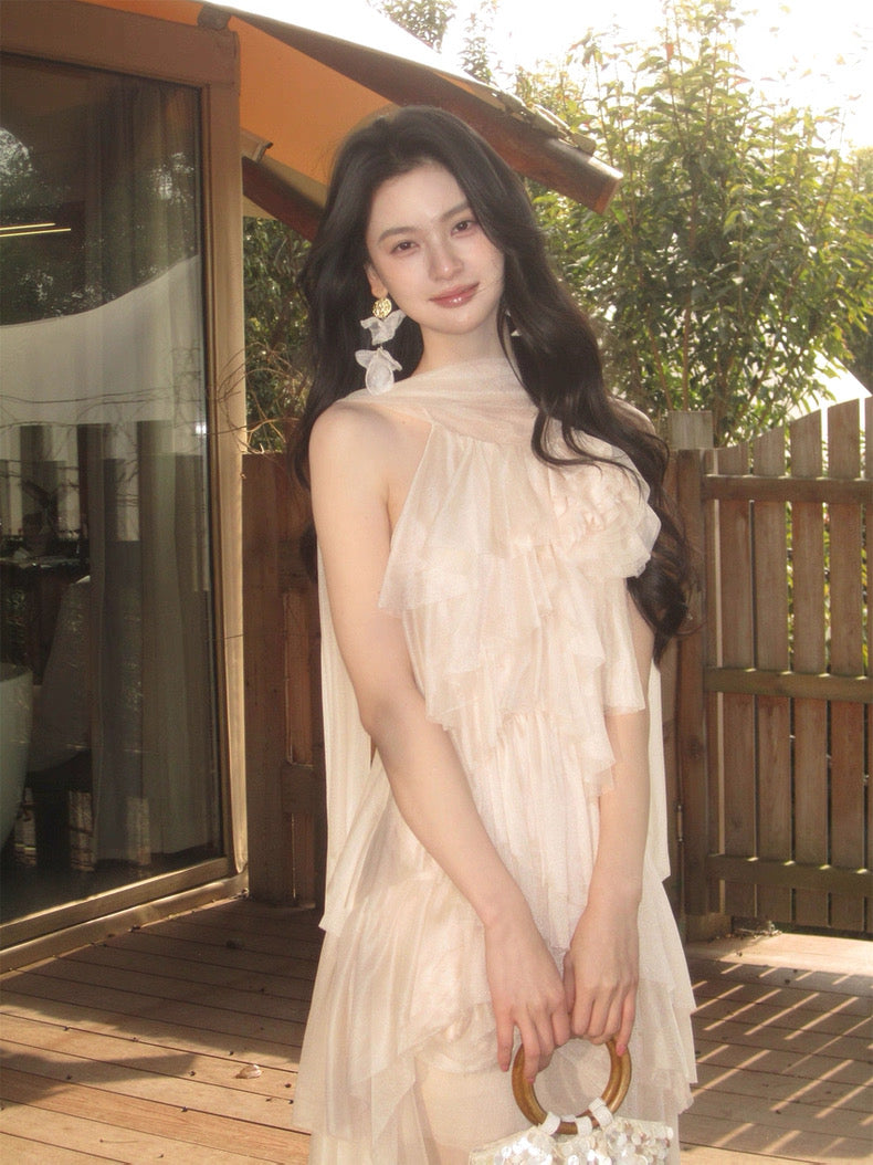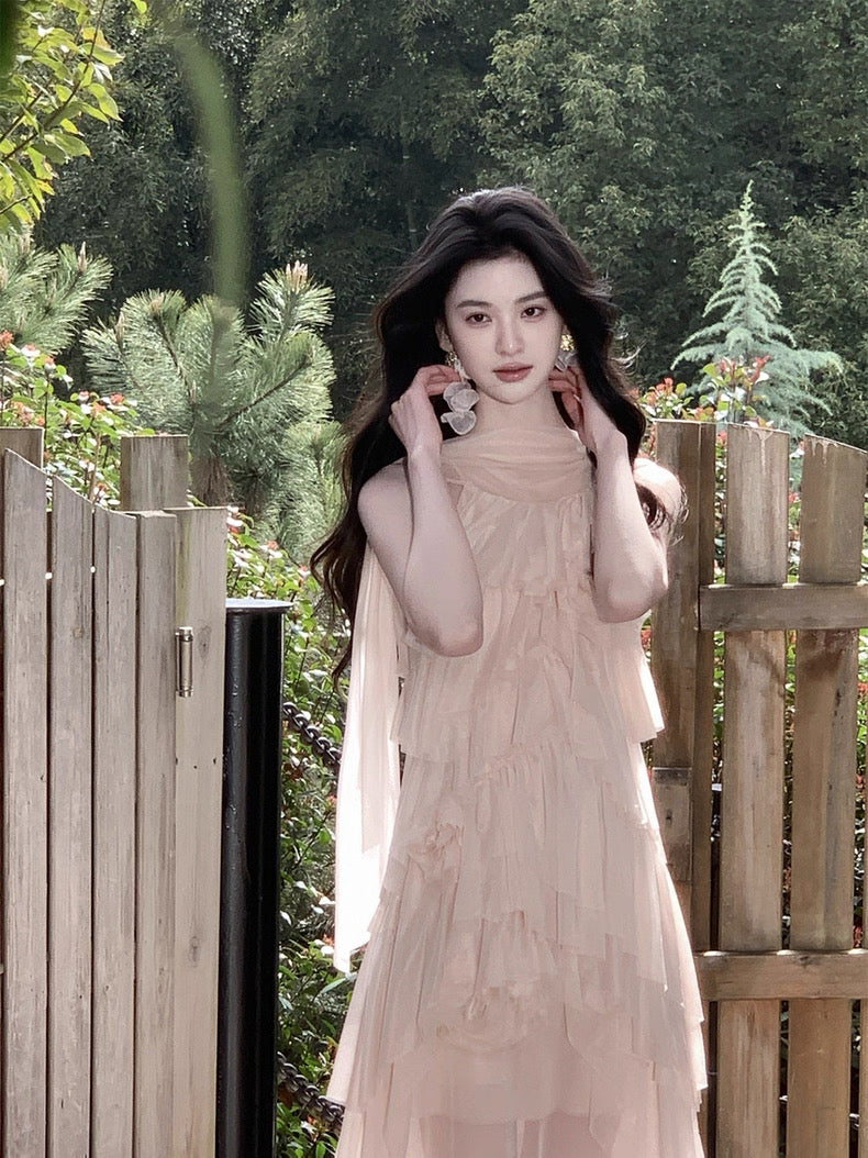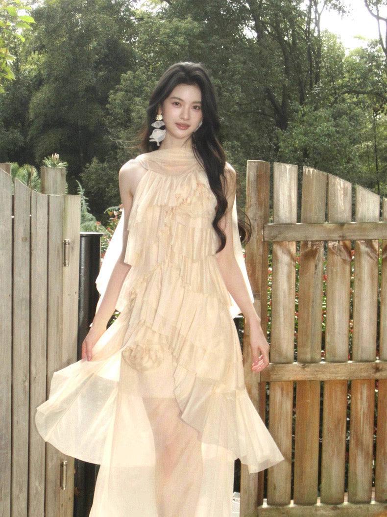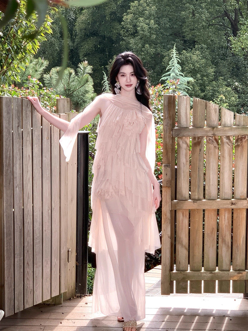 Turn around and you’ll find the trailing back ties, cinch them into a bow or let them drape loose, then watch the crystal kissed clasp catch the light for a subtle touch of sparkle. From the waist, our signature tiered “cake” skirt unfurls in airy chiffon, each layer lightly rolled at the edge so it sways like petals in a breeze.