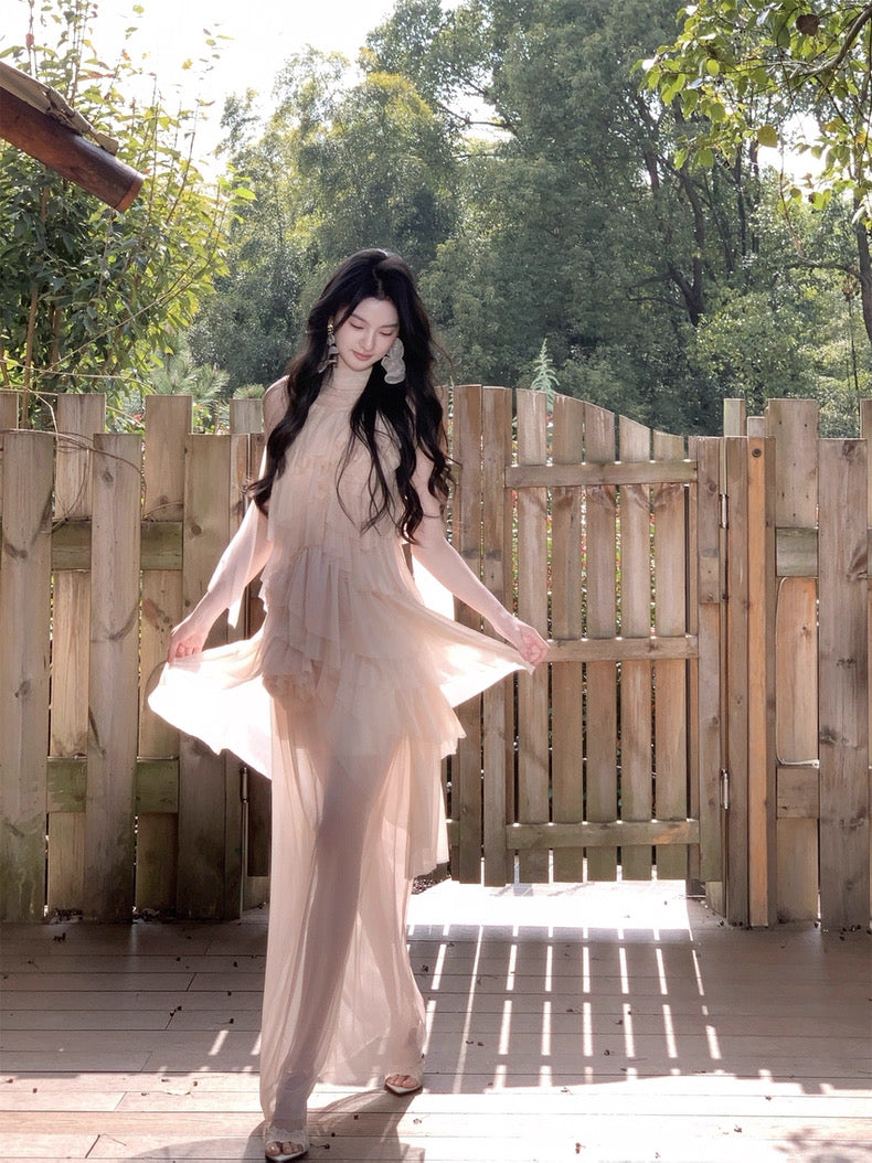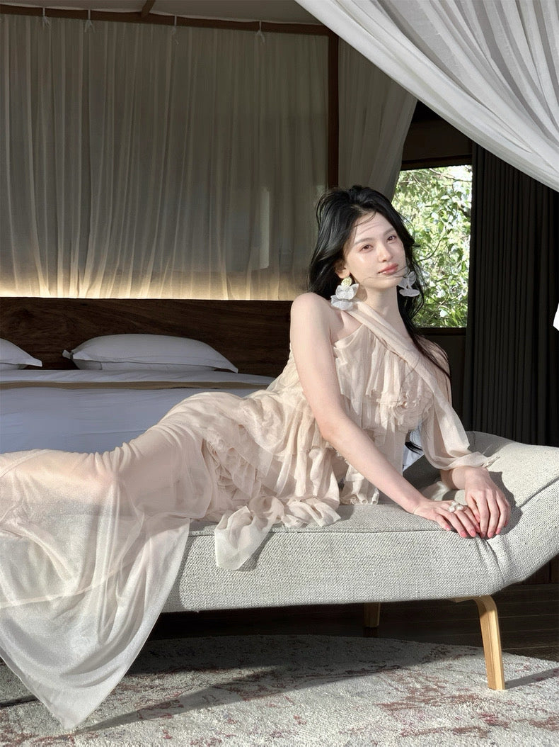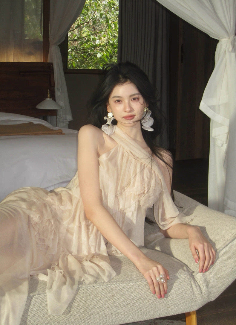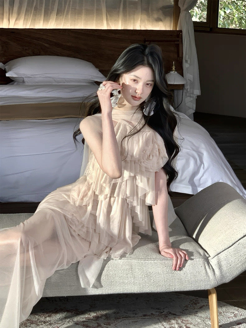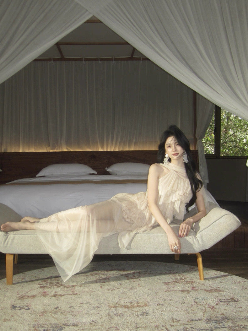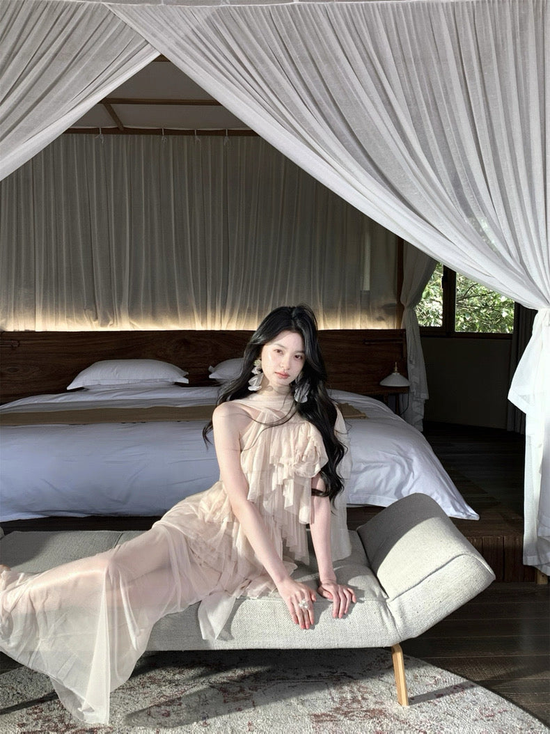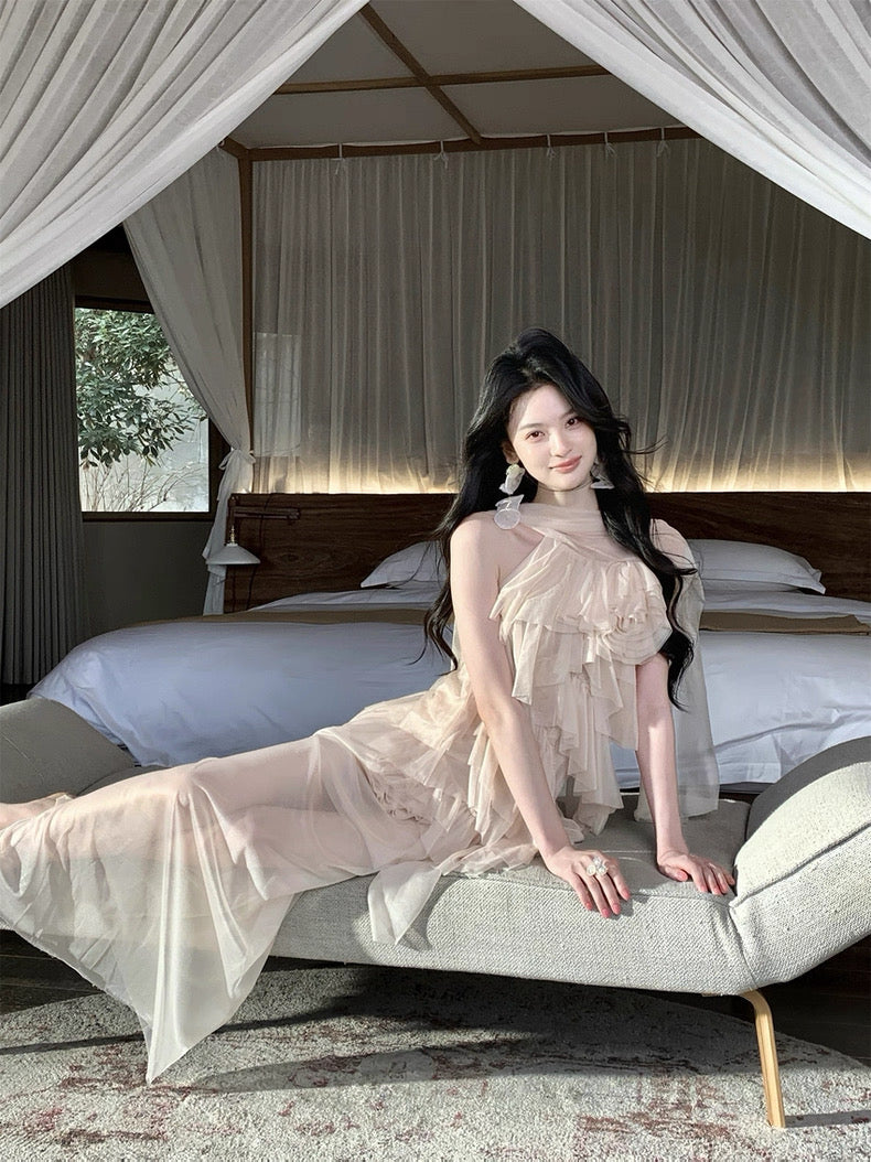 Turn around and you’ll find the trailing back ties, cinch them into a bow or let them drape loose, then watch the crystal kissed clasp catch the light for a subtle touch of sparkle. From the waist, our signature tiered “cake” skirt unfurls in airy chiffon, each layer lightly rolled at the edge so it sways like petals in a breeze.