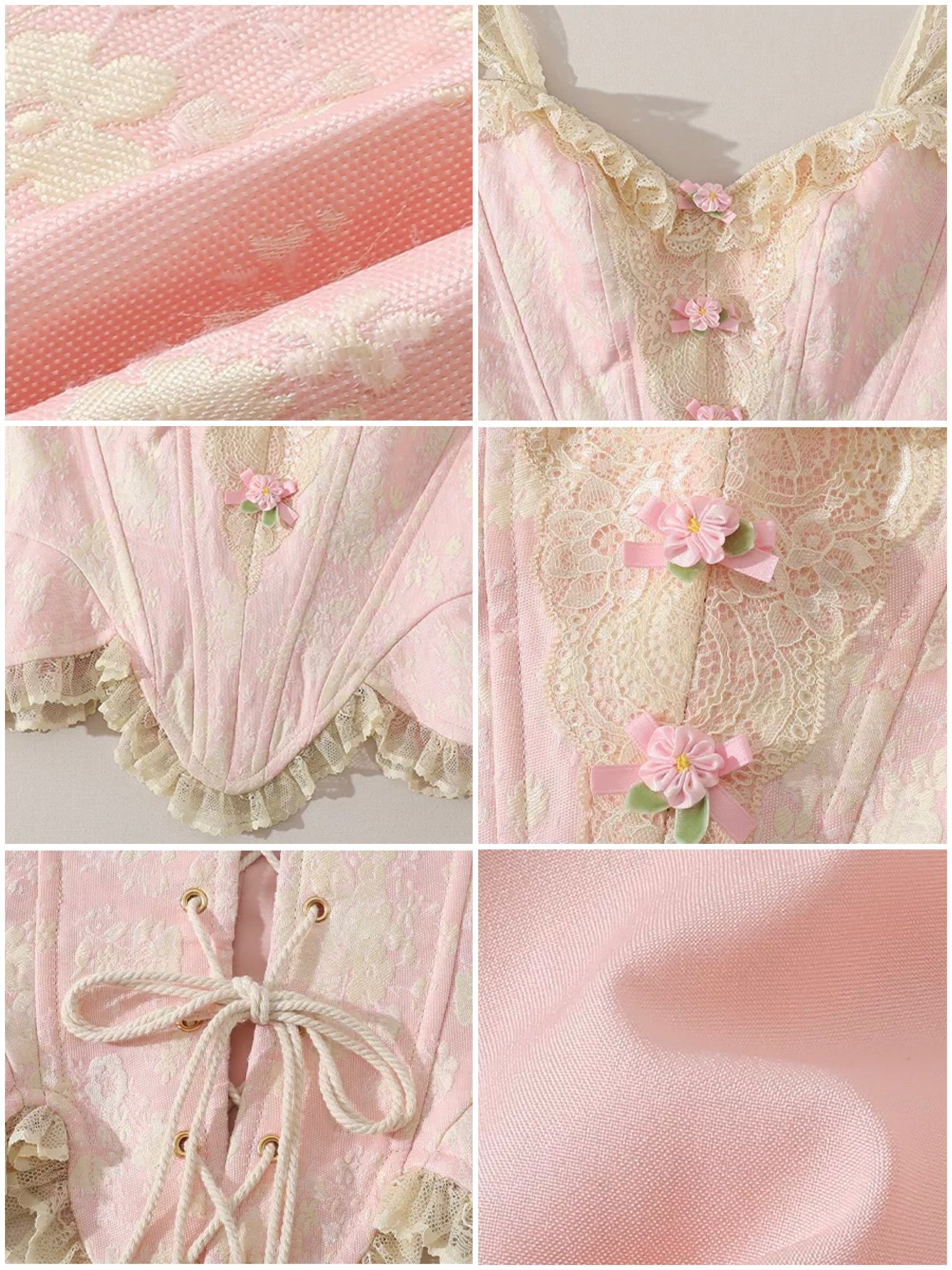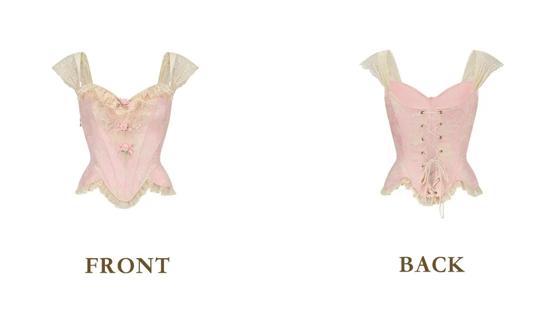 Designed with a flattering sweetheart neckline, ‘Petite Rococo’ is framed with dainty lace ruffle trim that gently highlights the shoulders and neckline, while stretch lace sleeves add a timeless, airy touch that beautifully flatters the arm line. The bodice is structured with metal fishbone boning at both the front and back, offering sculpting support and that signature corseted shape we love, finished with lace trims and satin ribbon flower appliqués for an irresistibly romantic, layered look.