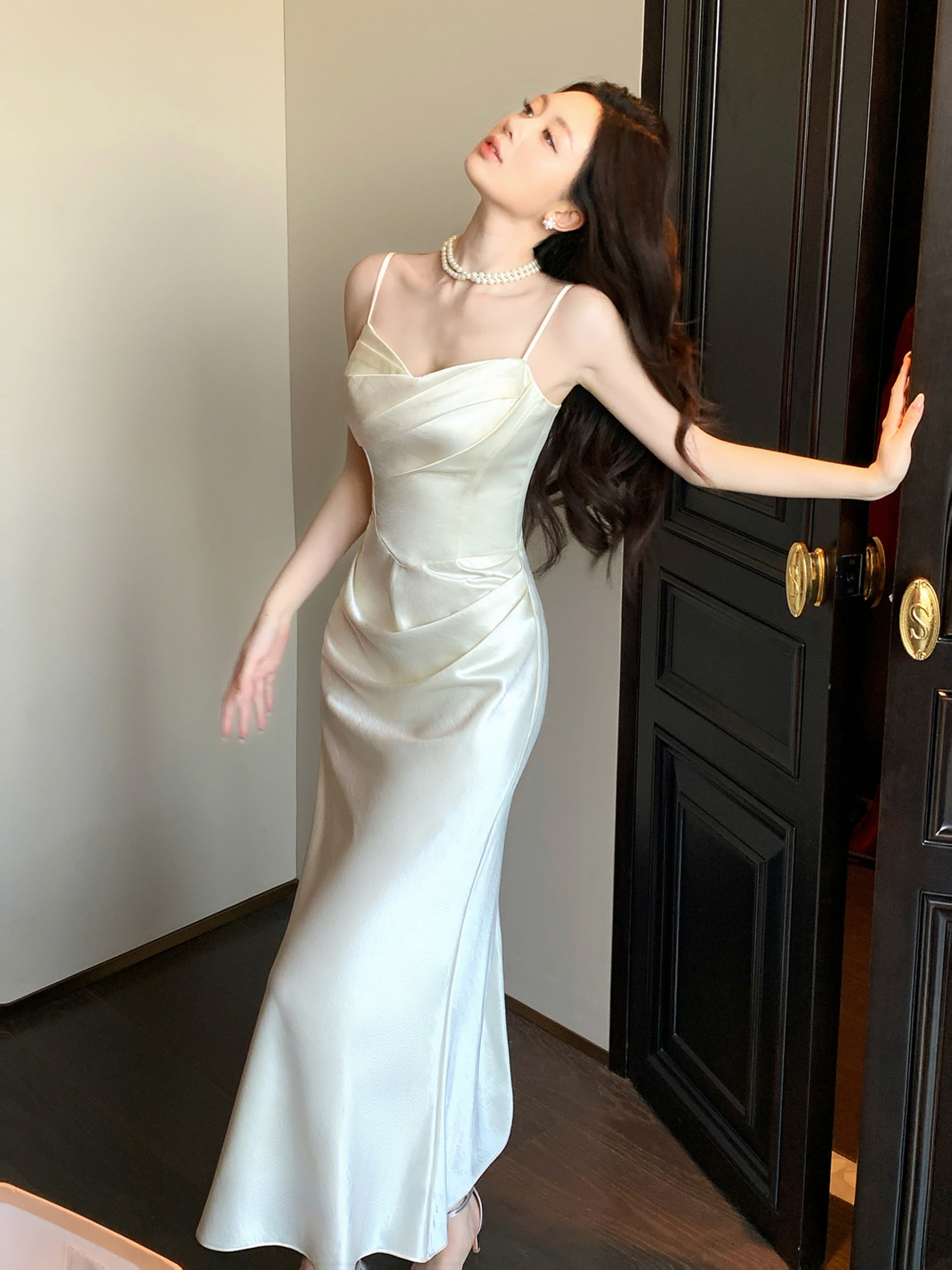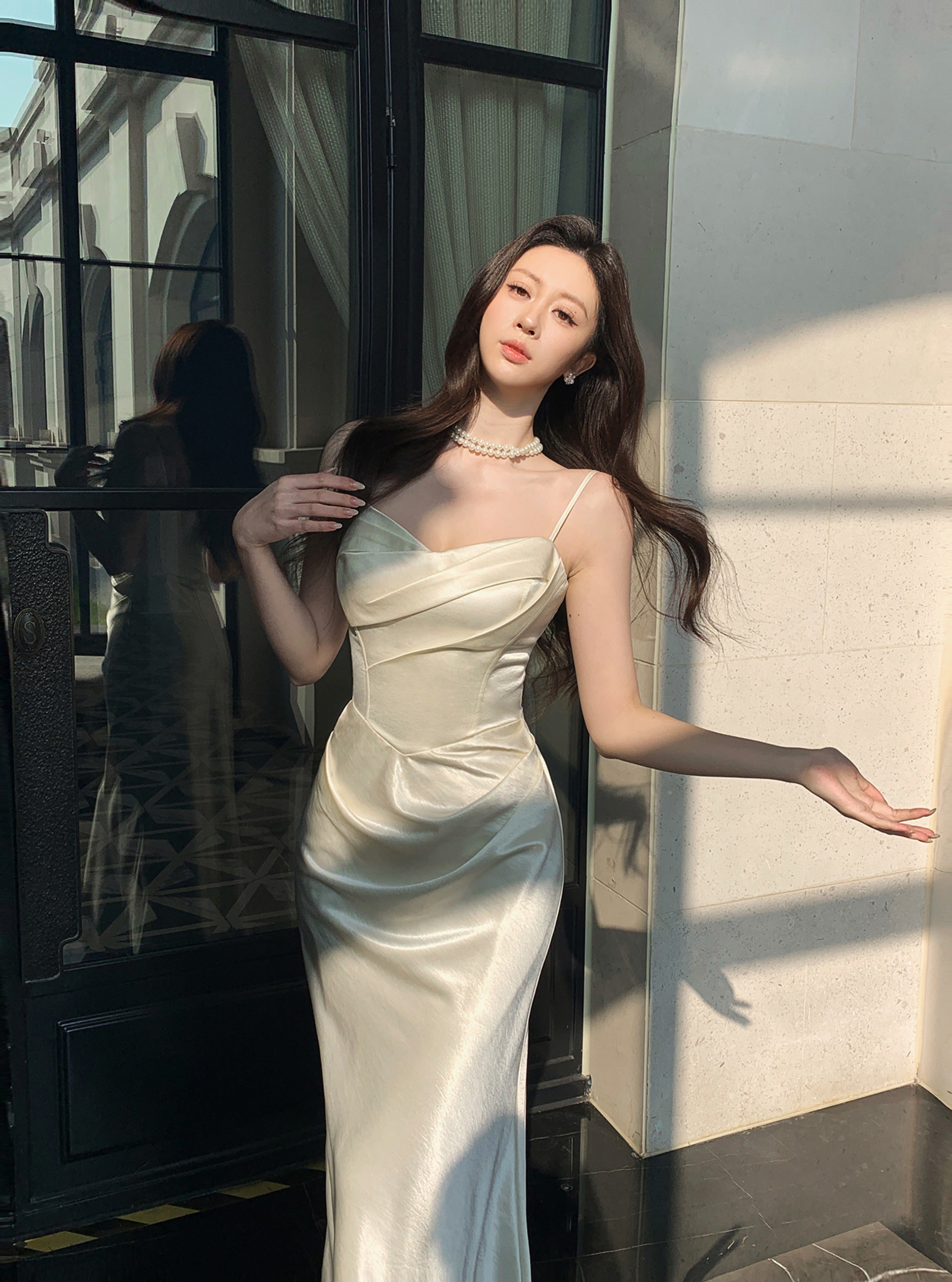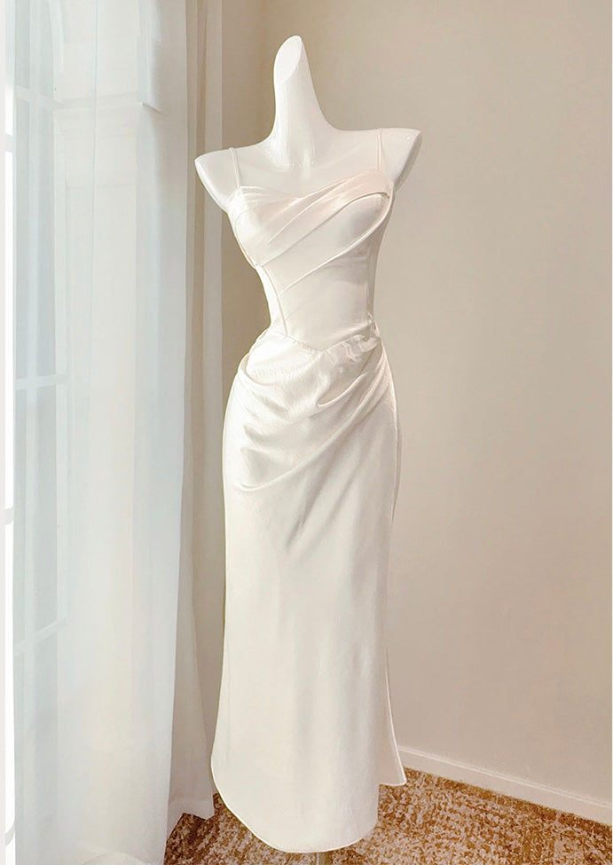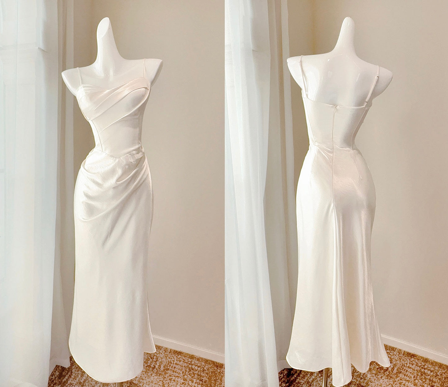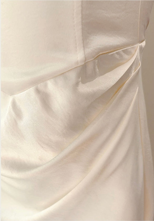 We chose a weighty, subtly lustrous cloth – think crushed starlight on pale almond to drape over the body in sculpted waves, letting asymmetrical pleats sweep from the sweetheart-sketched bodice down to a gently flared mermaid hem. The bias-cut top skims the shoulders with fine straps, frames the décolletage in an artful fold, and pairs with hidden boning that smooths the waist without stealing your breath.
