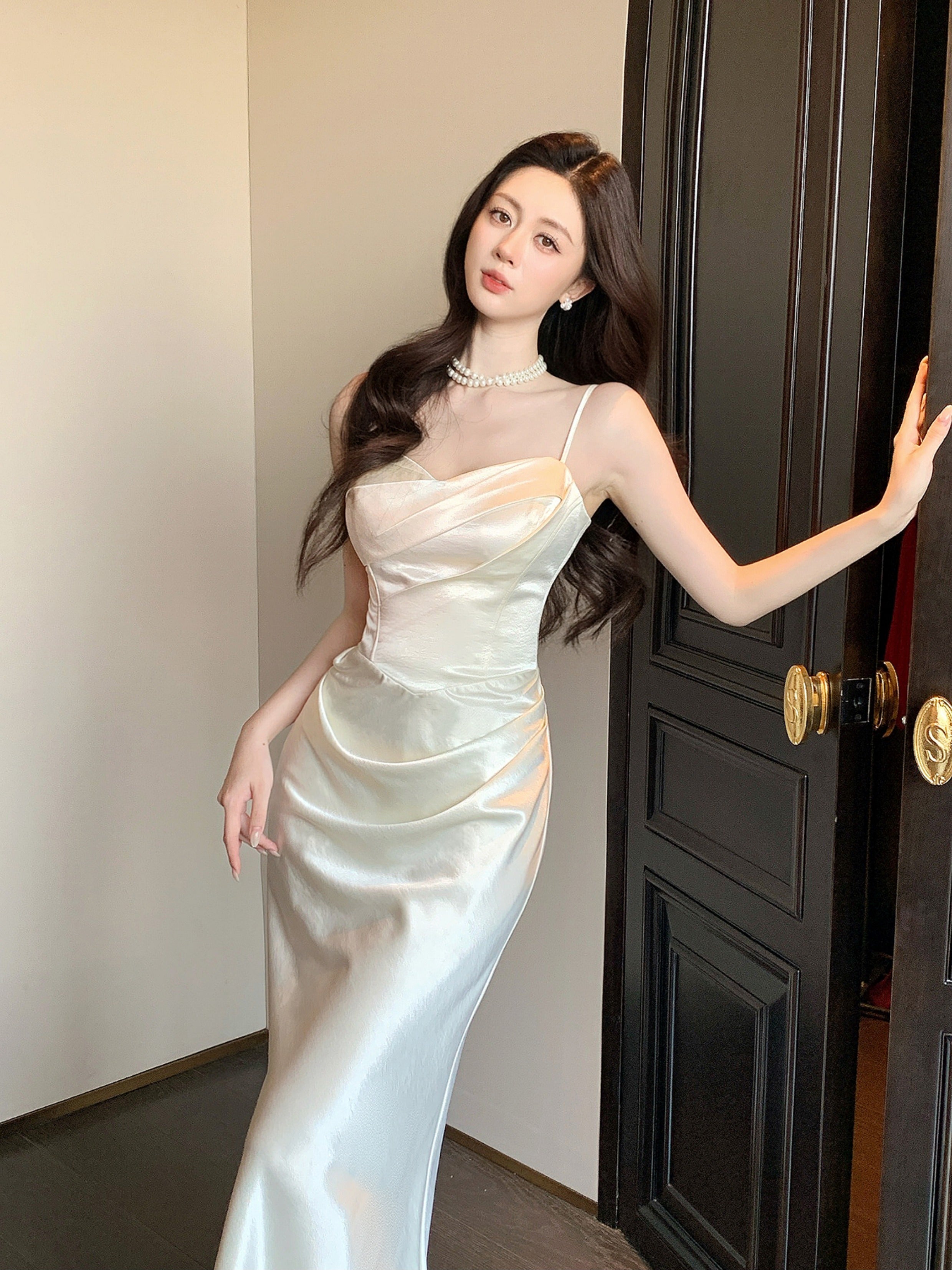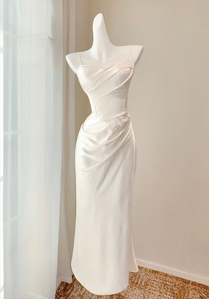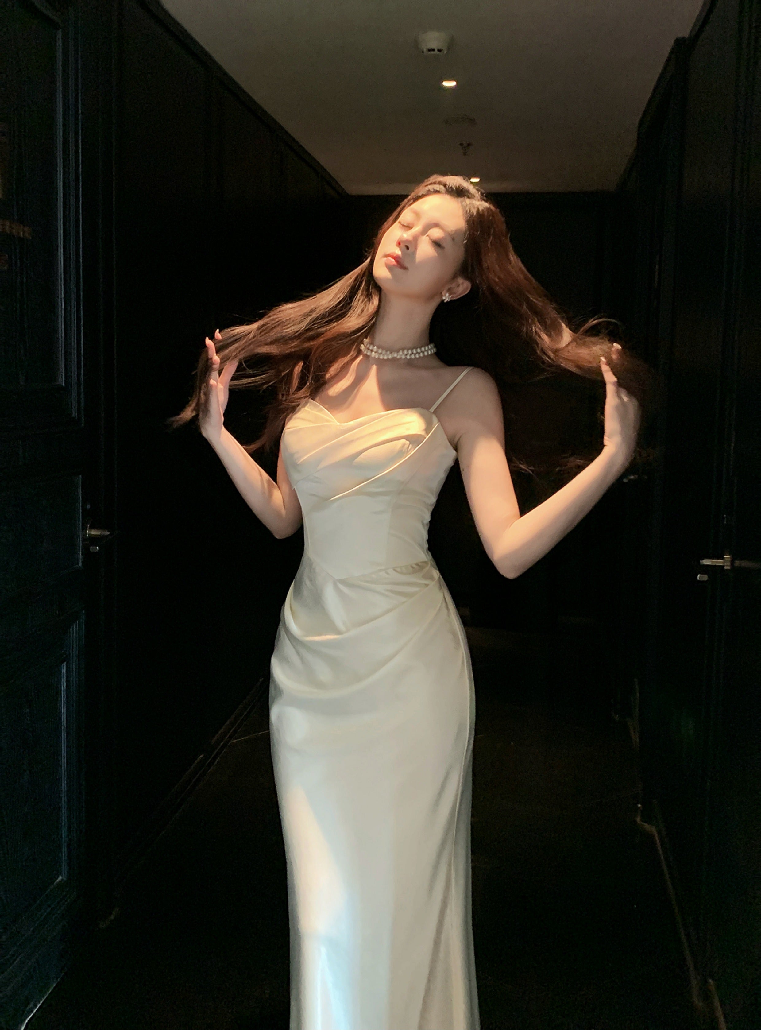 We chose a weighty, subtly lustrous cloth – think crushed starlight on pale almond to drape over the body in sculpted waves, letting asymmetrical pleats sweep from the sweetheart-sketched bodice down to a gently flared mermaid hem. The bias-cut top skims the shoulders with fine straps, frames the décolletage in an artful fold, and pairs with hidden boning that smooths the waist without stealing your breath.