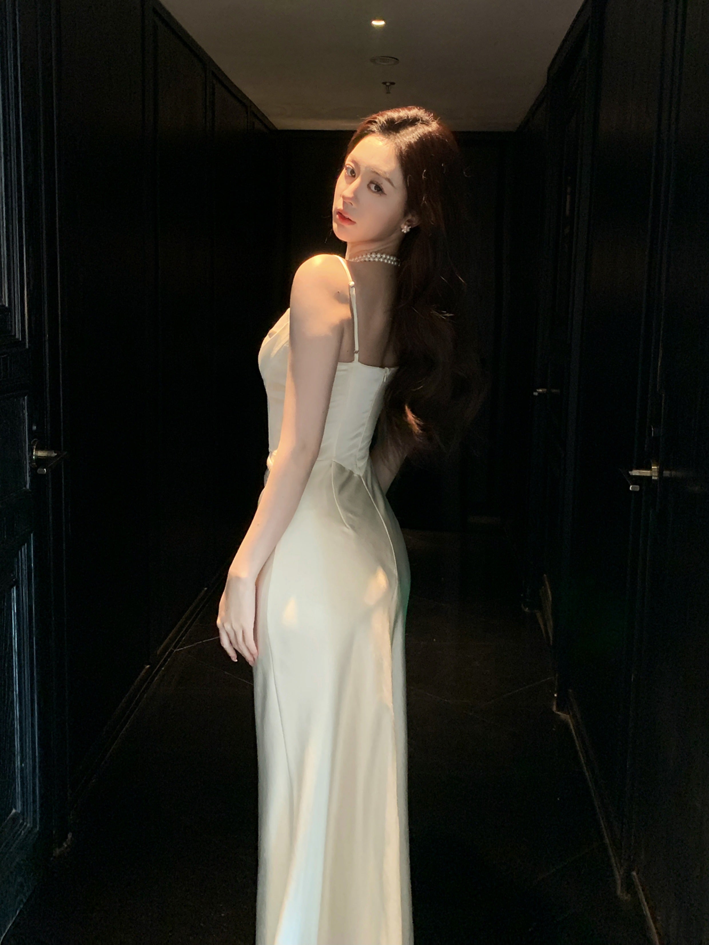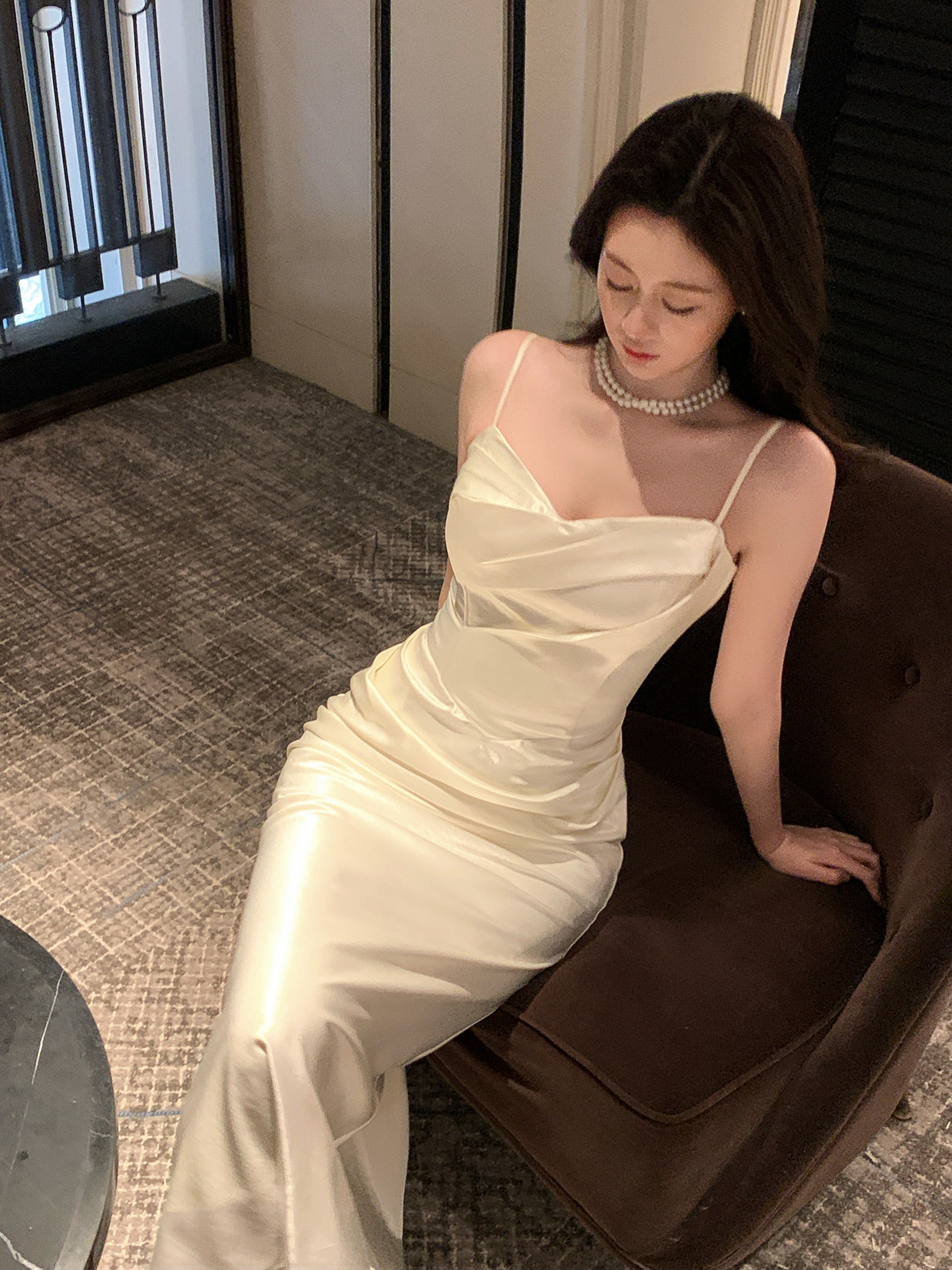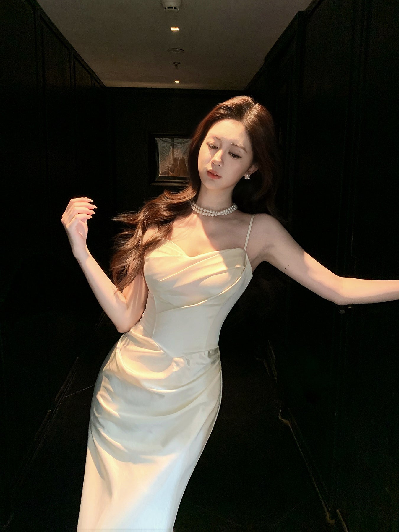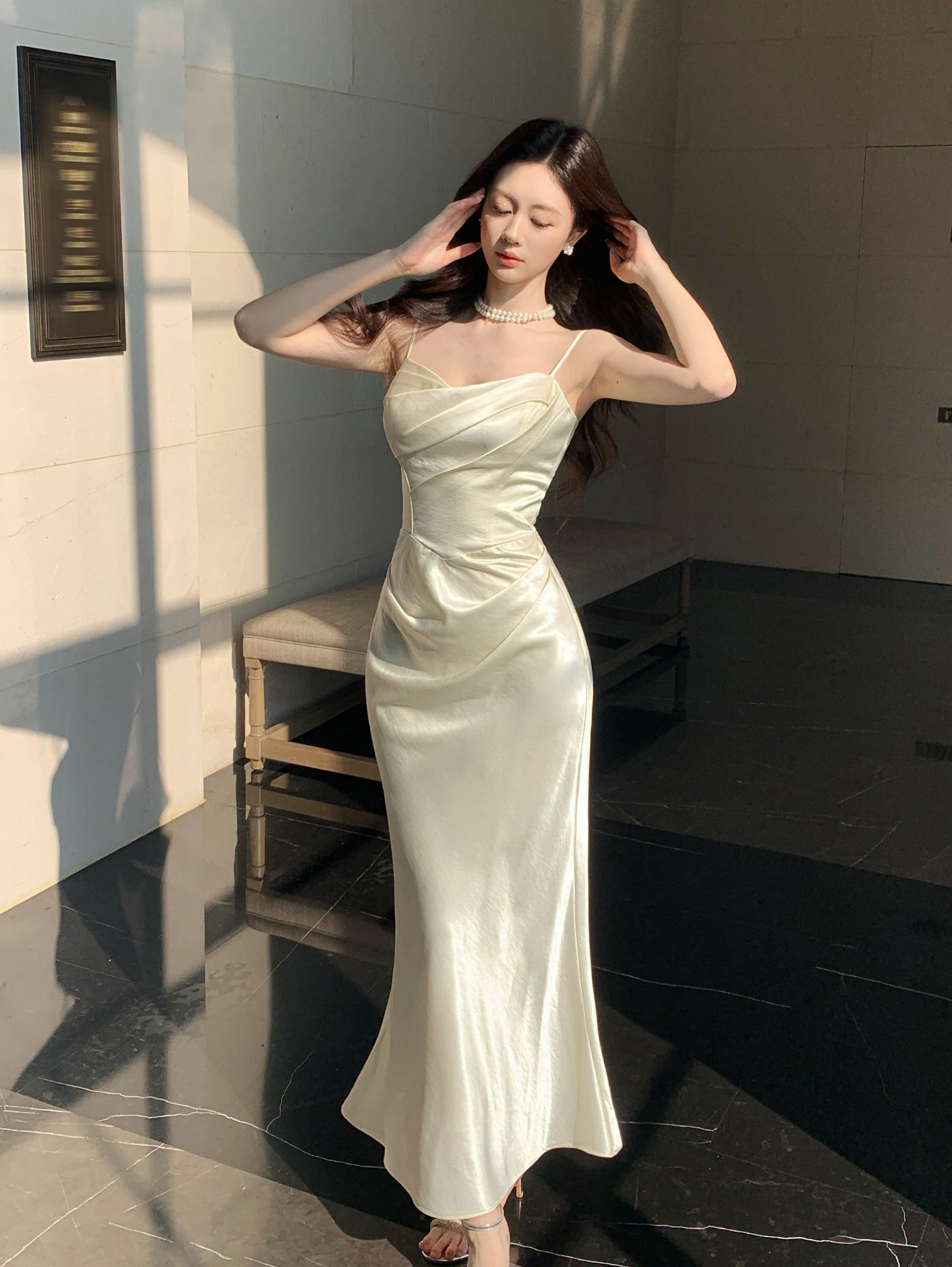 We chose a weighty, subtly lustrous cloth – think crushed starlight on pale almond to drape over the body in sculpted waves, letting asymmetrical pleats sweep from the sweetheart-sketched bodice down to a gently flared mermaid hem. The bias-cut top skims the shoulders with fine straps, frames the décolletage in an artful fold, and pairs with hidden boning that smooths the waist without stealing your breath.