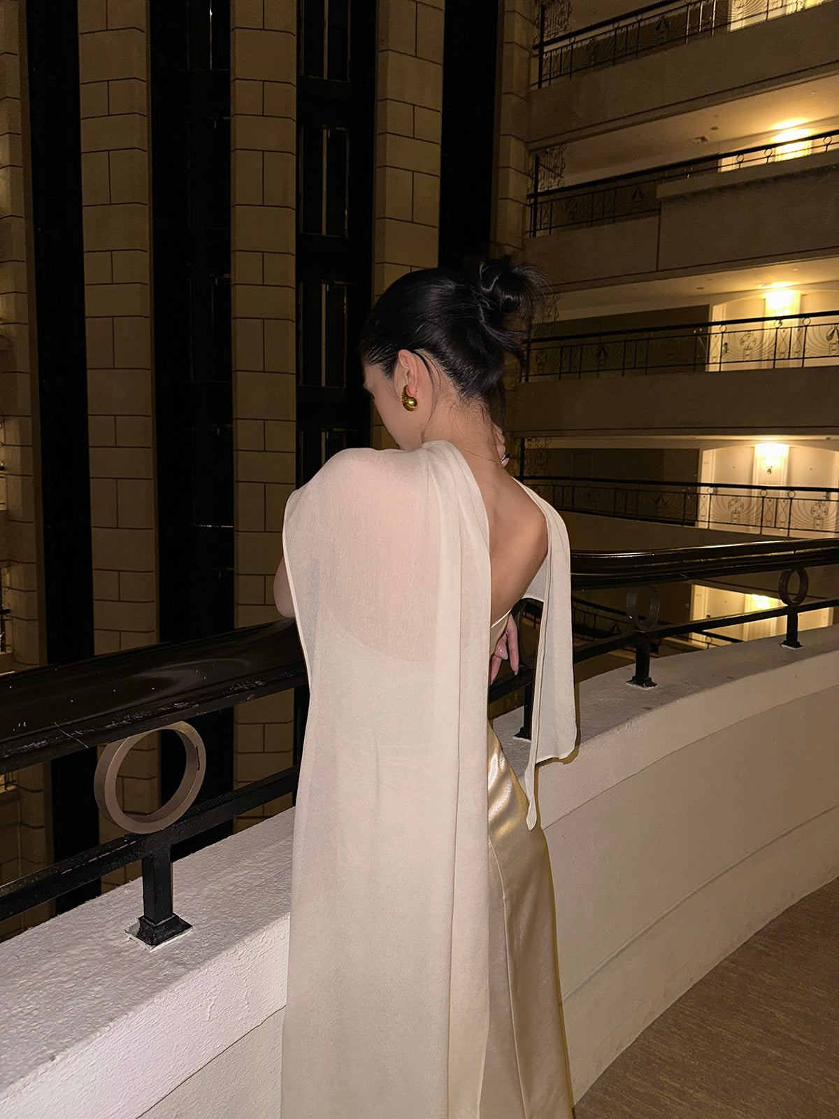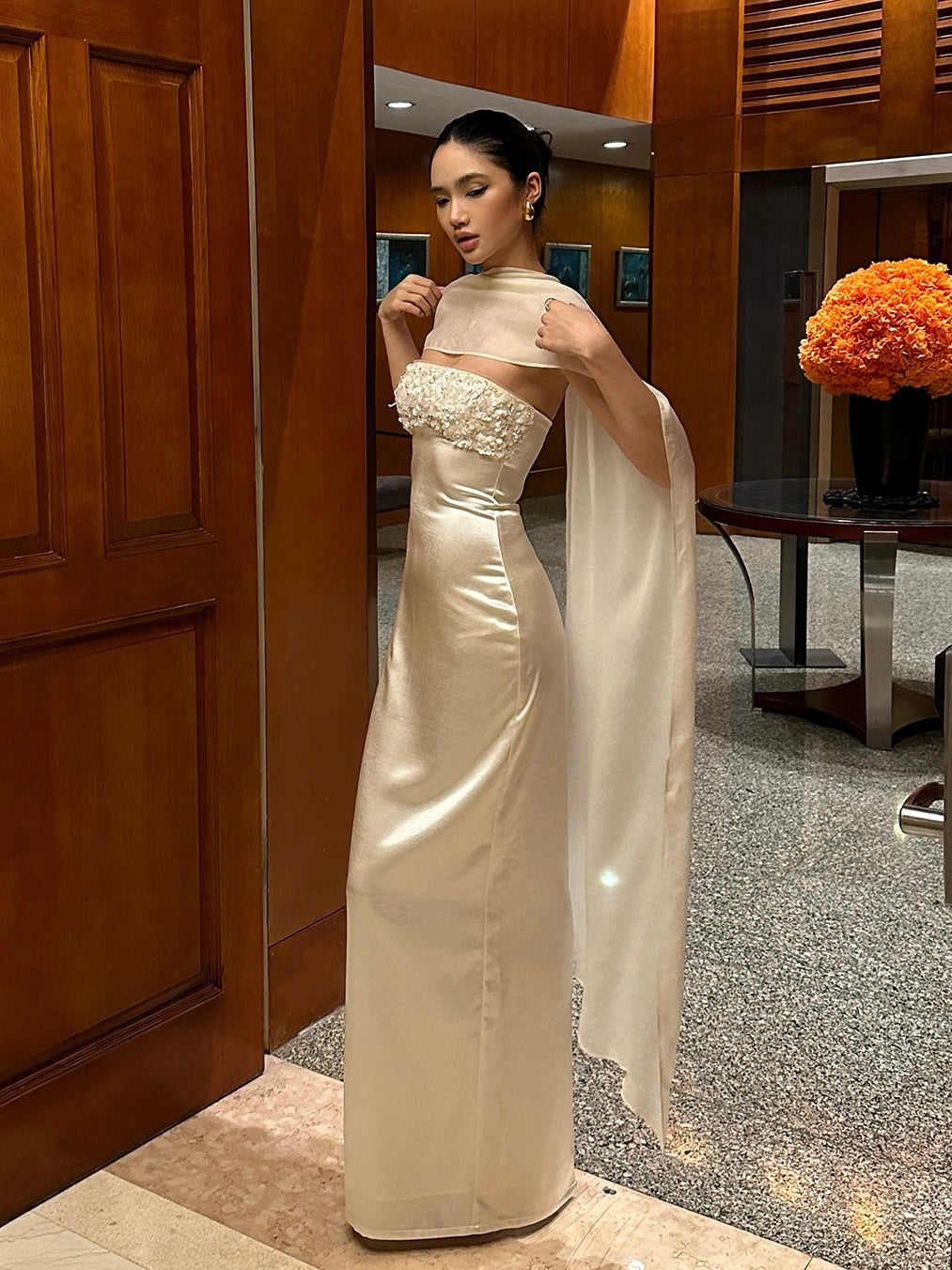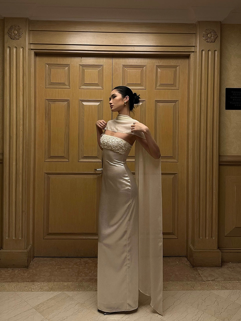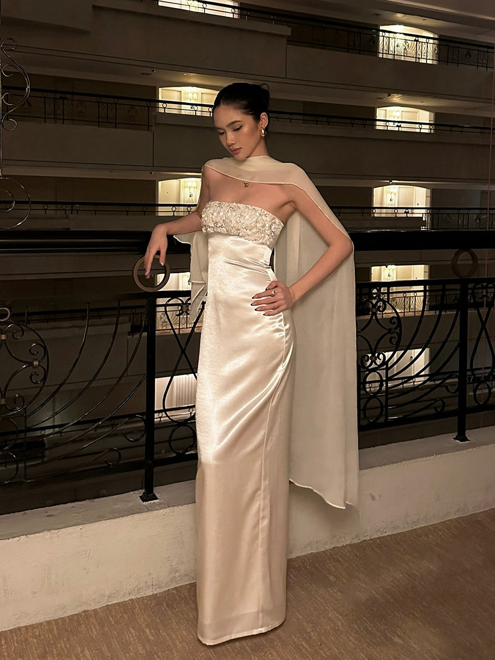 Our favorite detail? The matching silk-chiffon stole. You can drape it around your arms, let it trail behind you, or wrap it high like a regal shawl – it catches the light beautifully and adds that dramatic flourish we love.