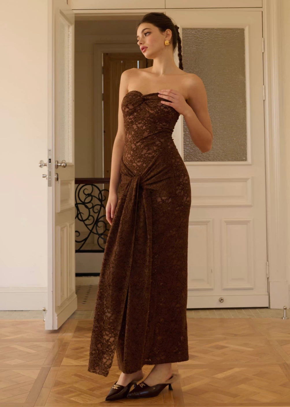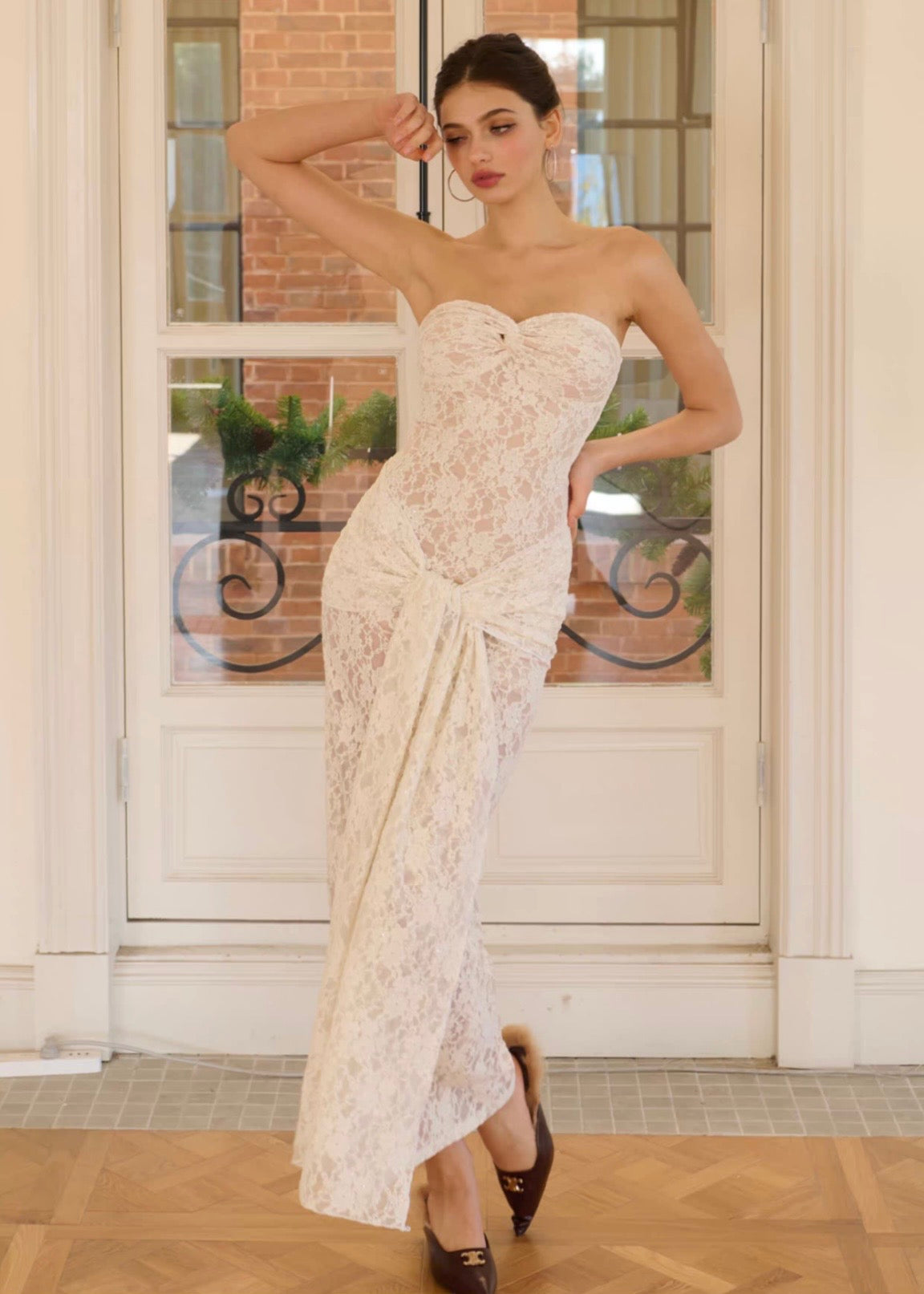 ‘Kehlani’ captures that effortless café-to-cocktail glamour we crave – think sculpted lace, a whisper of skin, and just enough stretch to glide with every stride. The strapless sweetheart bodice gathers softly at the center, framing your décolletage while gentle boning and a hidden lining keep everything sleek and secure.