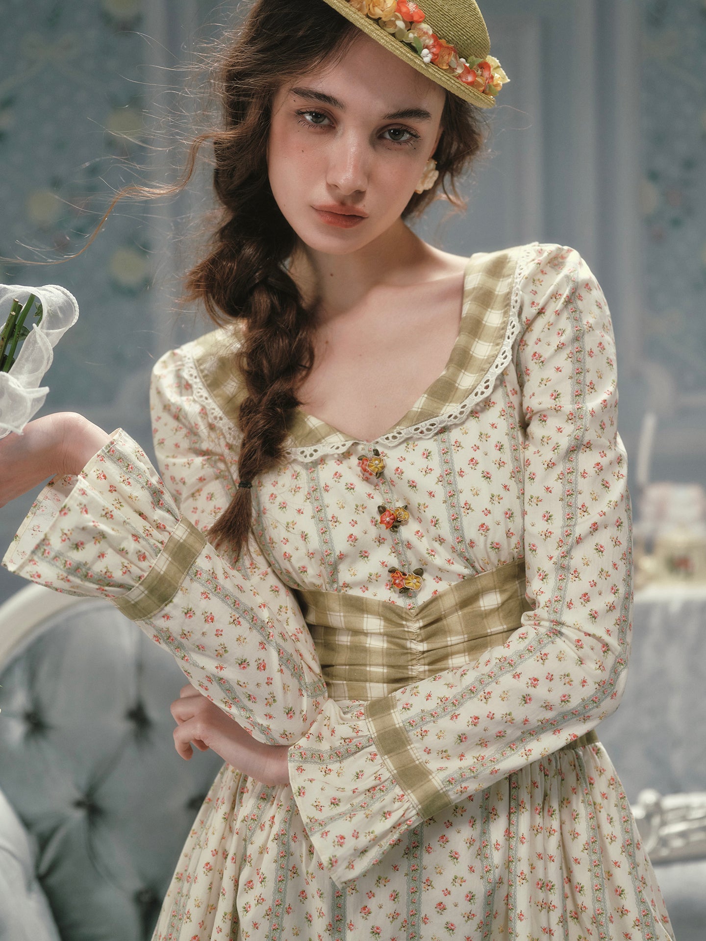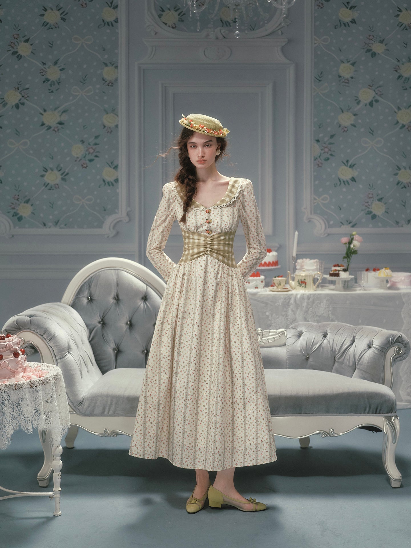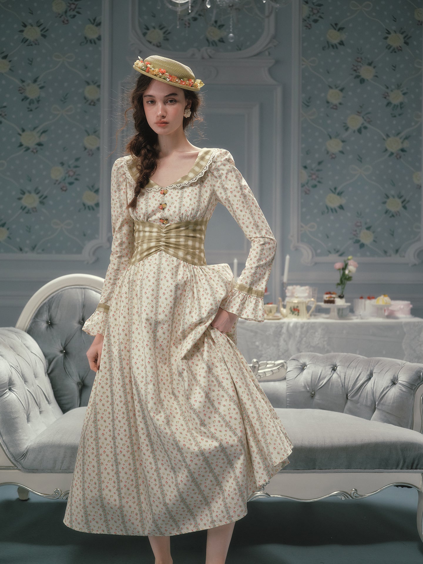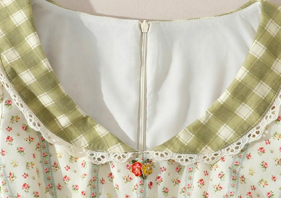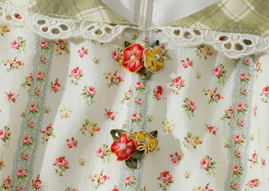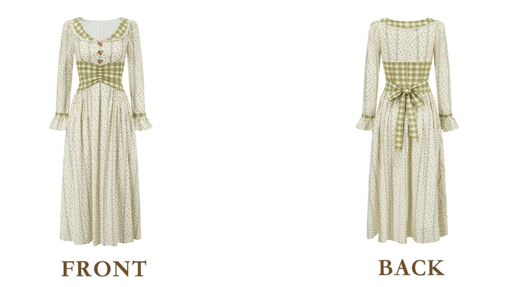Cut from airy, all-cotton micro-floral and lined for comfort, ‘Linnéa’ keeps things light while a sage-gingham waist panel gathers in at the center, cinching softly and flaring into a full, swishable skirt that skims the calves with every step. The scoop neckline is edged in dainty lace, and tiny hand-painted blossom buttons run down the bodice – because those little details matter, right?