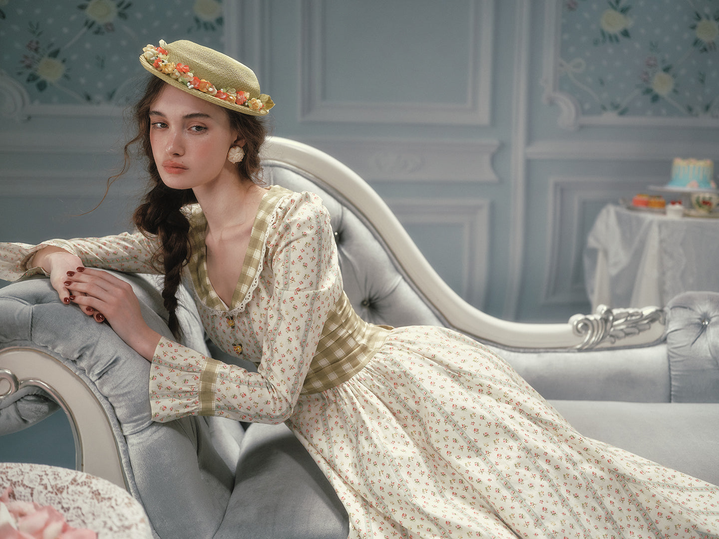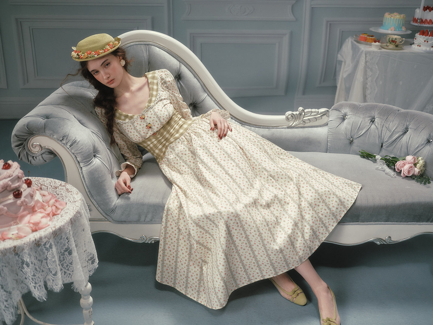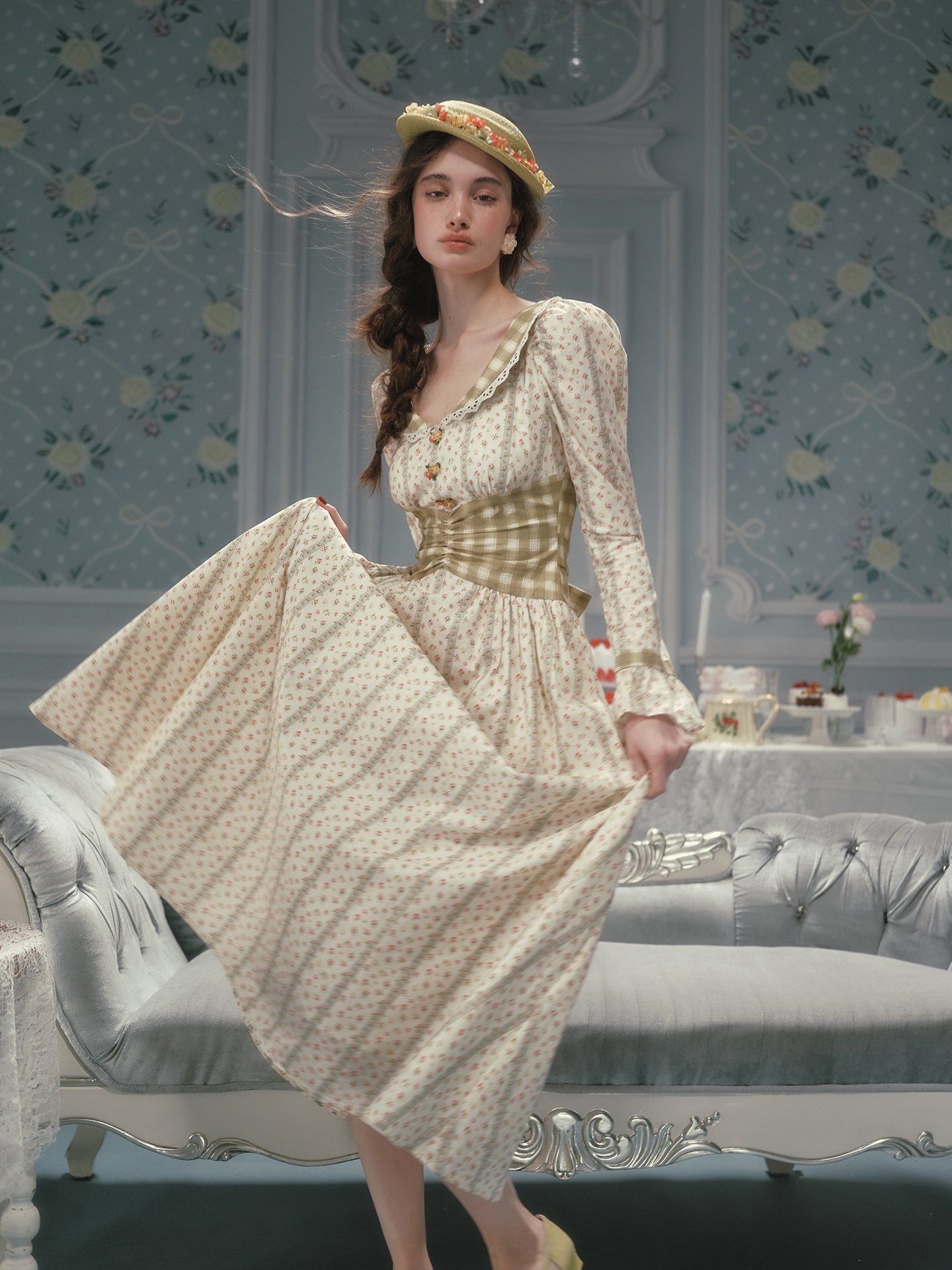 Cut from airy, all-cotton micro-floral and lined for comfort, ‘Linnéa’ keeps things light while a sage-gingham waist panel gathers in at the center, cinching softly and flaring into a full, swishable skirt that skims the calves with every step. The scoop neckline is edged in dainty lace, and tiny hand-painted blossom buttons run down the bodice – because those little details matter, right?