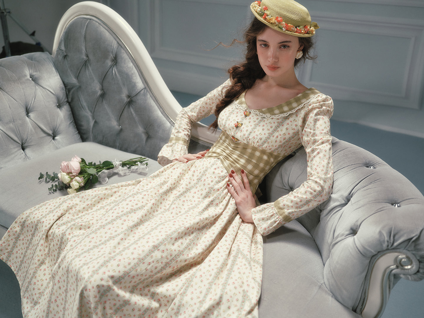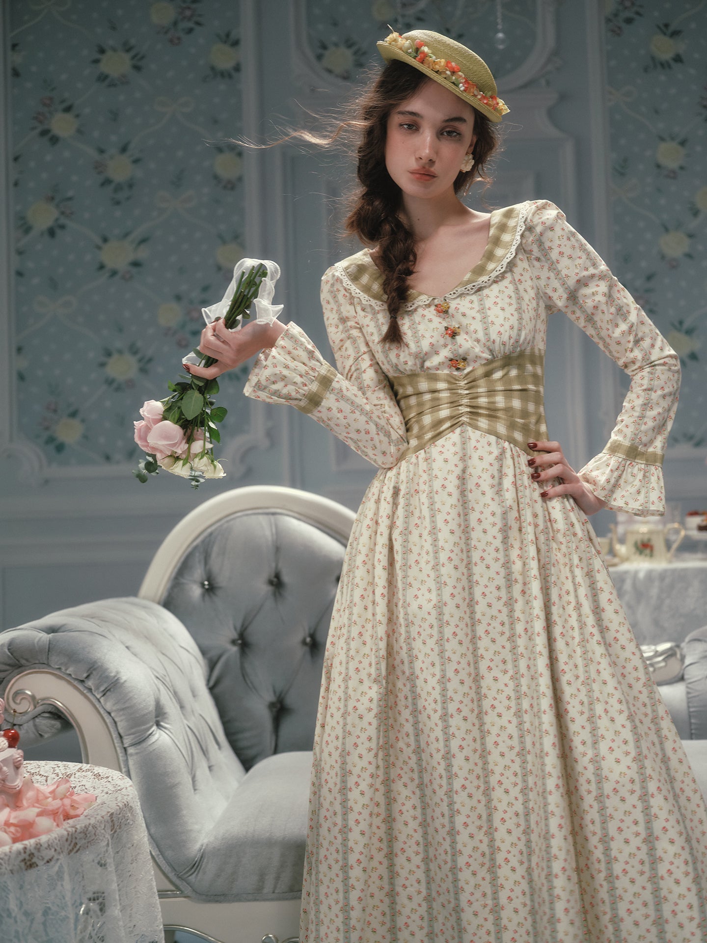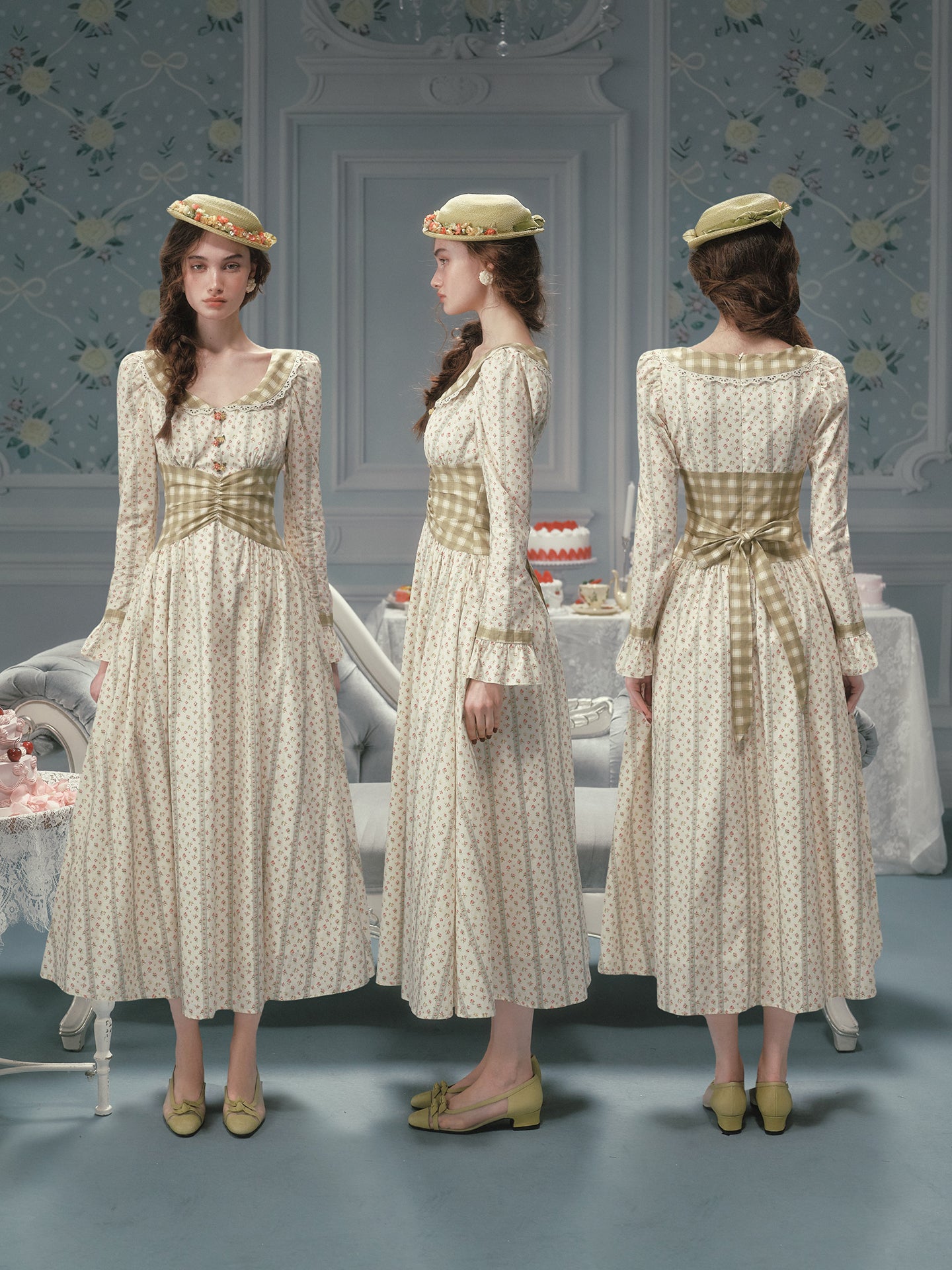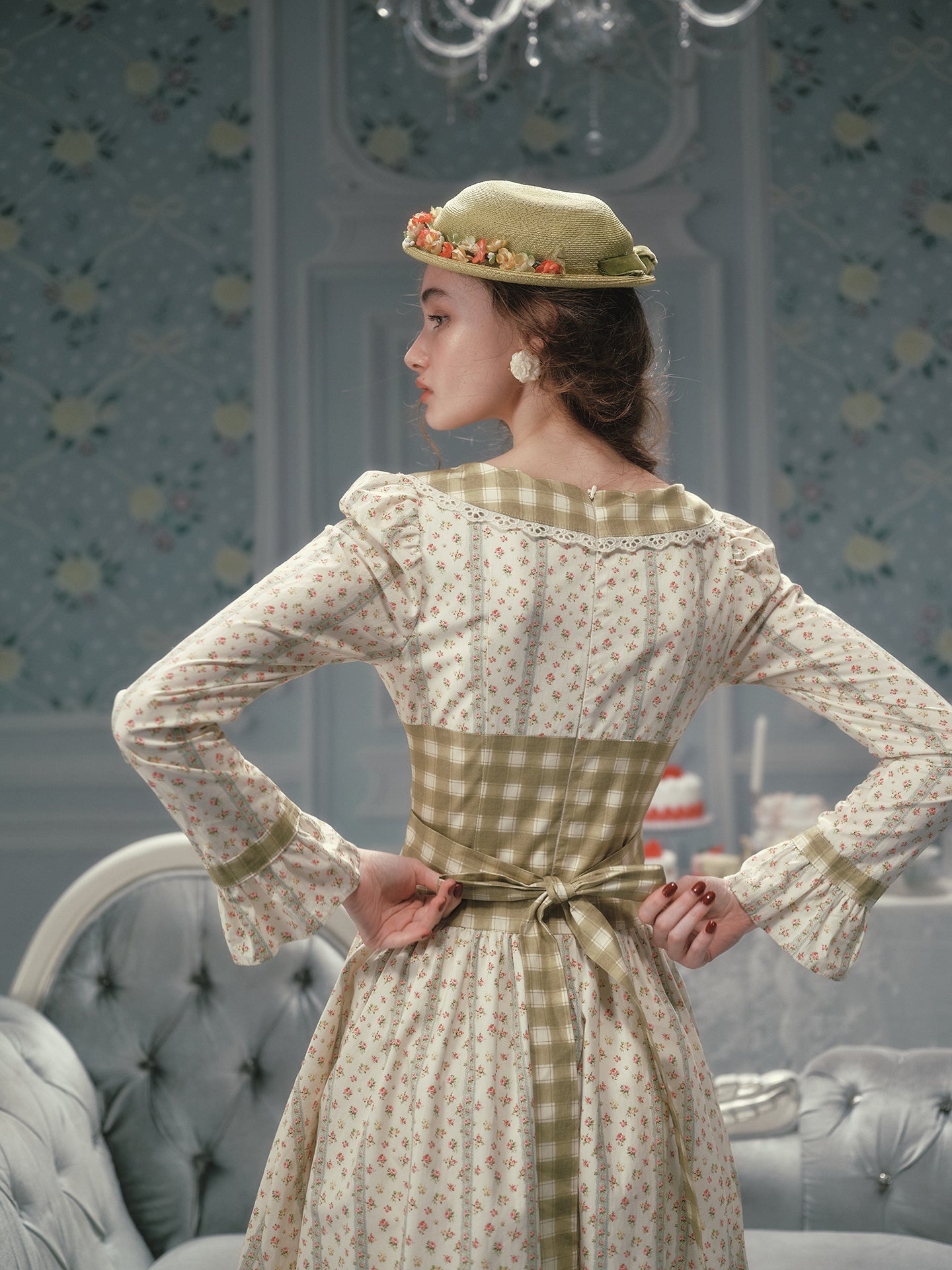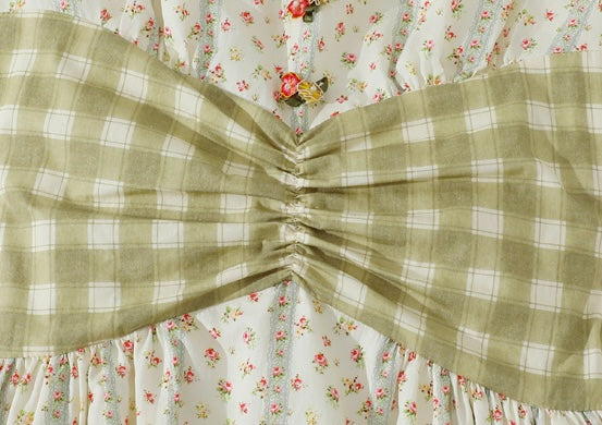 We framed the long sleeves with fluted cuffs and matching gingham trims, giving a gentle nod to cottagecore without feeling costume-y. A wide sash ties at the back (adjust it loose for brunch or snug for sunset strolls), while hidden pockets slip in at the side seams – practical magic we’ll always stand by.