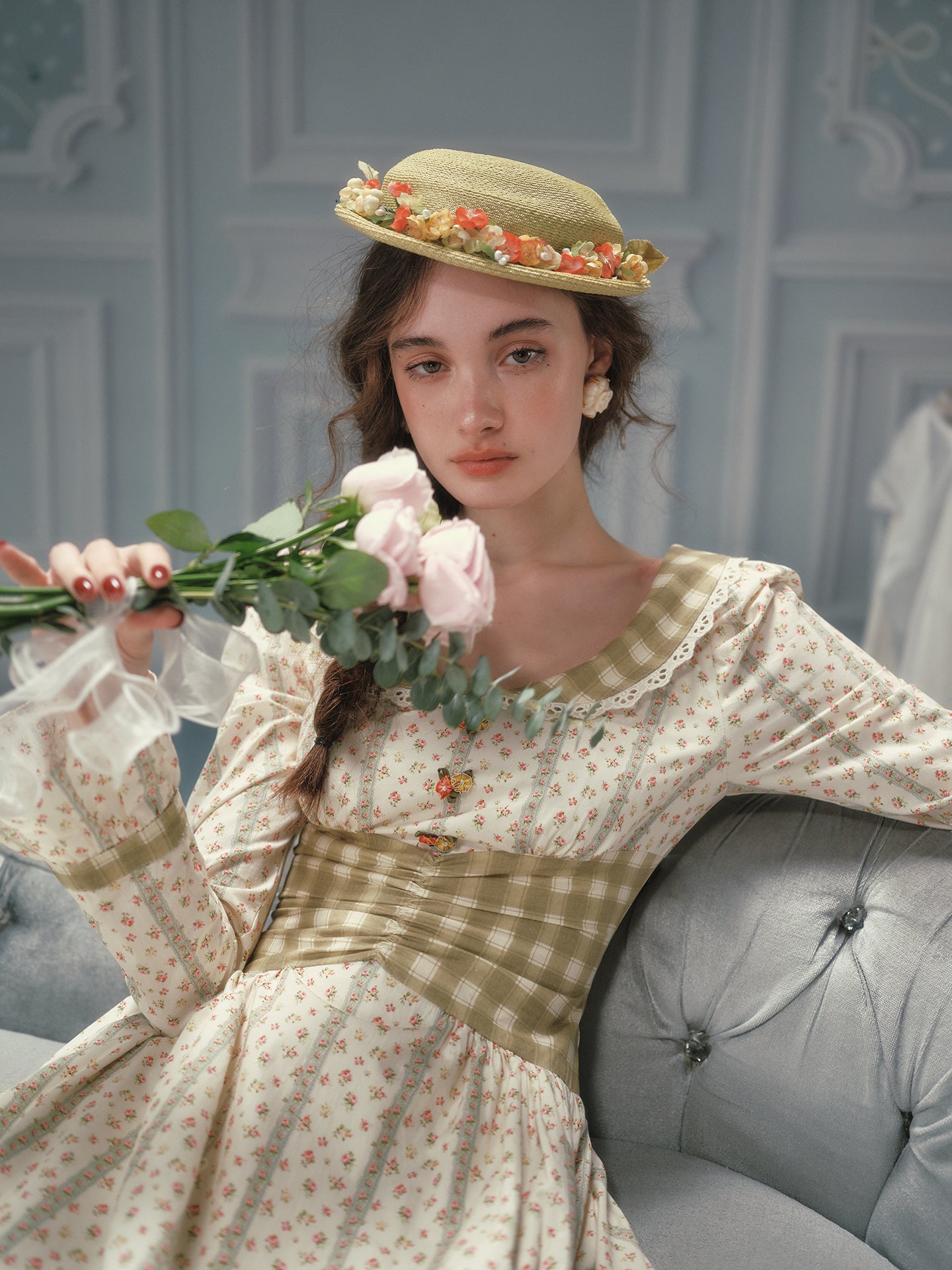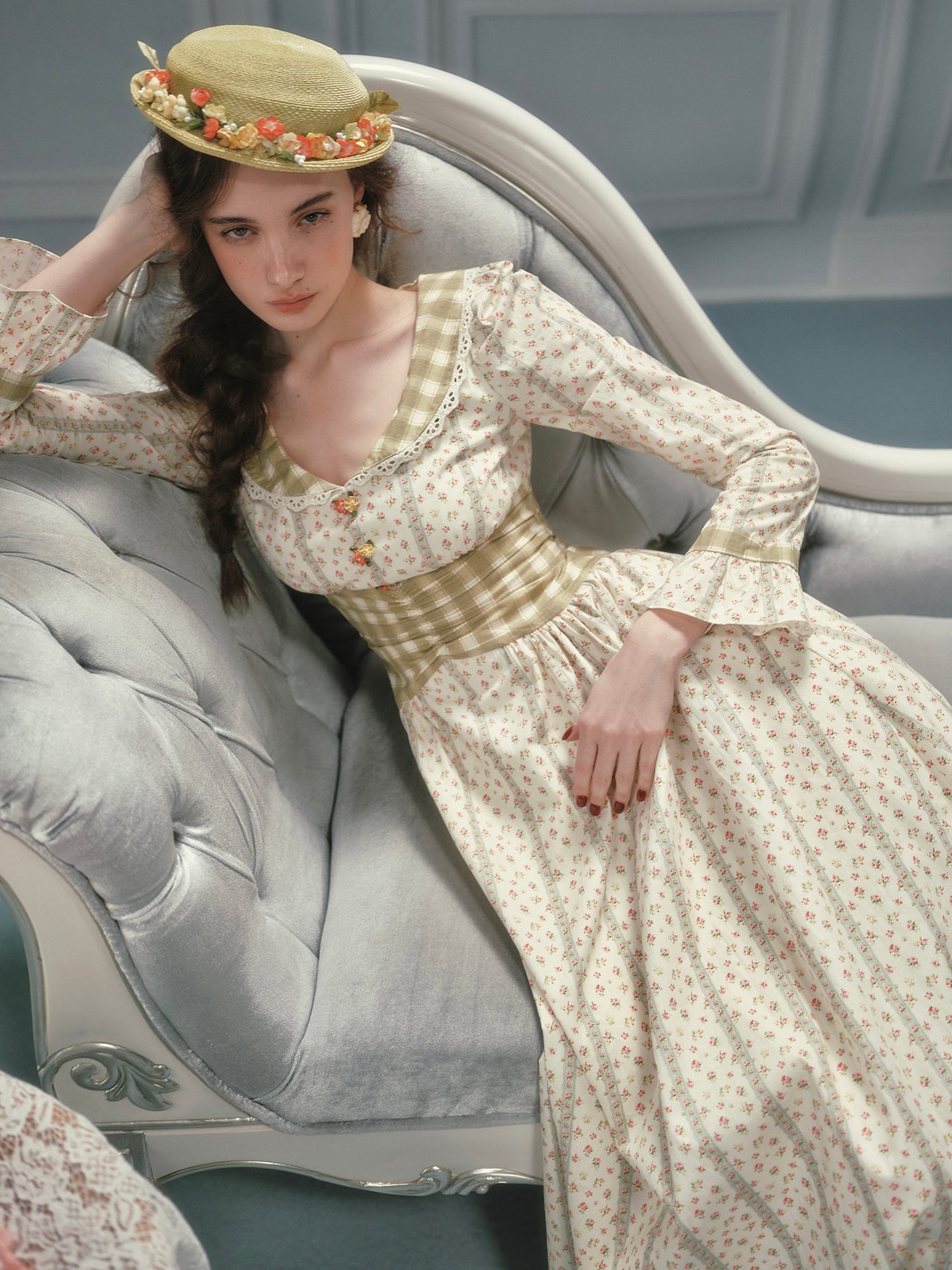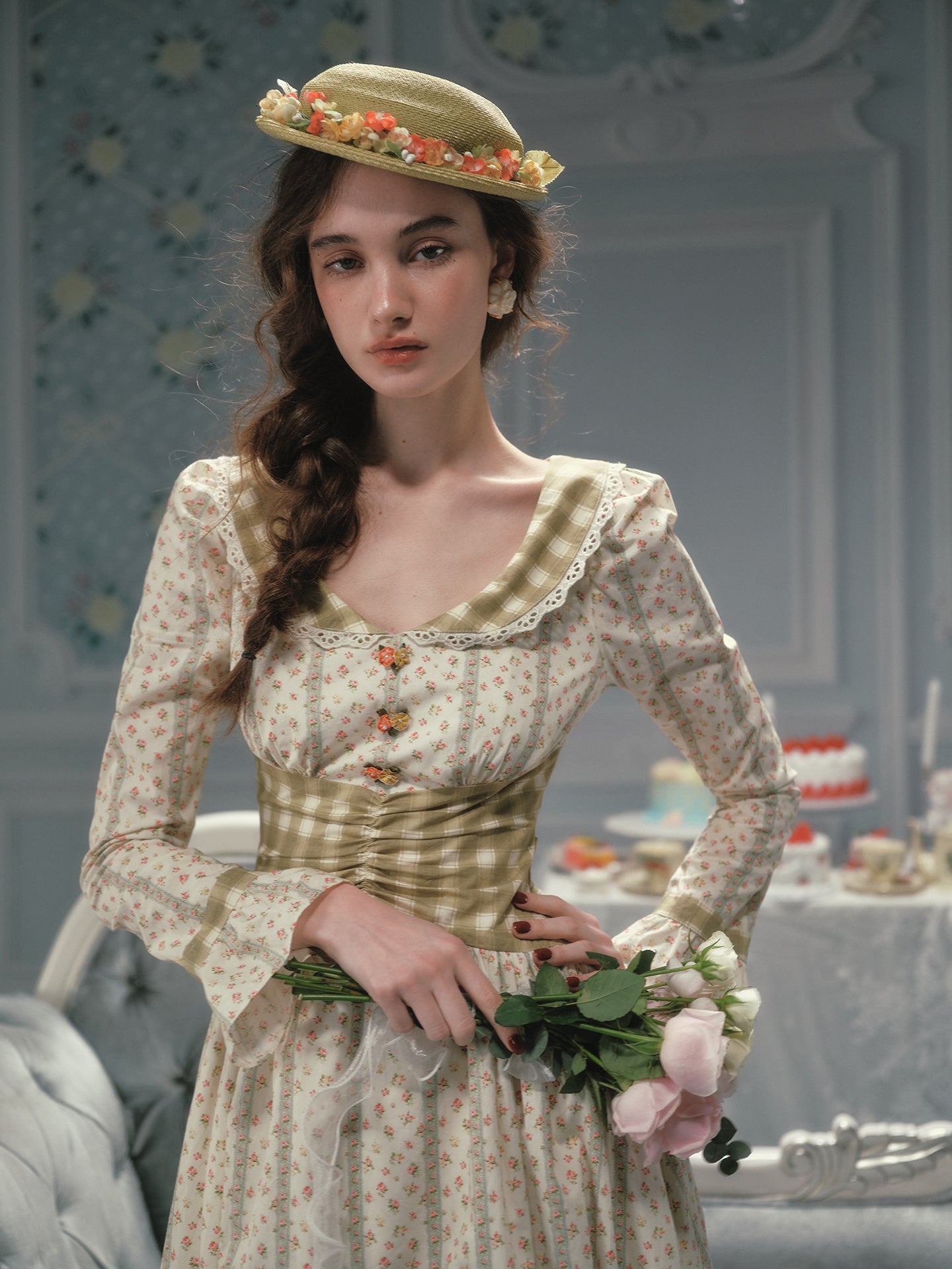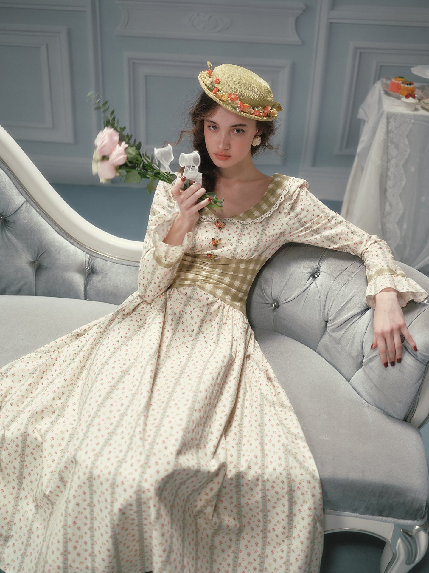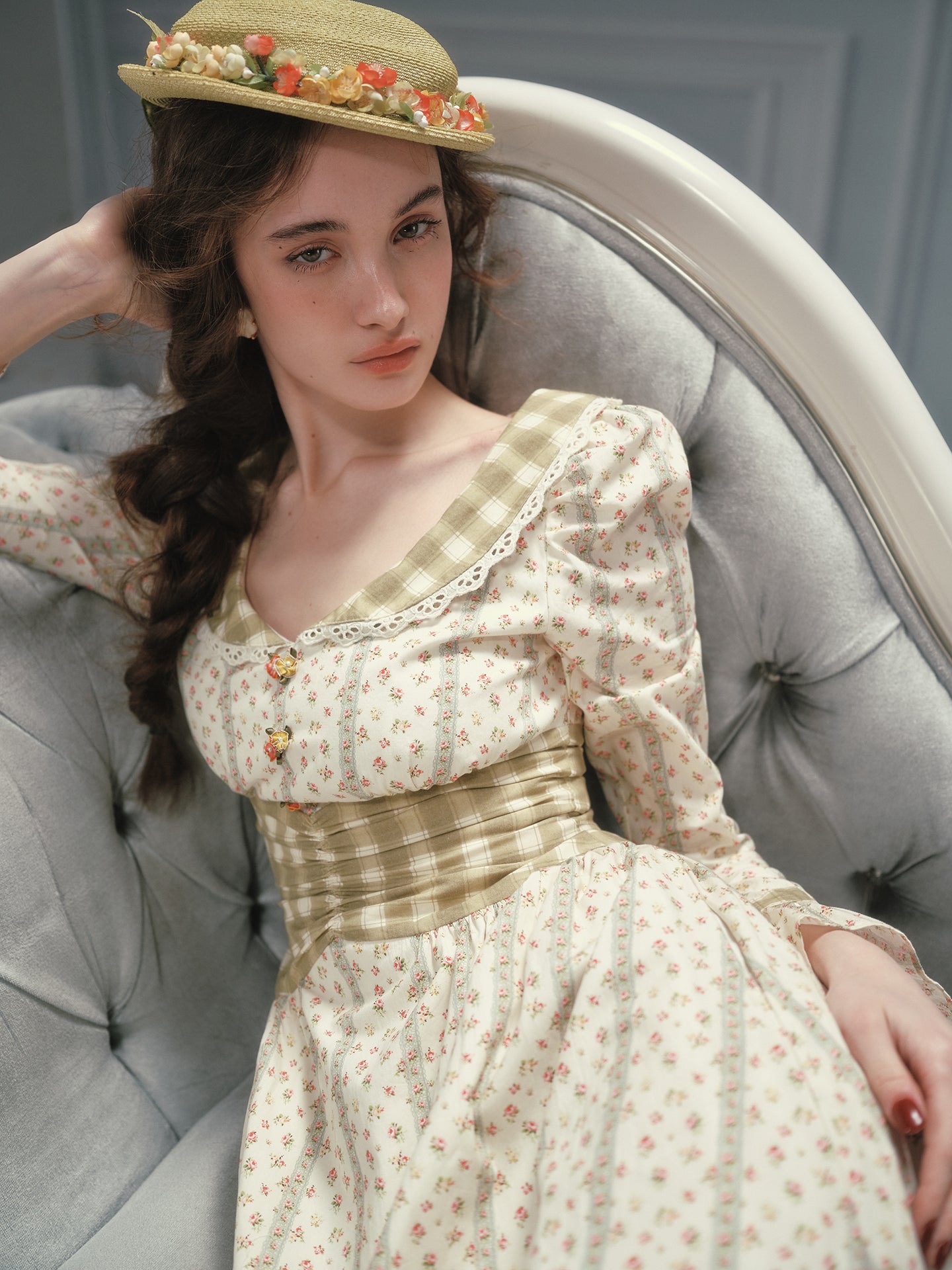 We framed the long sleeves with fluted cuffs and matching gingham trims, giving a gentle nod to cottagecore without feeling costume-y. A wide sash ties at the back (adjust it loose for brunch or snug for sunset strolls), while hidden pockets slip in at the side seams – practical magic we’ll always stand by.