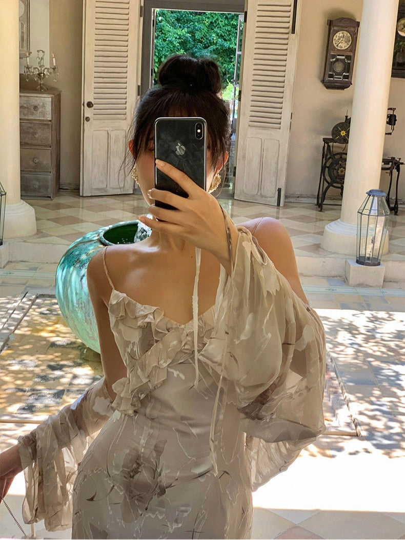 The fabric is light, gently sheer, and flows naturally with the body, tracing feminine lines with subtle elegance. Layered ruffles at the neckline and hem add romantic volume, while the slight fishtail flare brings soft movement and charm.