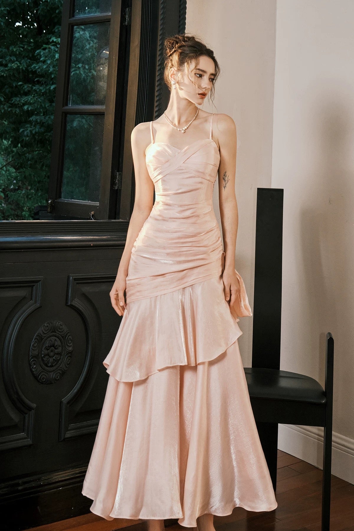 Its luminous fabric radiates enchanting tones, capturing and refracting light to create a stunning glow. The cascading layered hem drifts gracefully like petals, embodying ethereal beauty with every step.