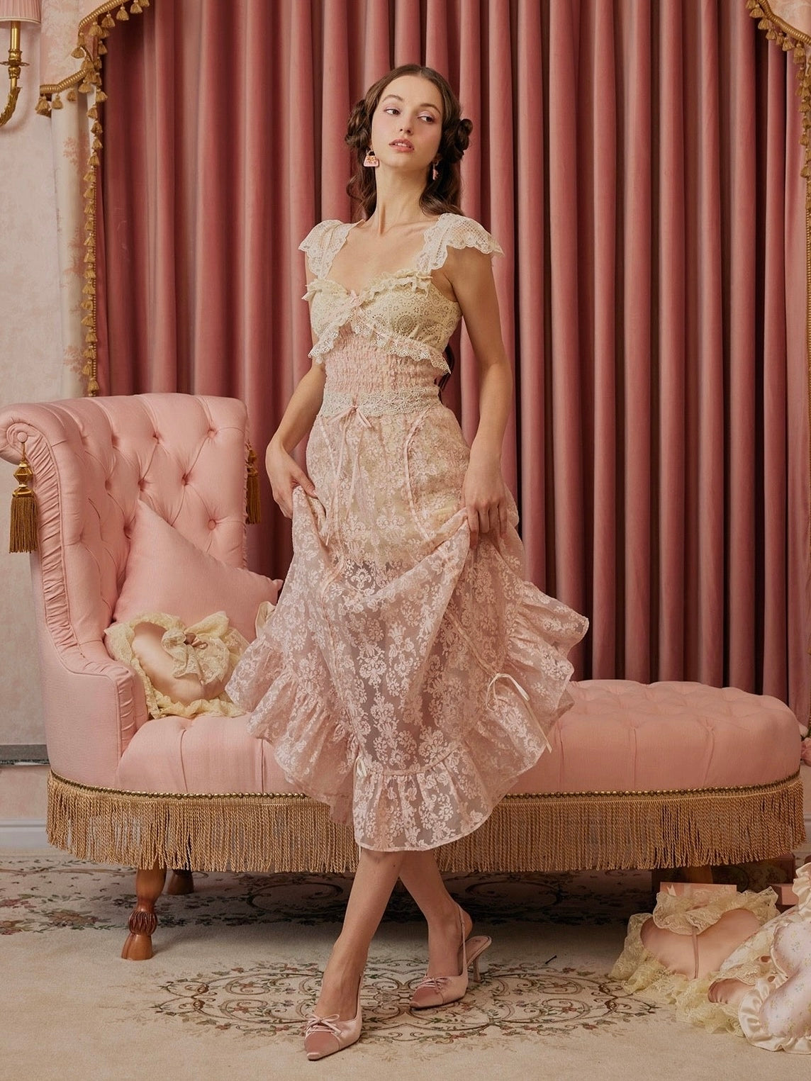This dress features a light and delicate hollow jacquard lace fabric adorned with rich, vintage-inspired patterns. The inner lining is crafted from a soft and breathable polyester-cotton blend, ensuring comfort throughout the day.