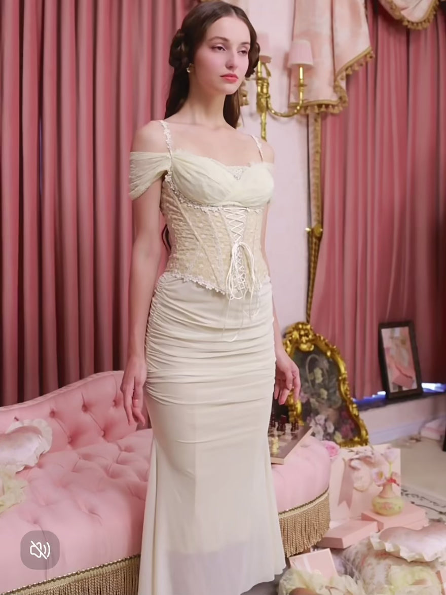 'Erlinia’ flows into a ruched mermaid skirt that elongates your frame and hugs just right, creating a naturally sleek silhouette. Finished with a custom-logo back zipper, the Erlinia is as wearable as it is dreamy.