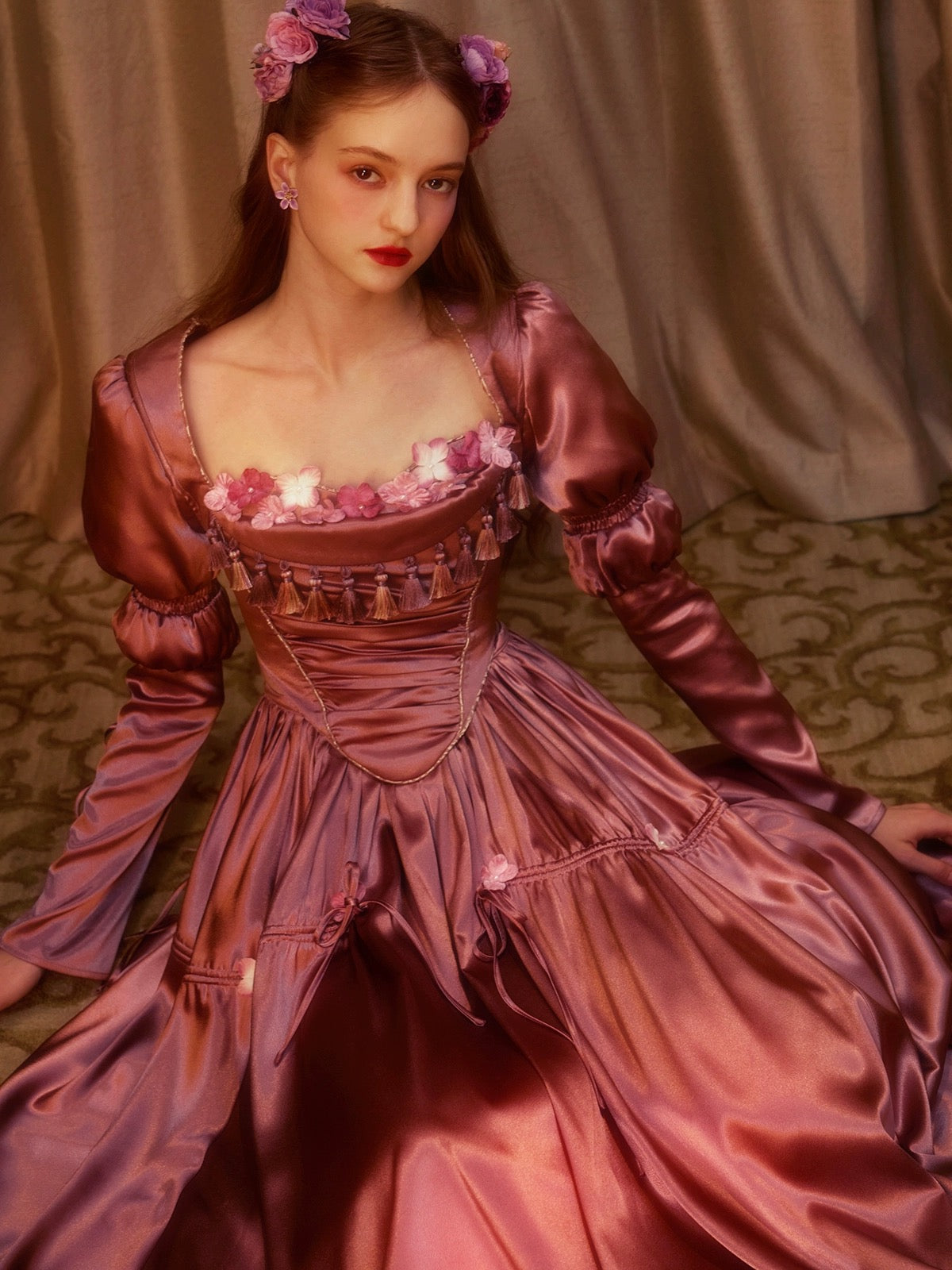 The high waist and wide hemline provide a slimming effect, while the voluminous, flouncy skirt adds a playful, girlish charm. The drawstring embellishment, adorned with three-dimensional flowers, enhances the rich layering and offers styling flexibility. The waistline is carefully tailored for a compact, feminine silhouette, and a discreet middle back zipper allows for effortless dressing.