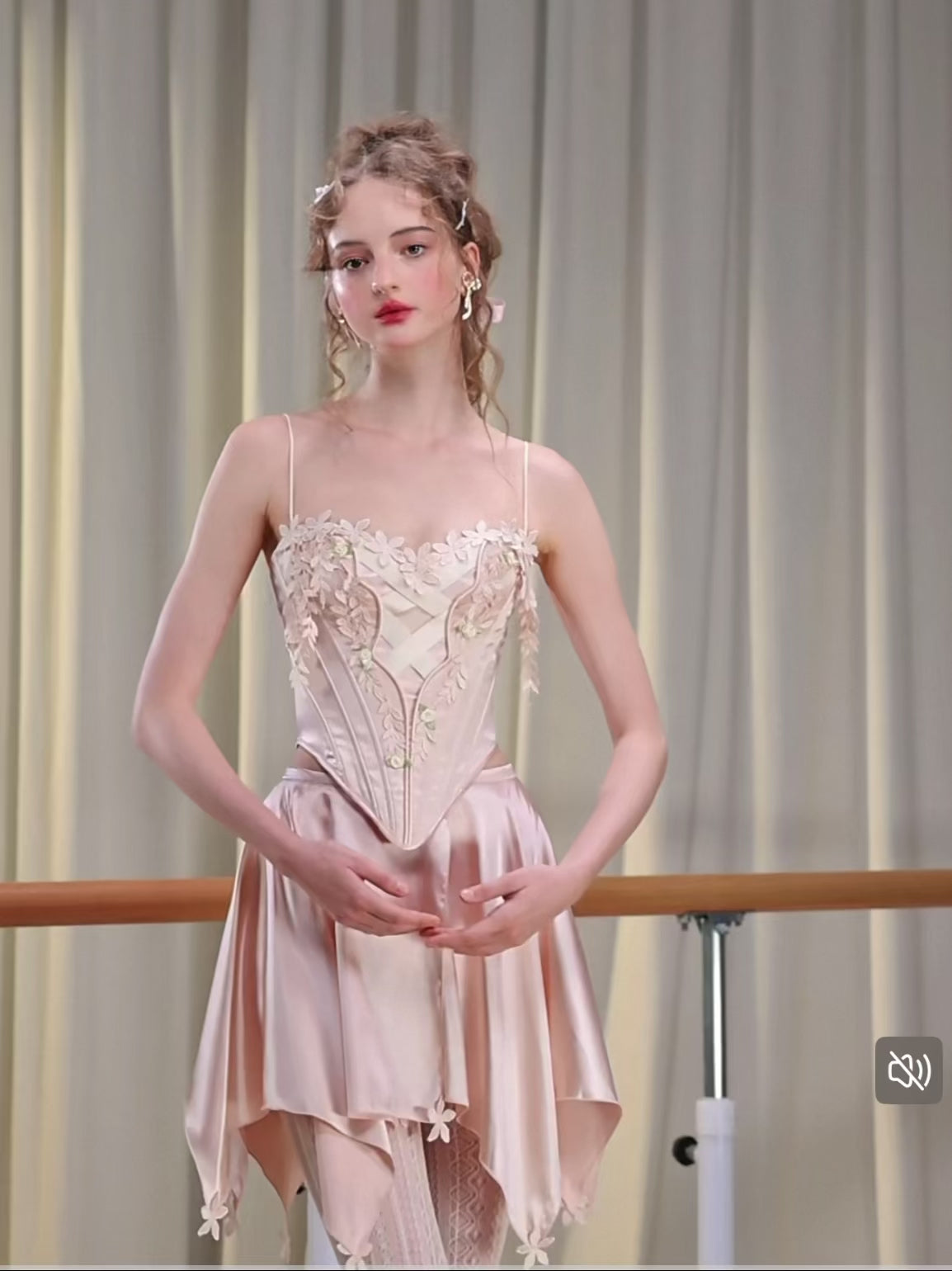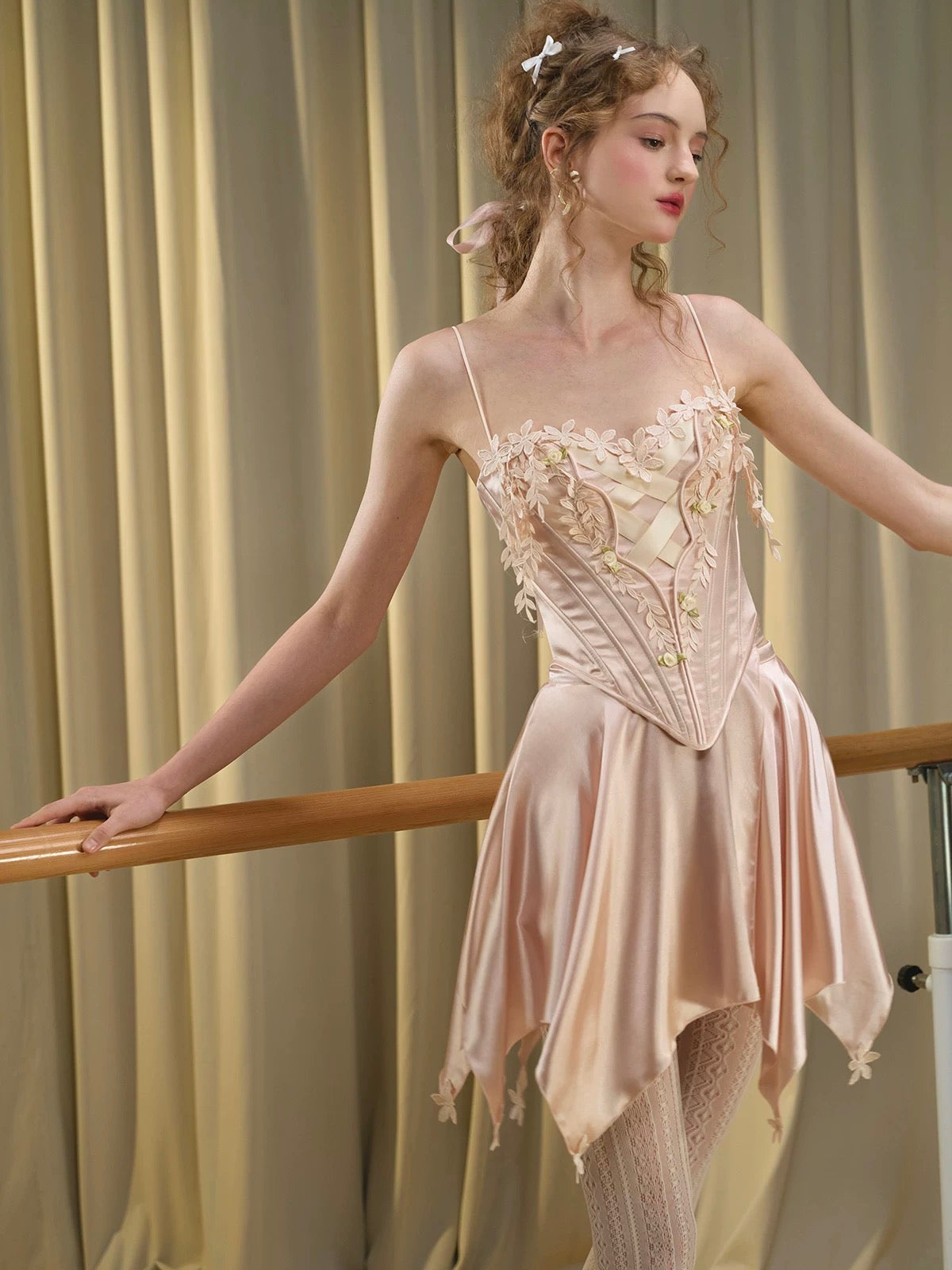 We chose a silky organza-like satin with a luminous sheen for both the corset and the skirt—airy and graceful without losing its luxurious edge. Inside, a soft, stretchy knit lining ensures the fit stays comfortable, close to the skin, and easy to wear.