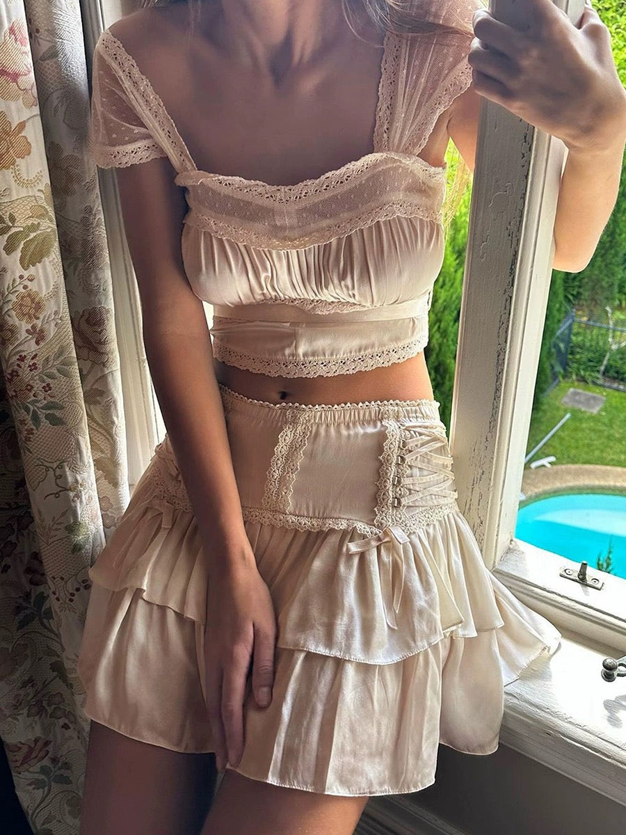 The matching high-waisted skirt continues the romantic aesthetic with its tiered ruffle design and side lace-up detailing that allows for a customizable fit. Intricate lacework borders each tier, adding texture and dimension to this ethereal set. The side tie closure isn't just practical—it's an eye-catching design element that adds character to this versatile piece.