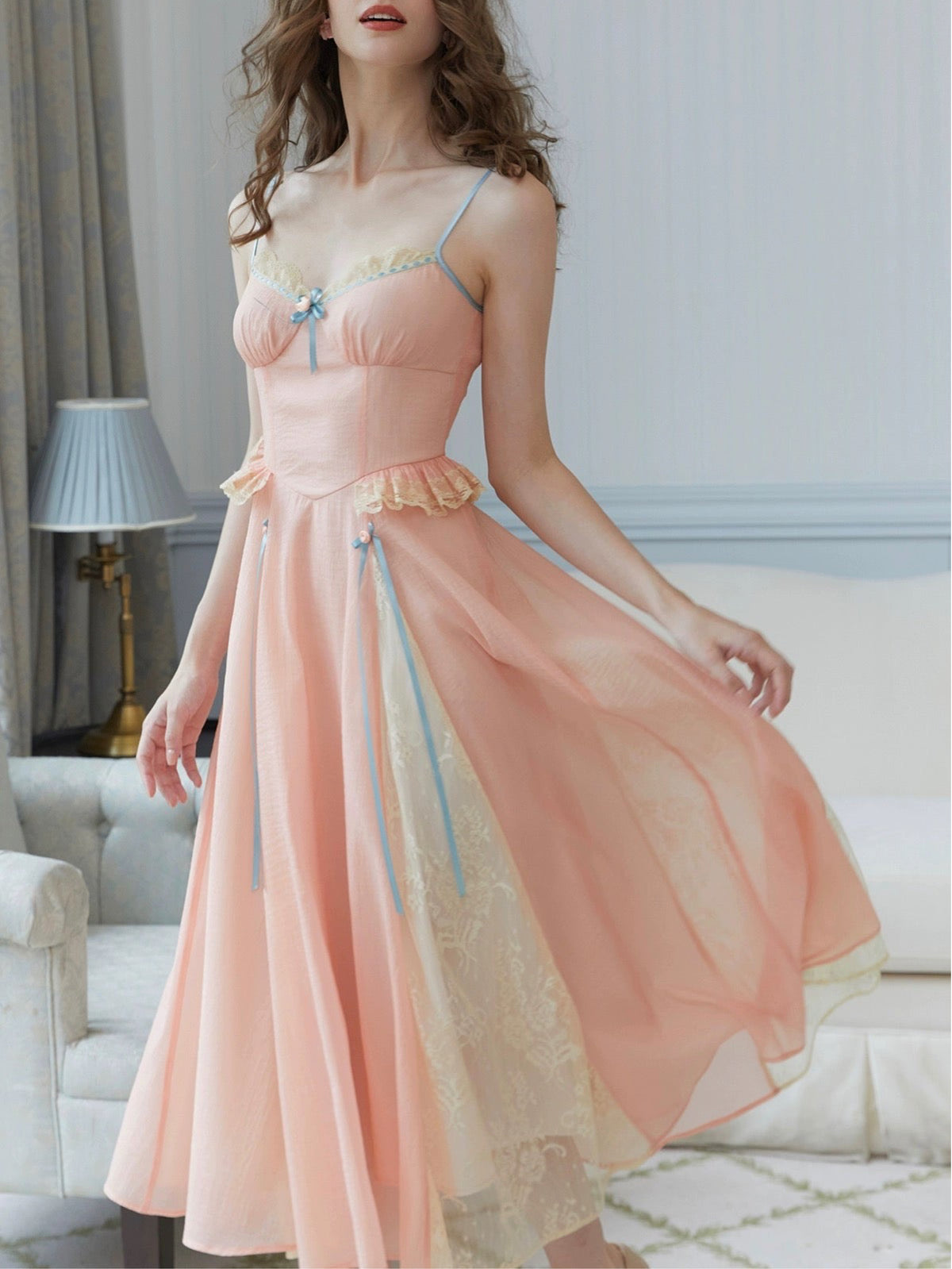Made from lightweight textured fabric that feels as gentle as it looks, ‘Sylph’ combines soft structure with dreamy details. The neckline and waist are trimmed with mixed lace to add depth and dimension, while the hem features custom-dyed panels for a floaty finish.