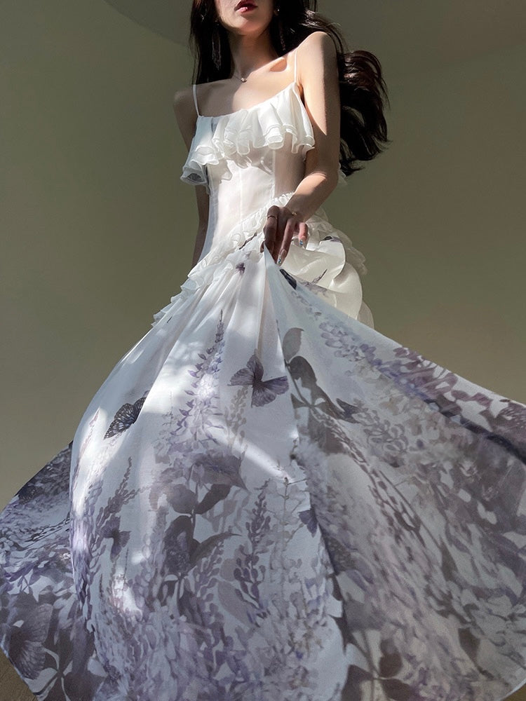From the hem up, the signature print paints a winding path of purple wisteria, as butterflies flutter romantically across the surface. With a softly sculpted silhouette, vertical seams, and triple-line waist detail, the ‘Yulanda’ flatters without ever feeling tight. Double-layered ruffles at the waist add movement and charm, while adjustable straps let you choose your perfect fit — comfort meets beauty.