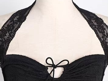 Crafted with sheer jacquard lace that drapes like a soft veil, the halter neckline gently hugs the shoulders and transitions into a vintage-inspired Betty collar—elegantly contouring the chest and offering a flattering curve that holds structure with ease.